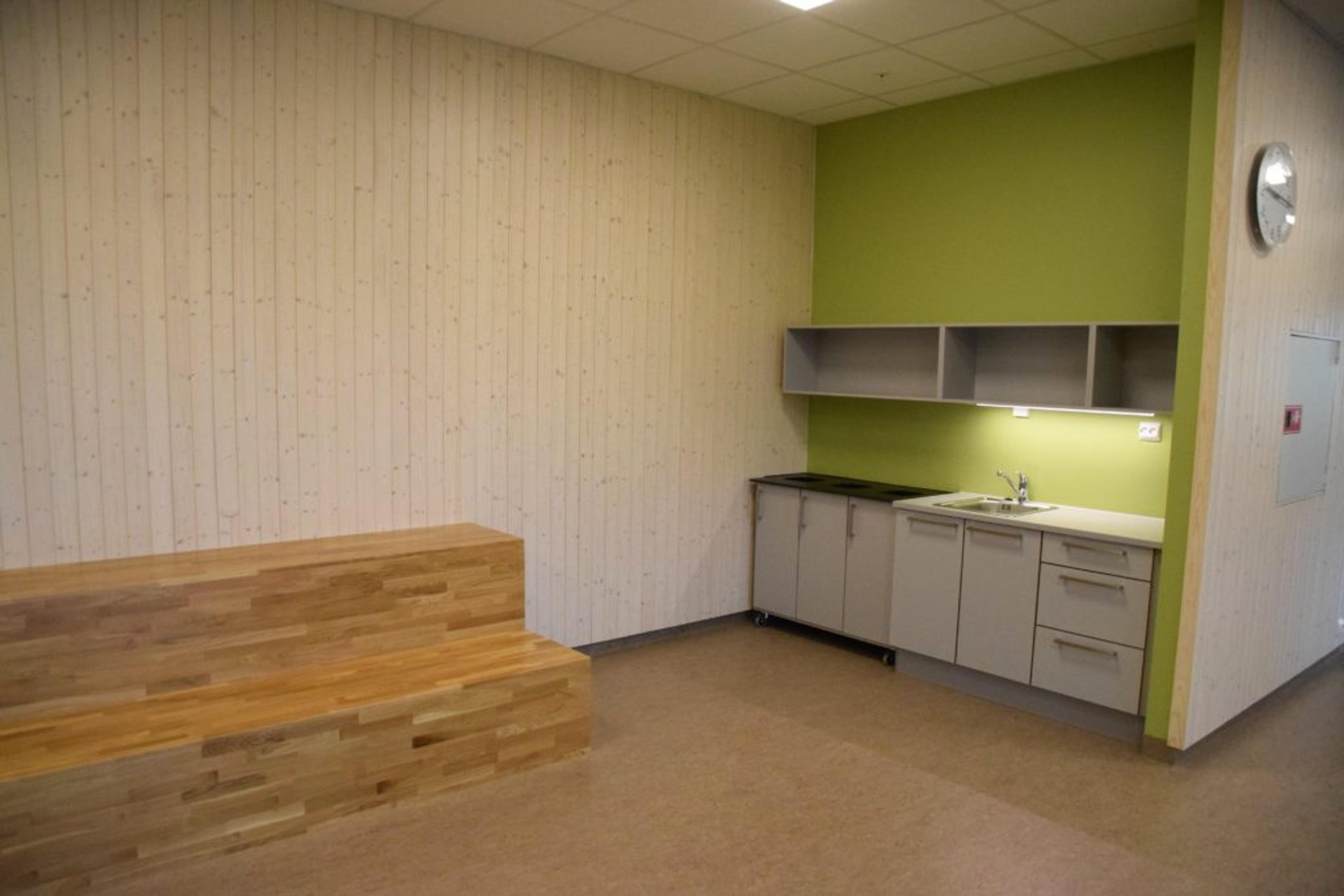 MØTEPLASS: Hvert av de tre trinna har hvert sitt «trinntorg» utenfor klasserommene, med en liten kjøkkenkrok, benker, toaletter og god plass til å henge sammen. Foto: Stian Ormestad.
