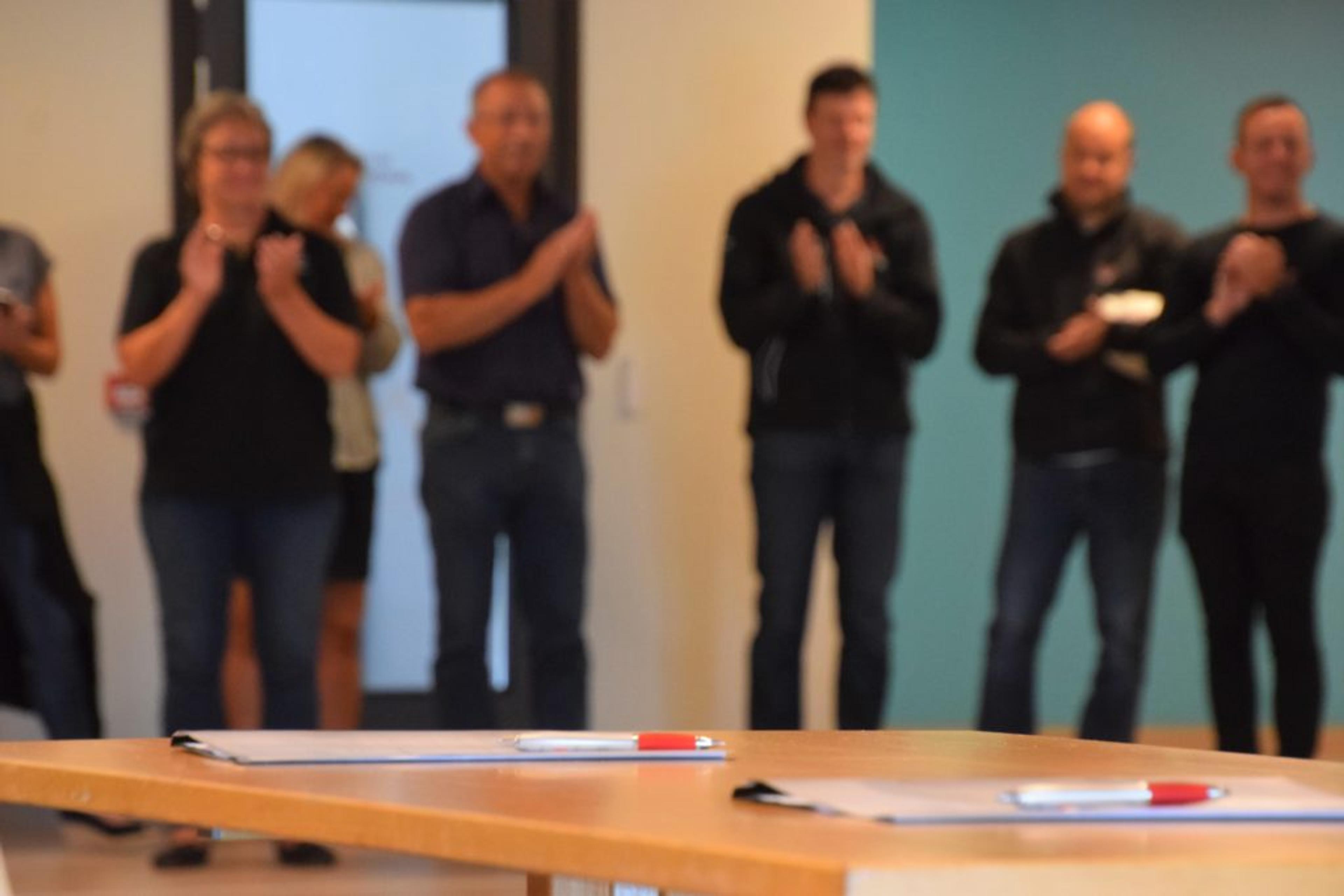 UNDERSKREVET OG OVERLEVERT: Til applaus er skolebygget nå overlevert til oppdragsgiver Re kommune innenfor både tidsfrister og kostnadsrammer. Foto: Stian Ormestad.