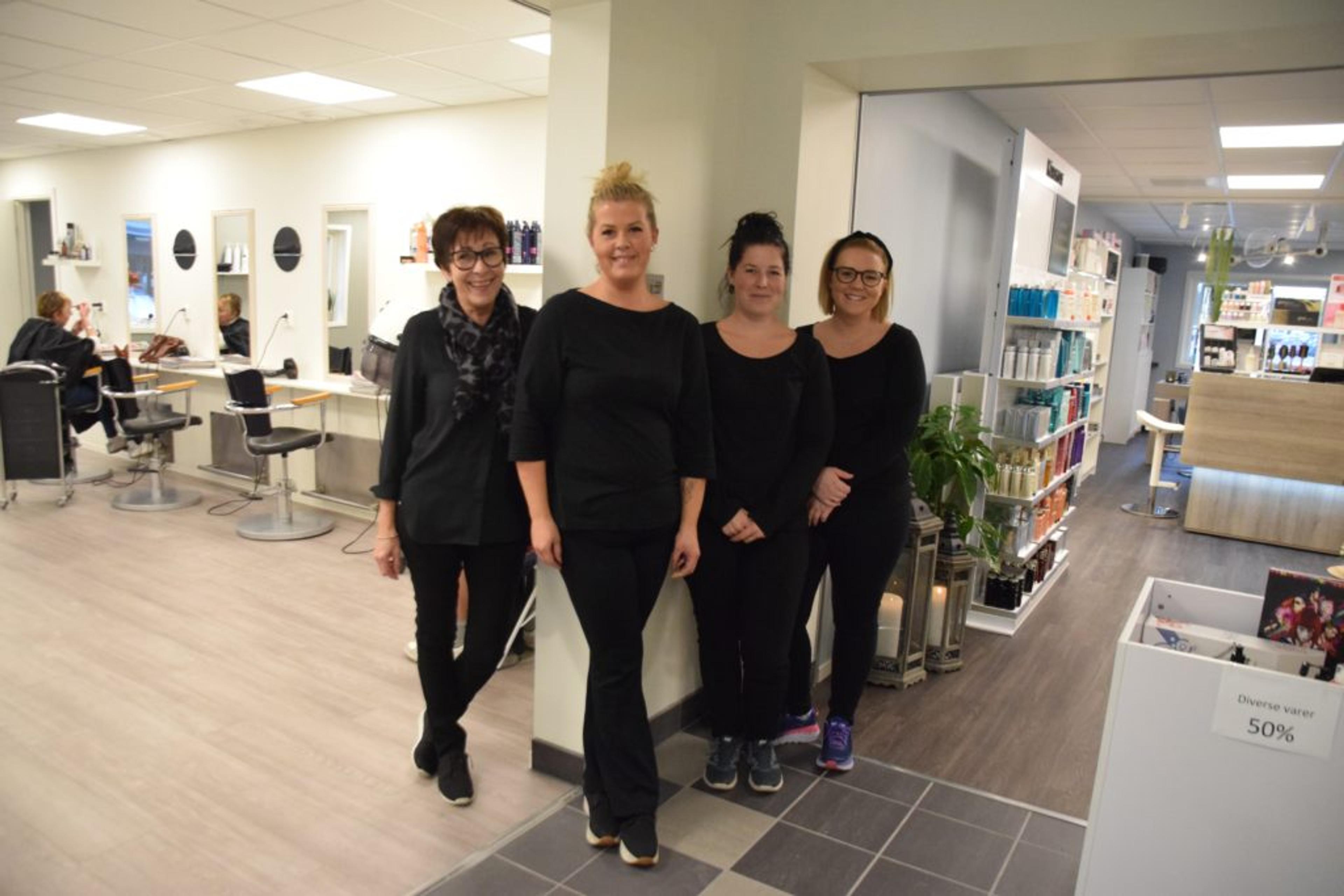 FRISØRHJØRNET: Den ene frisøren har flytta opp fra kjelleren, den andre inn på senteret. Nå driver de bedre butikk begge to, vegg-i-vegg på Re-torvet, både Torild Frydenberg, Revetal dame- og herrefrisør, og Anne Merete Erdal, Re hårstudio, som også har med seg sine to ansatte Linn Cherie Andersen og Martine Sommerstad. Foto: Stian Ormestad.
