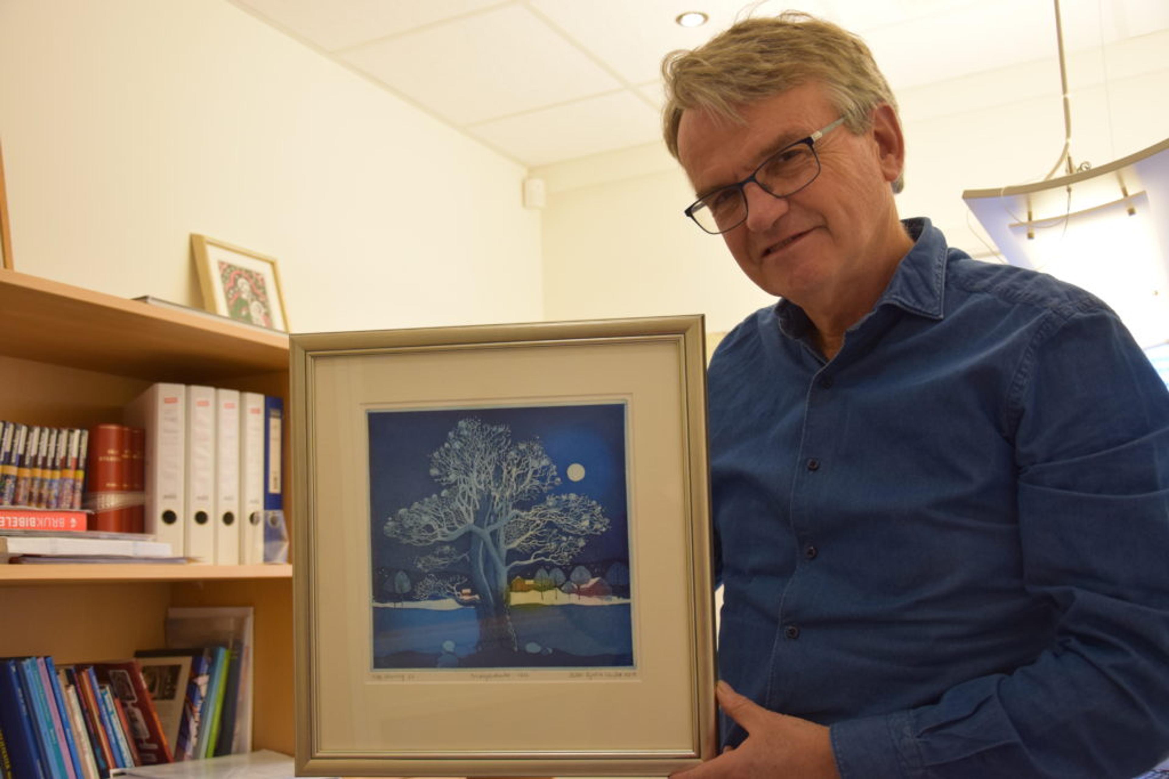 NYE KIRKETEKSTILER: Sogneprest Jon Geir Dittmann viser fram et av Hilde Fystro Vasbøs grafiske blad, som selges til inntekt til nye litturgiske kirkeplagg i Våle kirke. Foto: Håkon Westby.