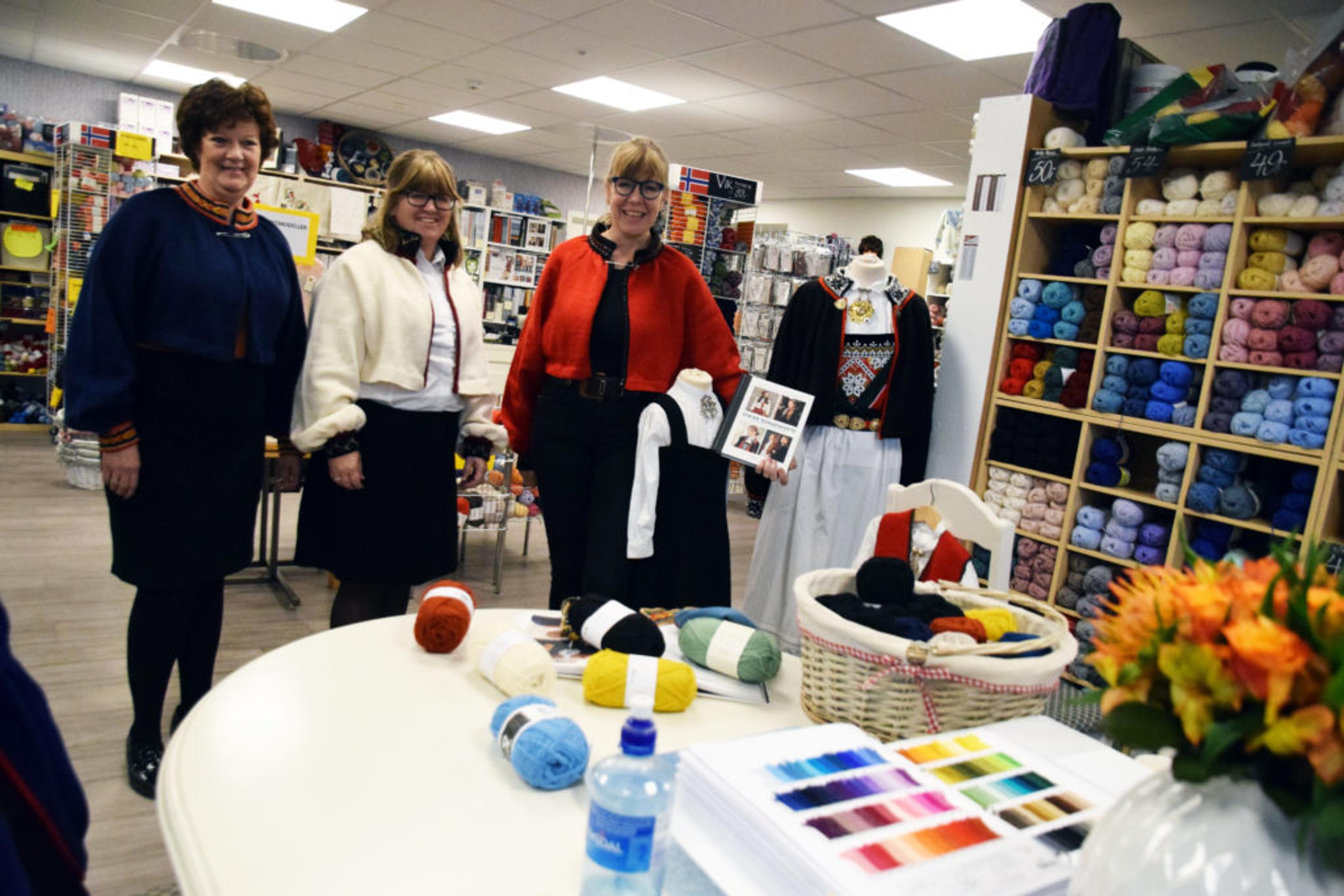 STRIKKE-TRIO: Garnbunten-innehaver Gro Frydenberg, Garnbunten-medarbeider Britt Torild Sparre Knudsen, og Garnbunten-besøkende forfatter og designer Merete Norheim Myrdahl. Foto: Stian Ormestad.