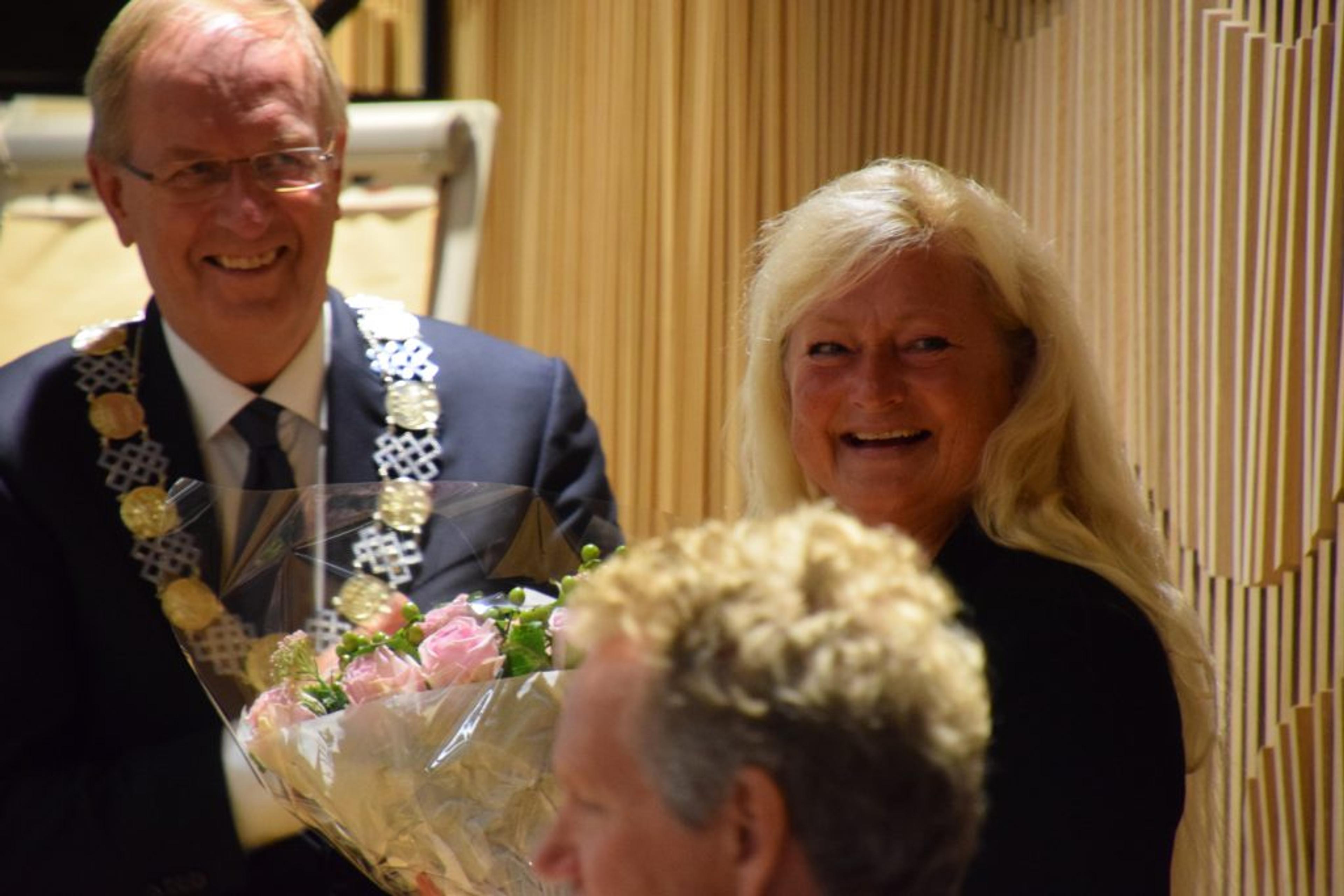 BLOMSTER: Den avtroppende ordføreren i gamle Tønsberg ønsker den påtroppende ordføreren i nye Tønsberg lykke til. Foto: Stian Ormestad.