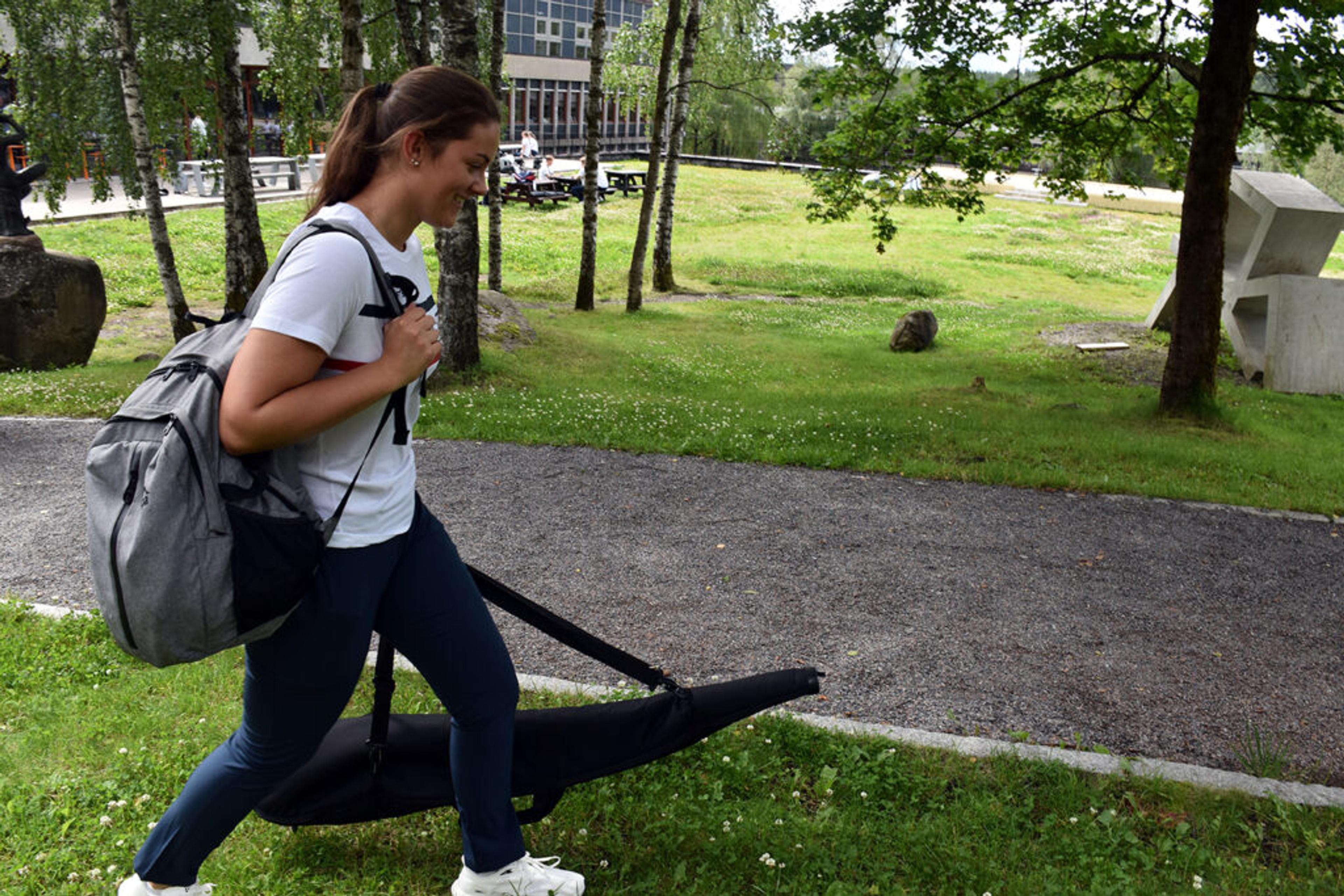 SISTE OL-FINALE: Jeanette Hegg Duestad (25) er i gang med finalen sin tredje og siste øvelse i Paris-OL. Bildet er tatt under pressetreffet på Olympiatoppen før avreise til Paris. Foto: Stian Ormestad, ReAvisa.