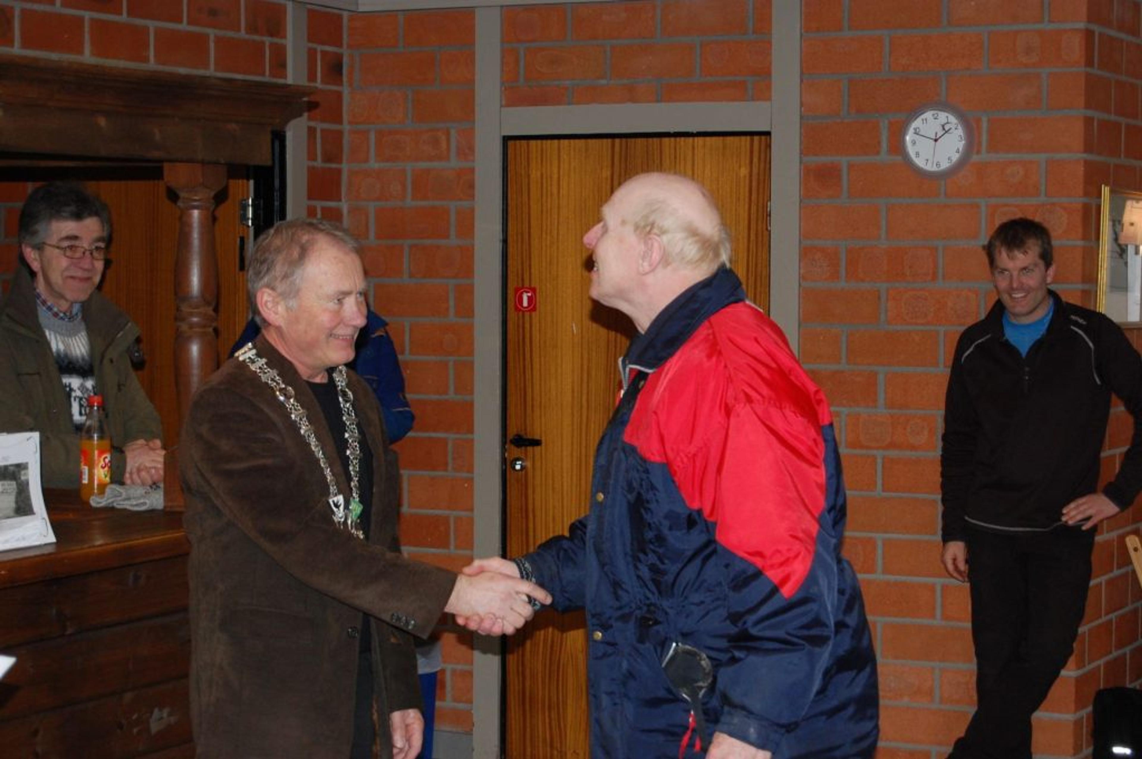 OLE KRISTIAN OG ORDFØREREN: Ole Kristian får premie av daværende ordfører i gamle Re kommune Thorvald Hillestad under Det lille ridderrennet i Vivestad. Foto: Håkon Westby.