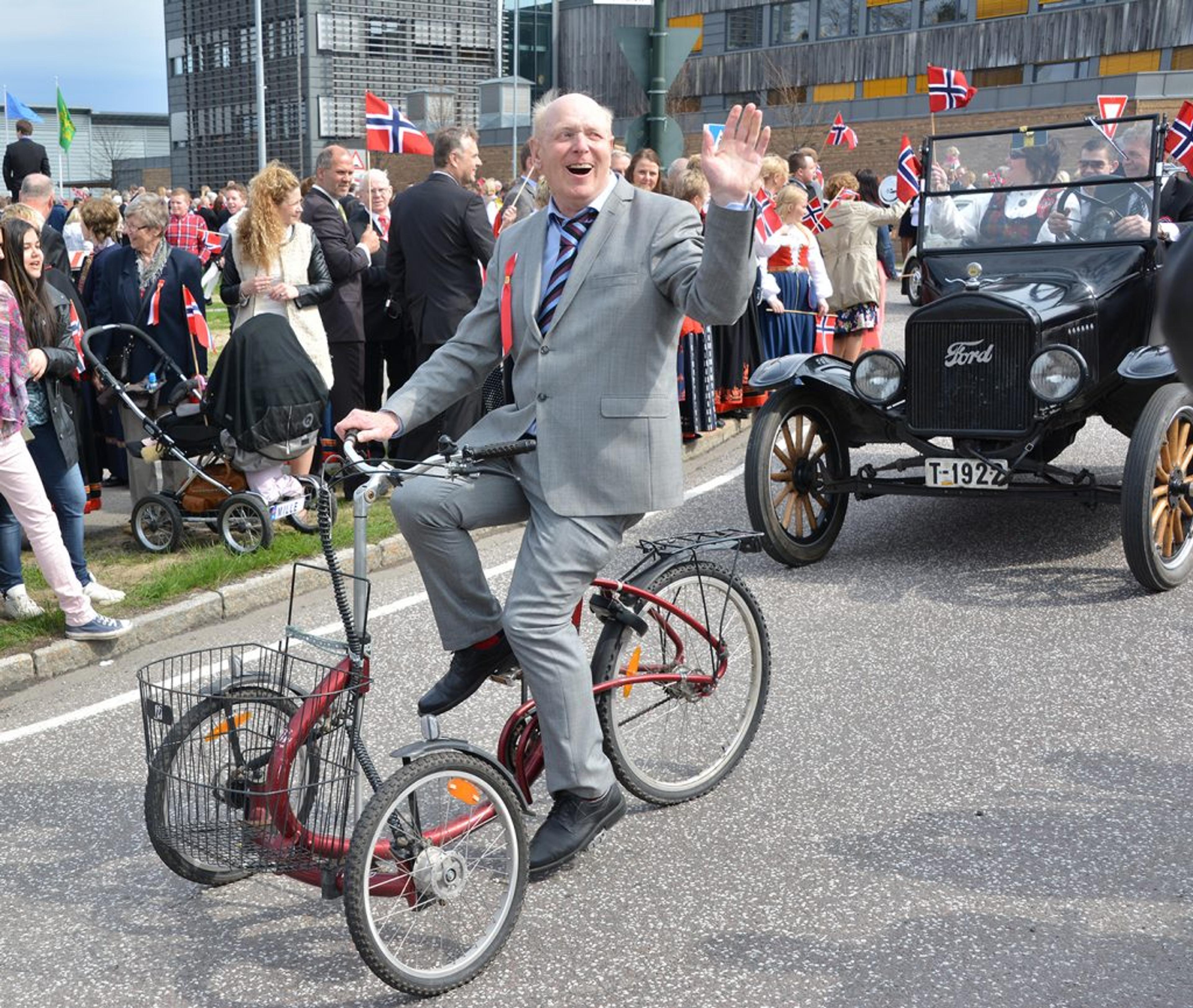 I FARTA: Ole Kristian Egge på sykkelen sin, her i 17. mai-toget på Revetal for noen år siden. Foto: Stian Ormestad.