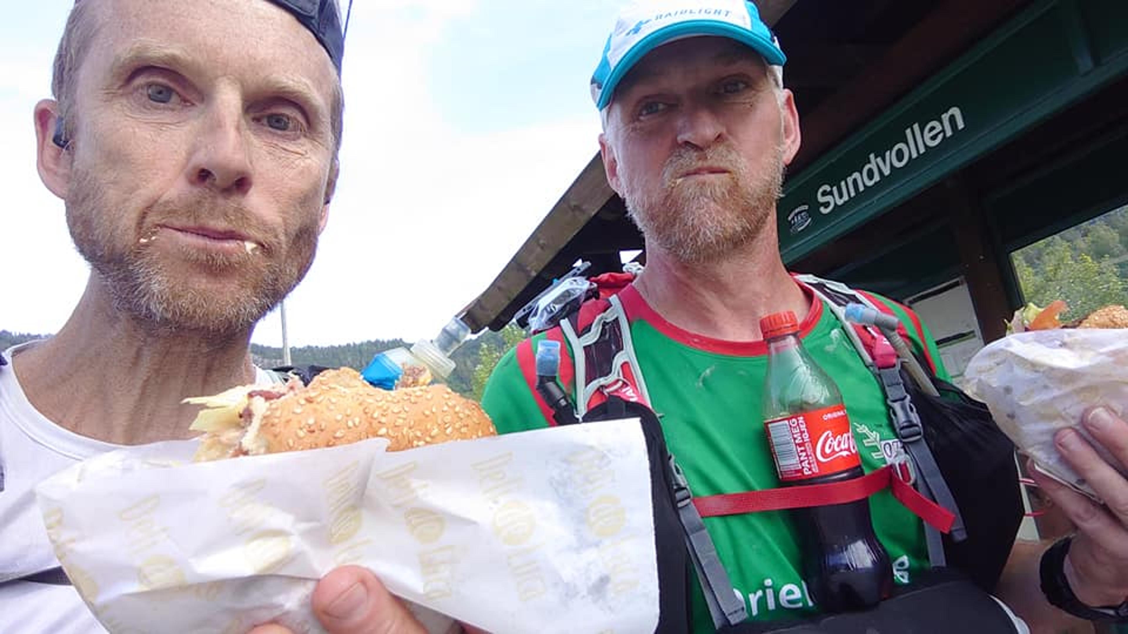 UTEN MAT OG DRIKKE….: Hiver innpå en feit og deilig burger på Sundvollen. Foto: Privat.