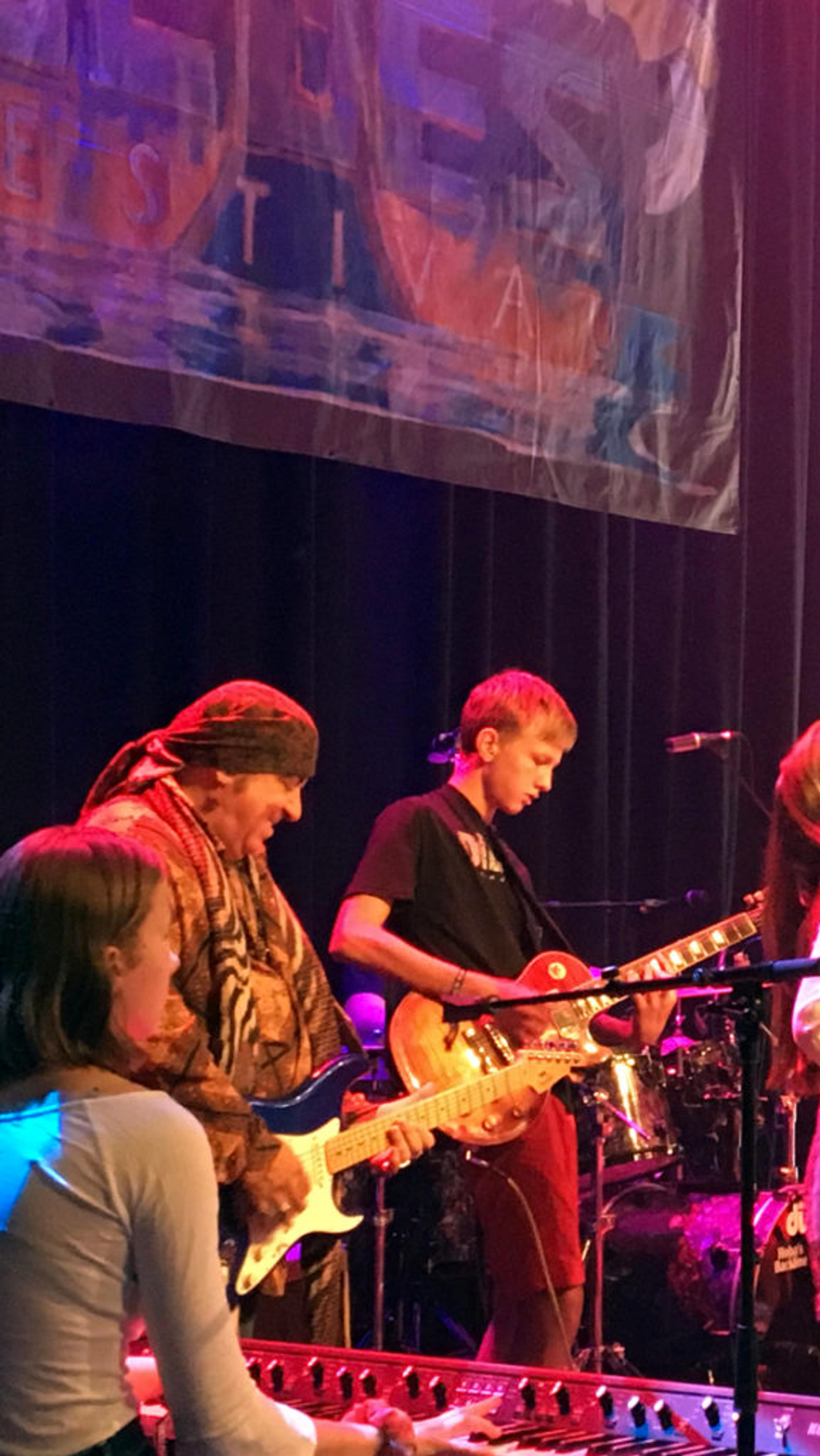 JAMMER MED HELTEN: Little Steven, kjent som gitaristen til Bruce Springsteen og skuespilleren fra Lillyhammer, sammen med Otto Lagarhus junior (13) på scenen under årets Notodden bluesfestival. Foto: Privat.