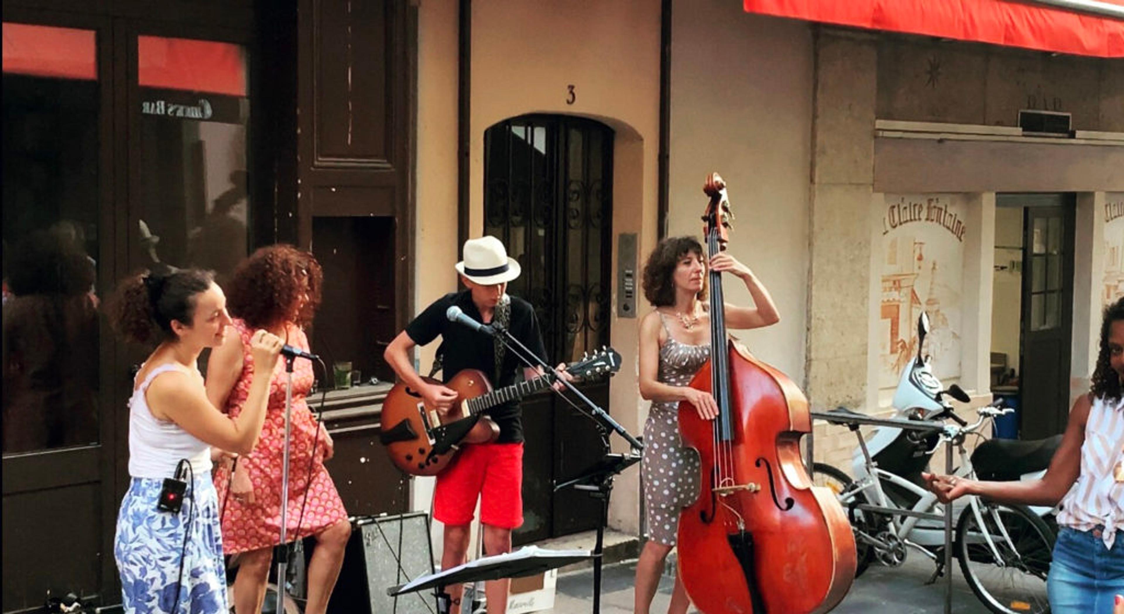 JAMMER PÅ GATA I NICE: Også familieferien i Frankrike ble prega av Ottos lidenskap for gitarspilling. Her rocker Otto sammen med gatemusikanter i Nice. Foto: Privat.