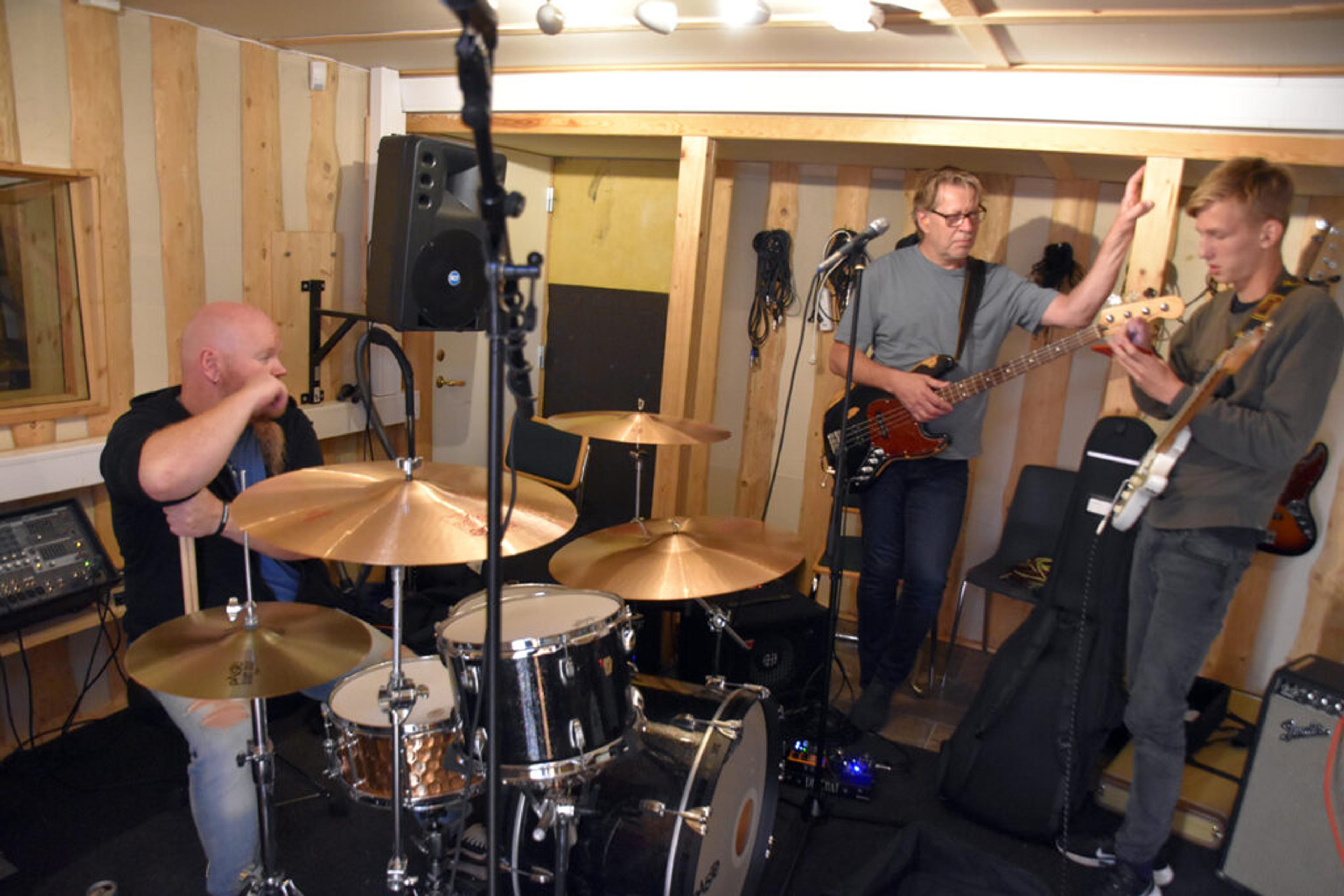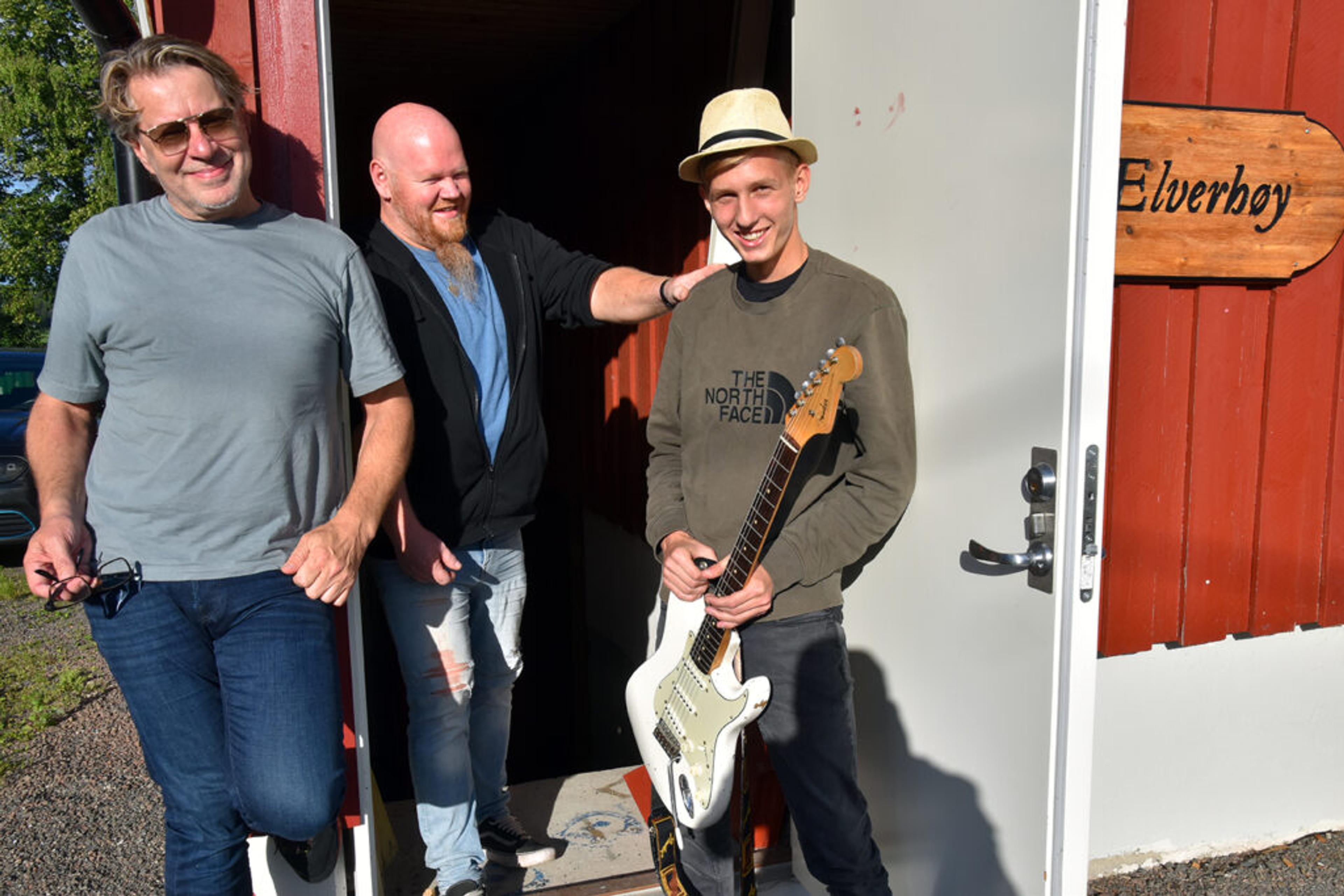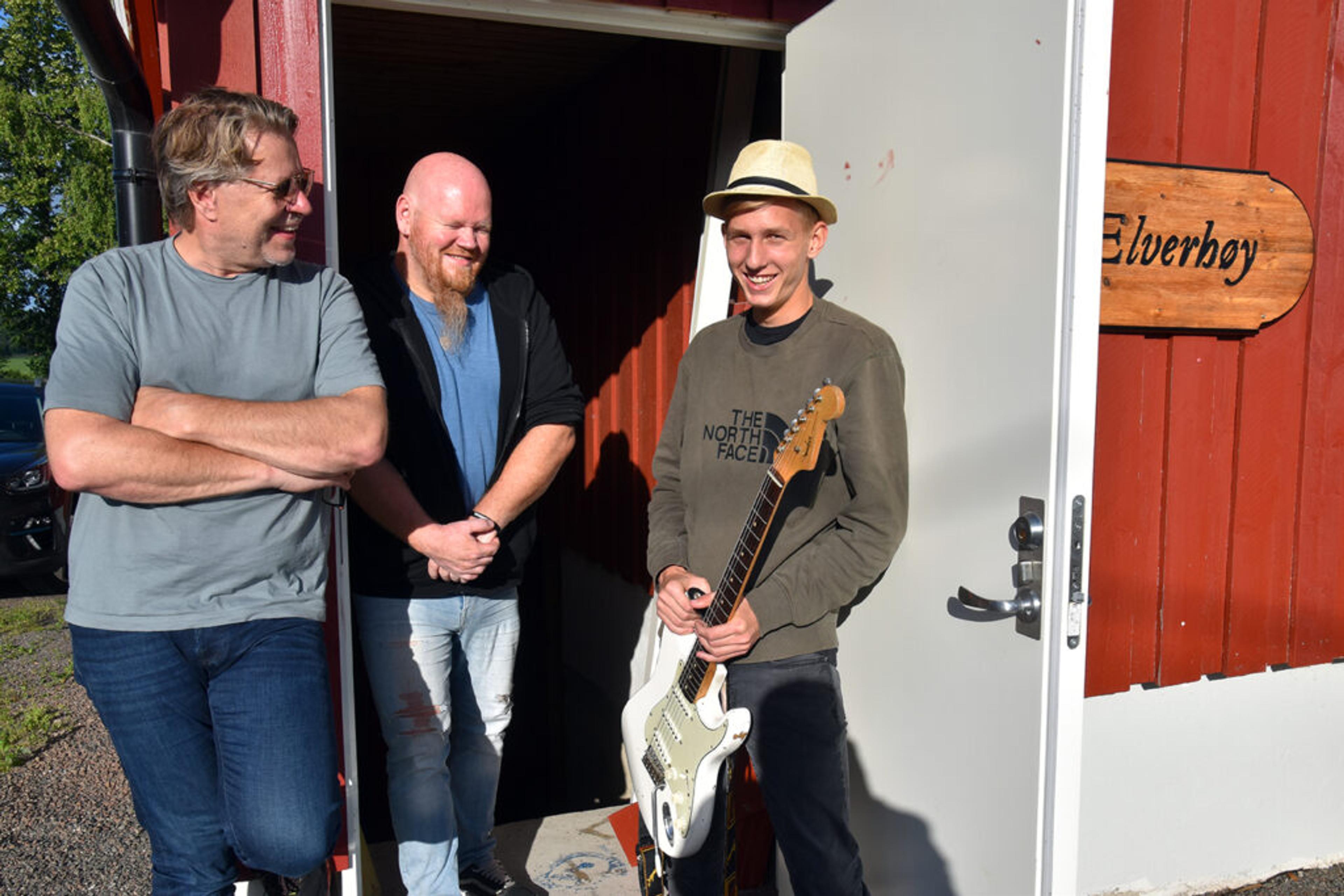 OTTO JUNIOR TRIO: Tom Arne Fossheim (48) og Bjørn Thomassen (57) har tatt Otto Lagarhus junior (16) under sine velmeritterte musikalske vinger. Nå øver de til konsert på Fysen kro i Hof lørdag 13. august 2022. Foto: Stian Ormestad.