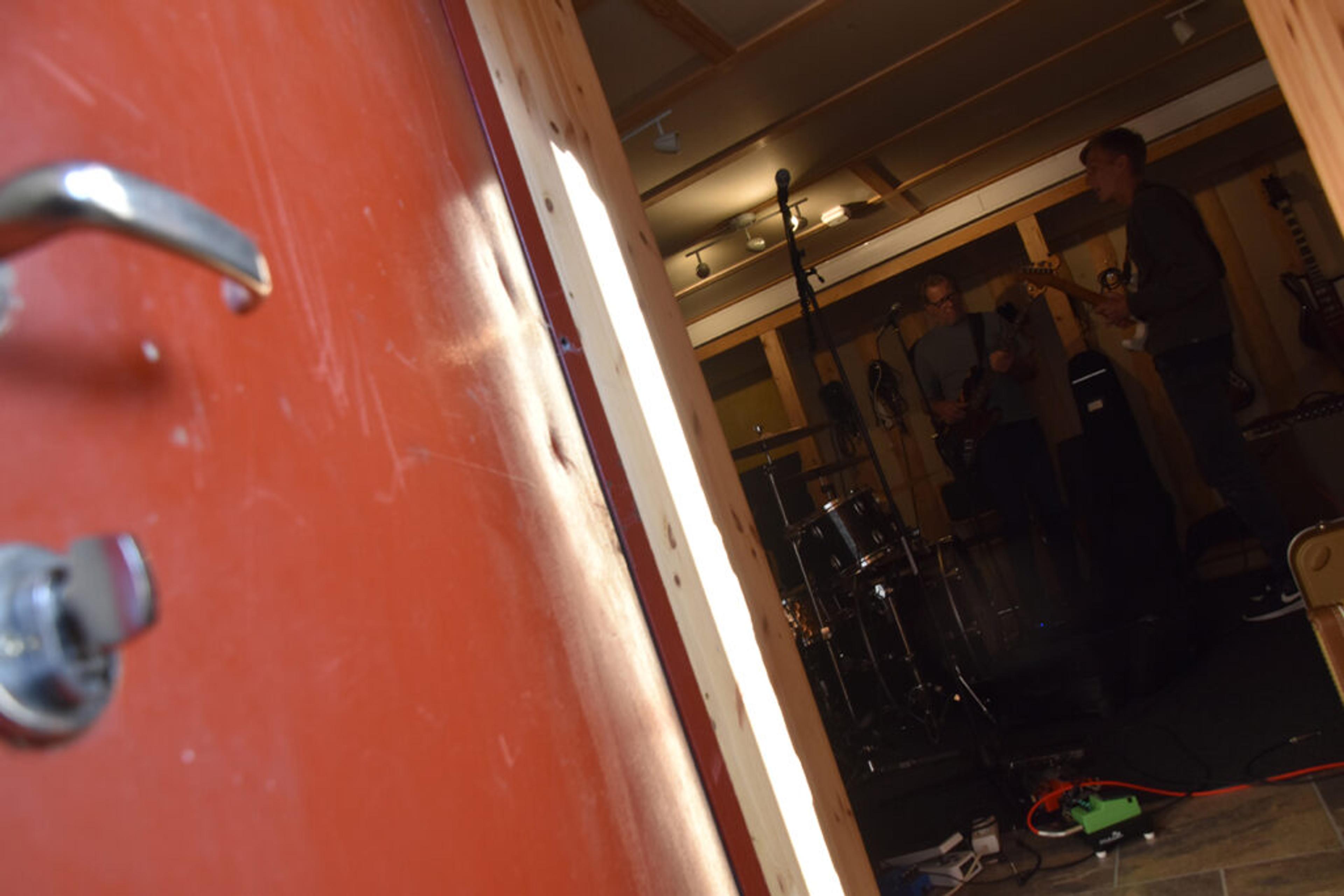 MUSIKALSKE MIRAKLER: Bak denne gamle døra inn til Elverhøy-kjelleren skjer det musikalske mirakler, det kan lokalavisa skrive under på som fikk høre noen smakebiter fra repertoaret. Foto: Stian Ormestad.
