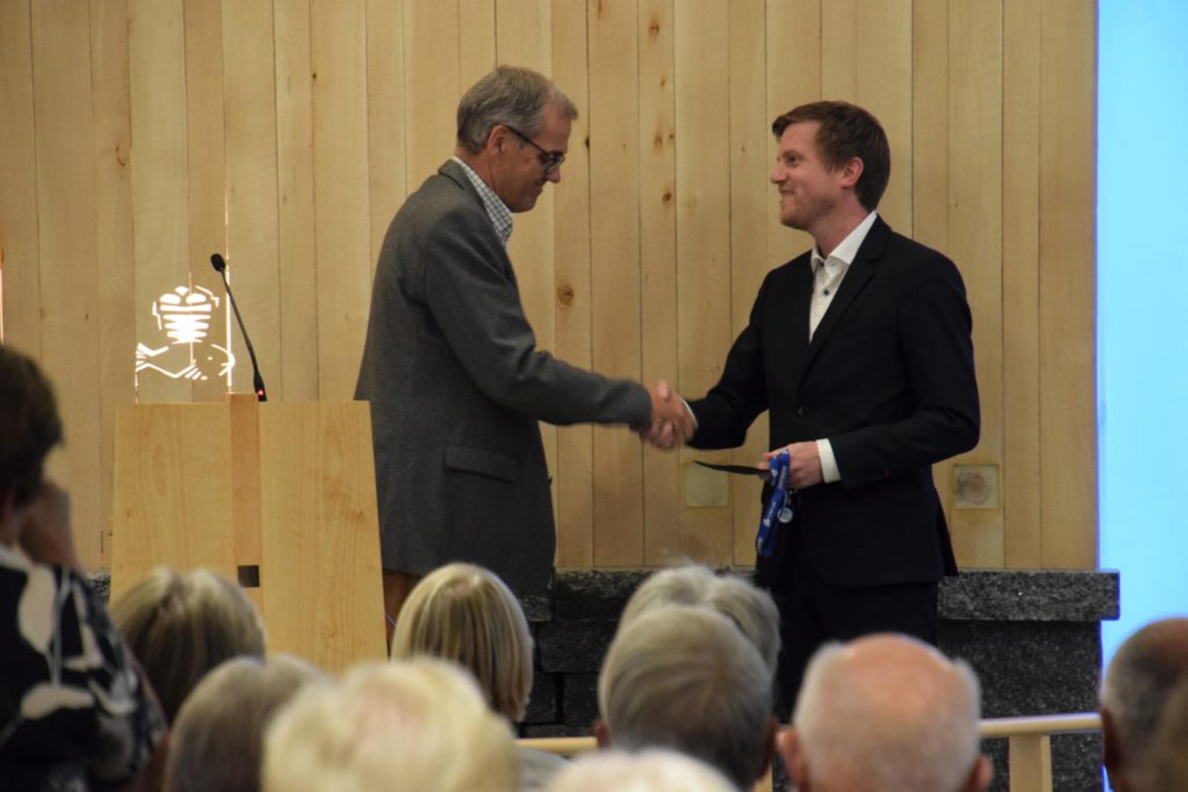 OVERREKKELSE: Leder av byggekomiteen Hans Kristian Heum overrekker nøkkelen høytidelig til Bjerkely-rektor Mathias Døvik. Foto: Stian Ormestad.