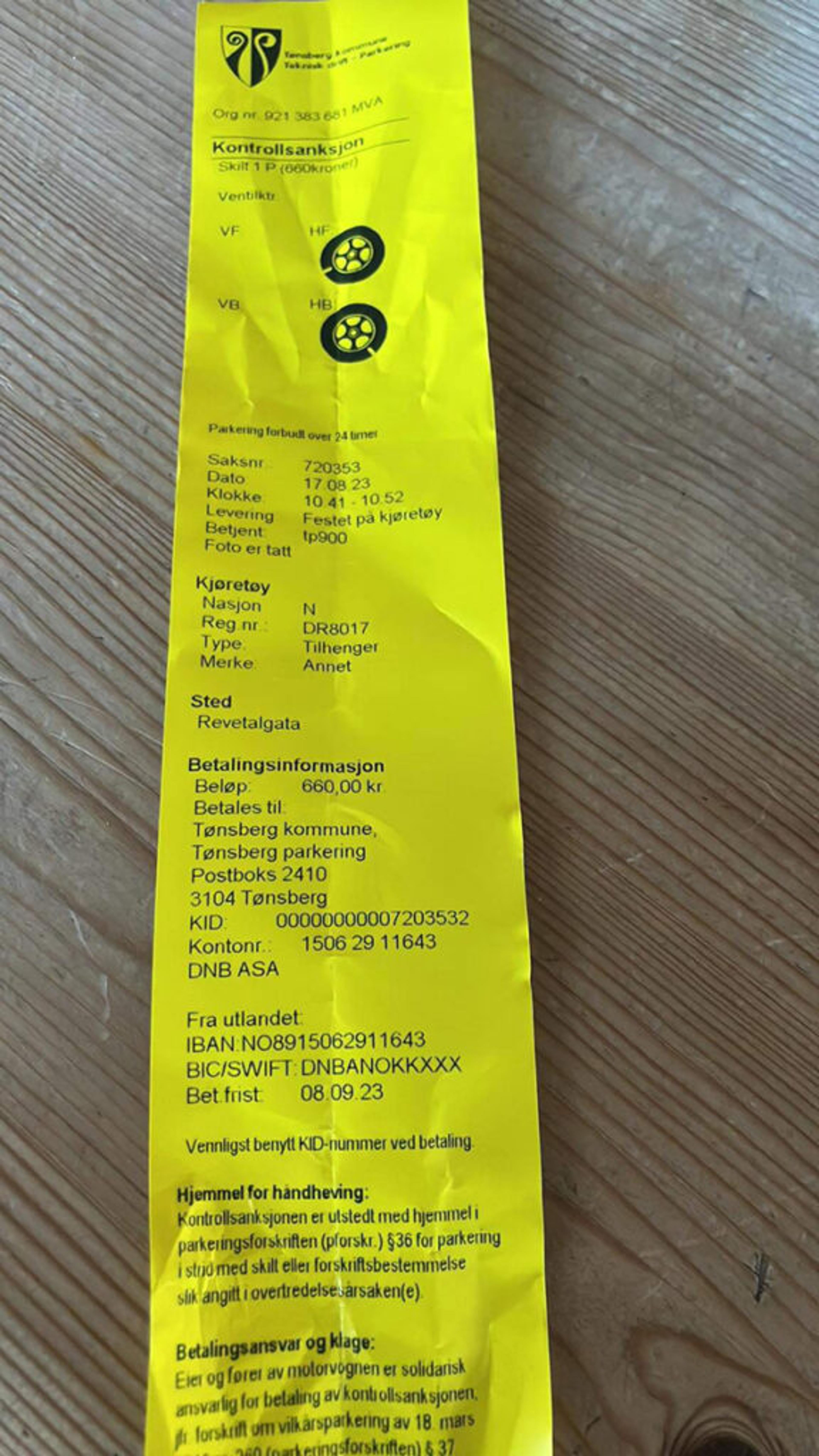 – Vi bruker ikke denne hengeren hver dag eller hver uke, kanskje ikke hver måned heller, så det er ikke så rart at ingen hadde fått med seg verken skilting eller bot, forklarte Terje til Tønsberg parkering.