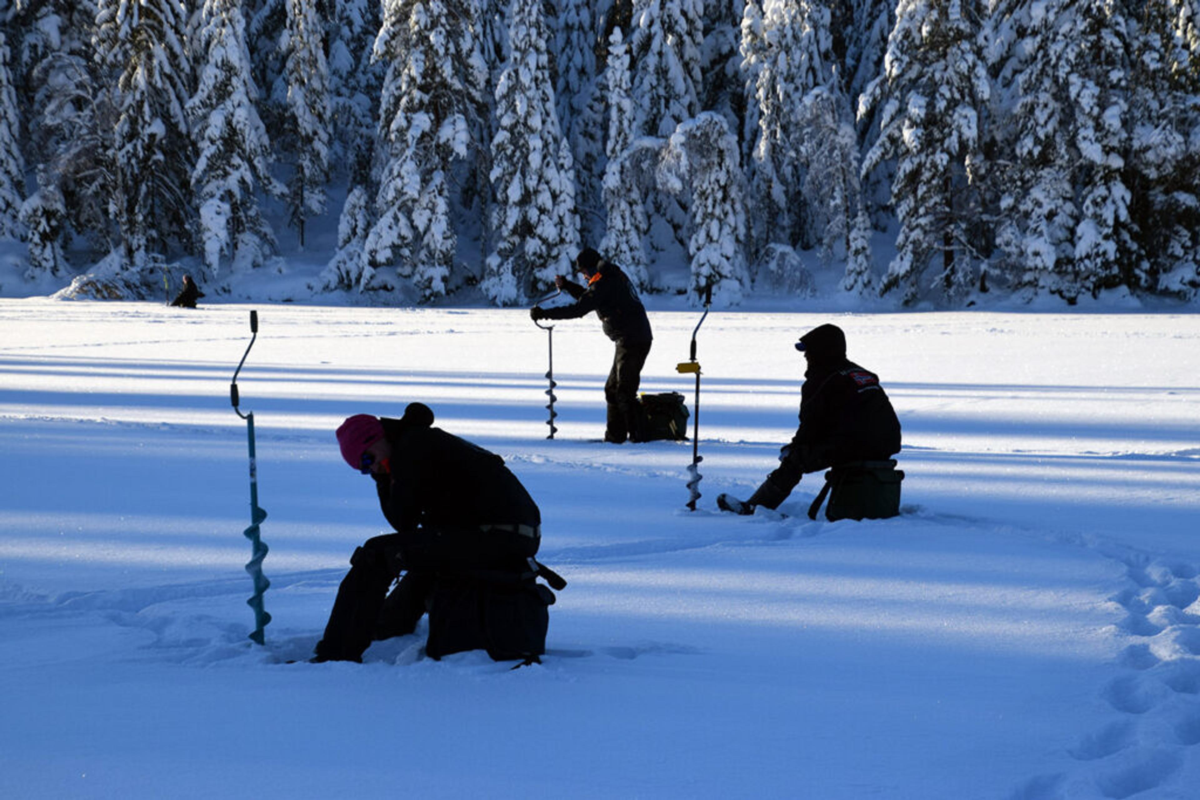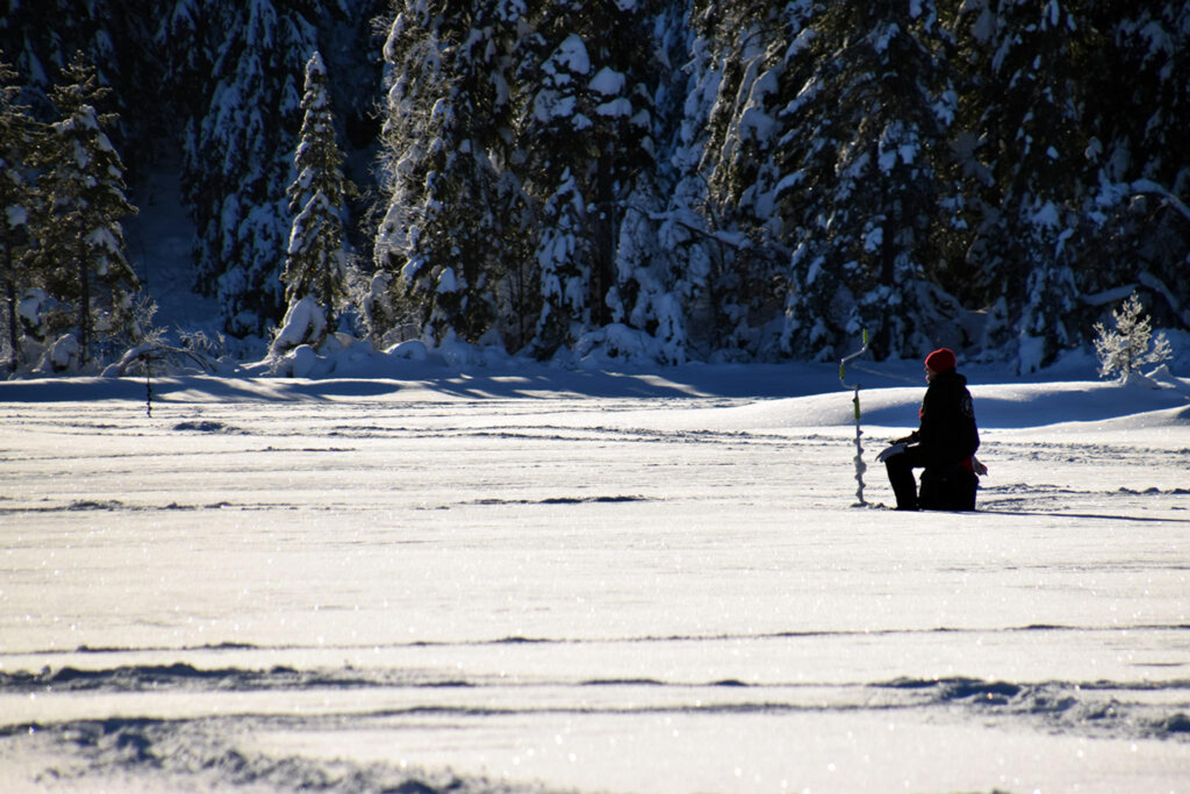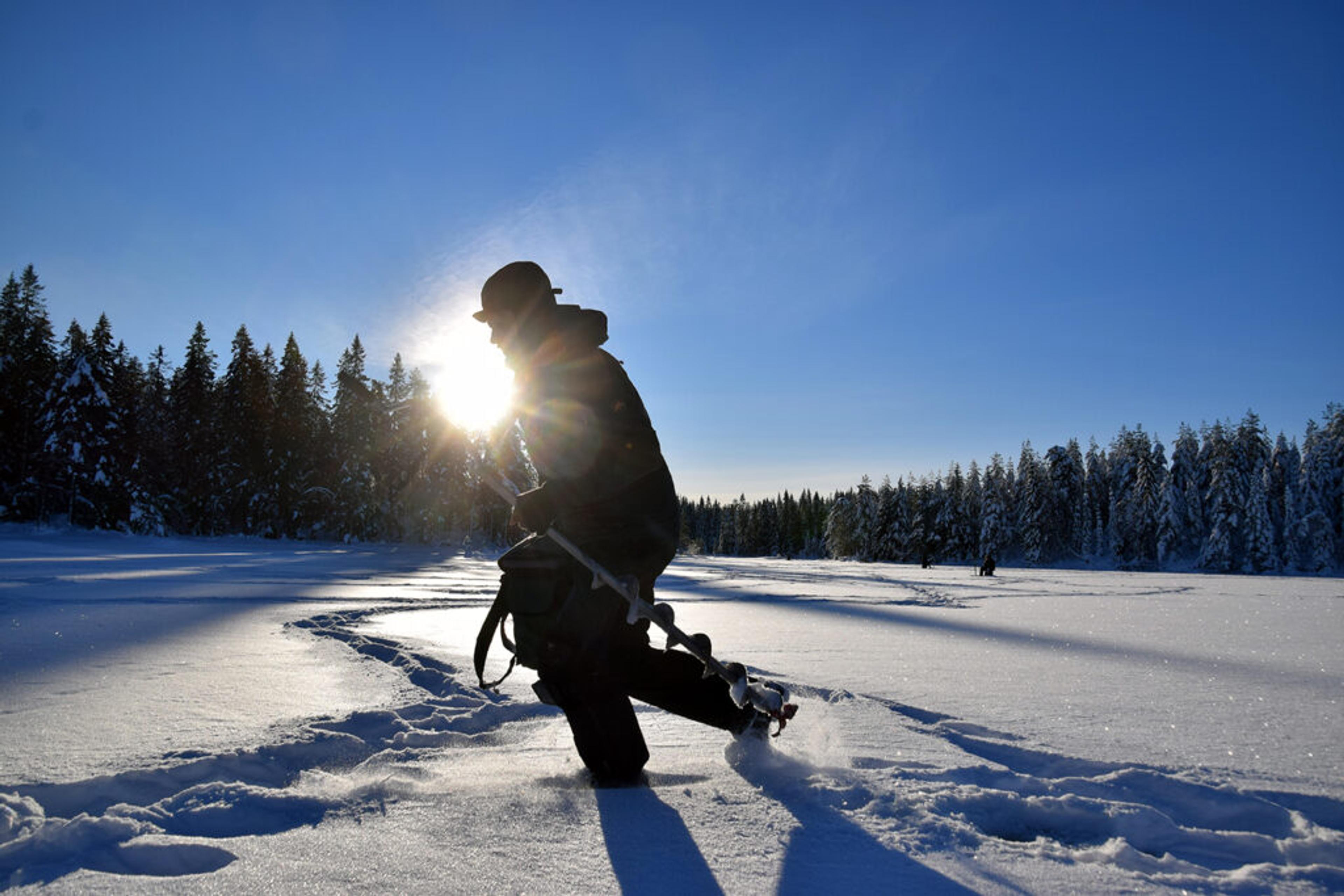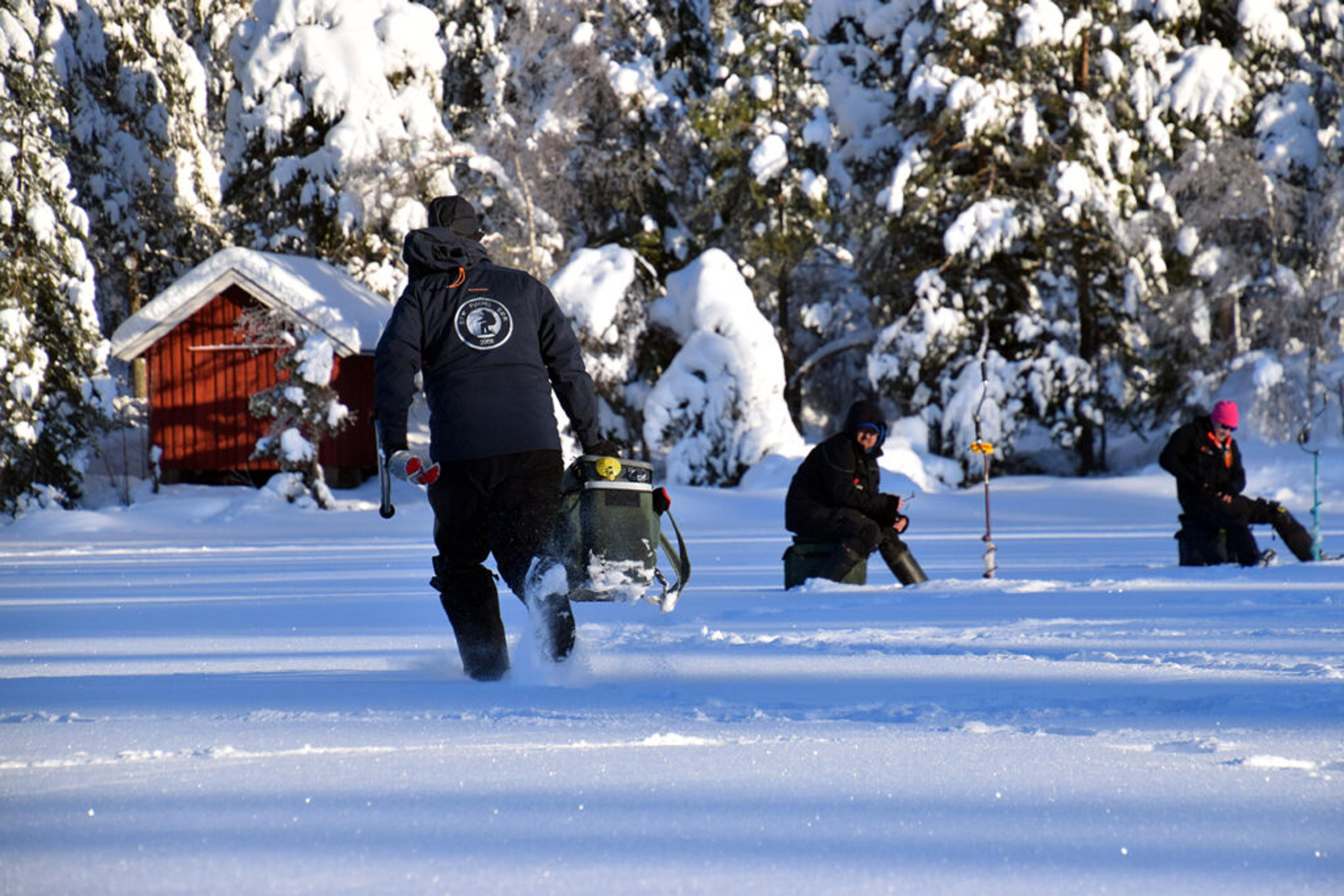 Han spretter opp og løper bortover isen, for å borre seg et nytt hull i isen. Denne sporten er en fascinerende blanding av tålmodighet og kjapphet.