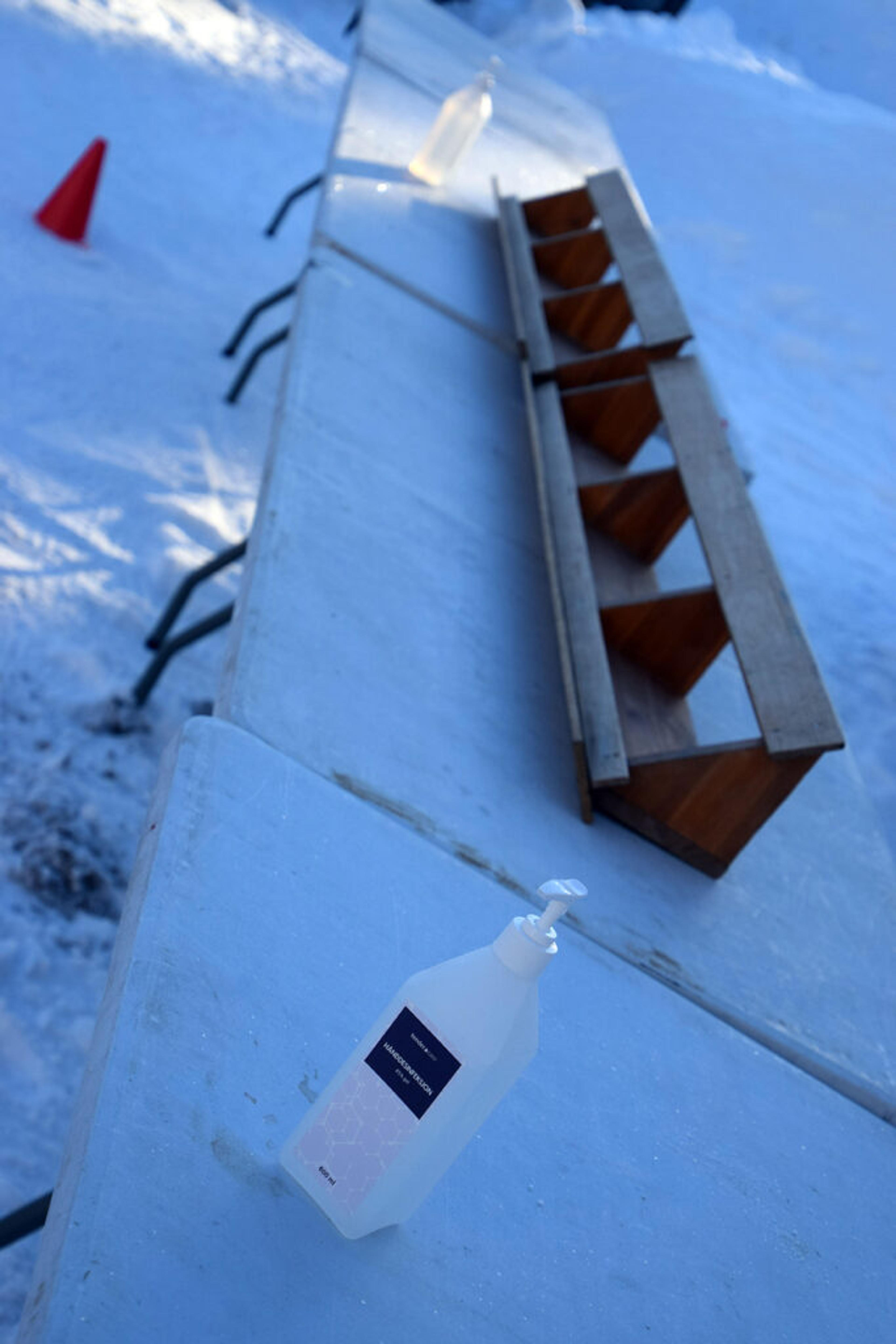 KORONA-TILPASSA: Ingen problemer med å holde avstand på isen. Her står også håndspriten klar.