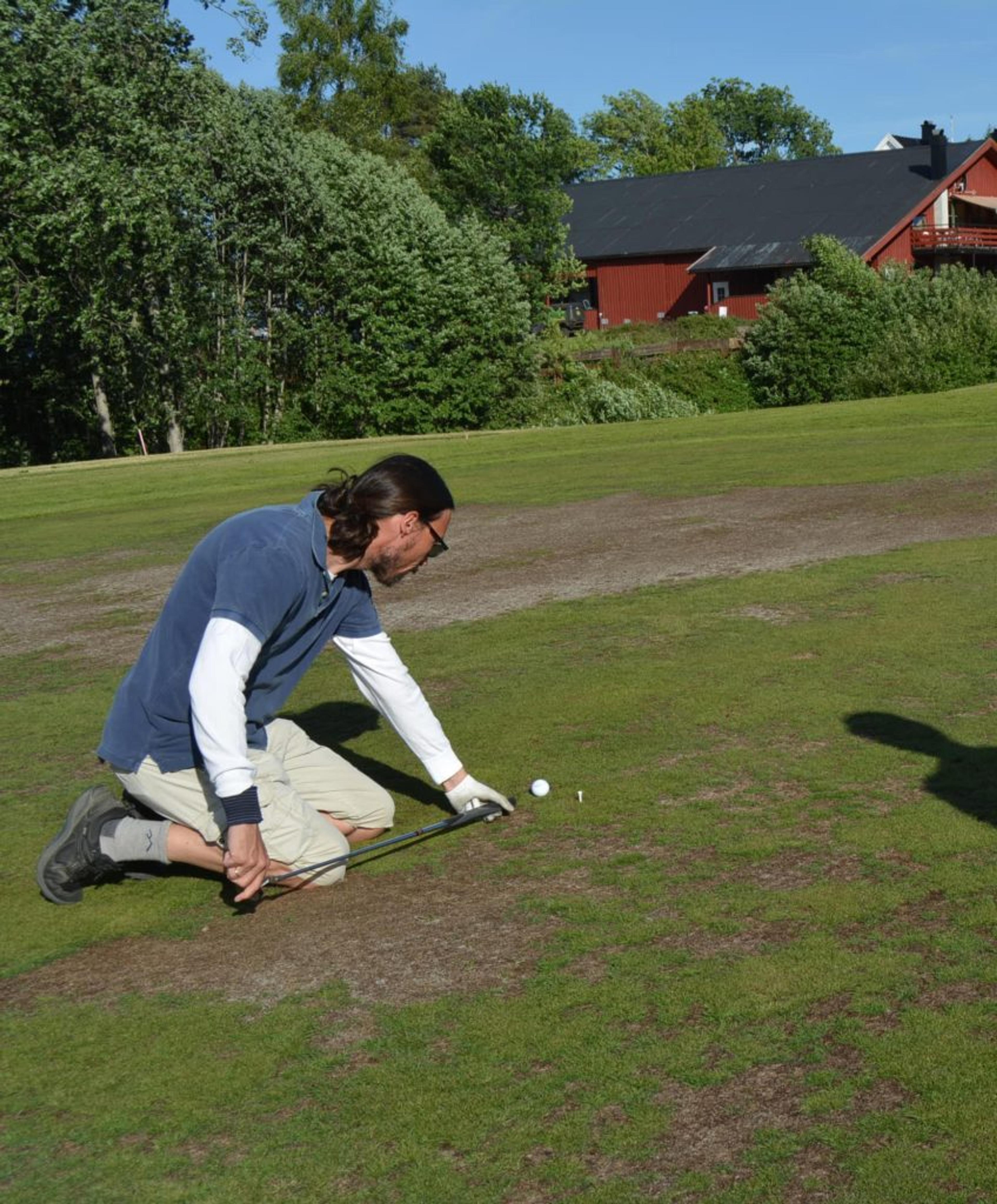 BILJARD: Det var ikke helt normale tilstander under torsdagens turnering på Re golfklubb. Her måtte Truls Gran bruke biljardferdighetene sine for å få ballen i hullet. Foto: Amalie Andersen.