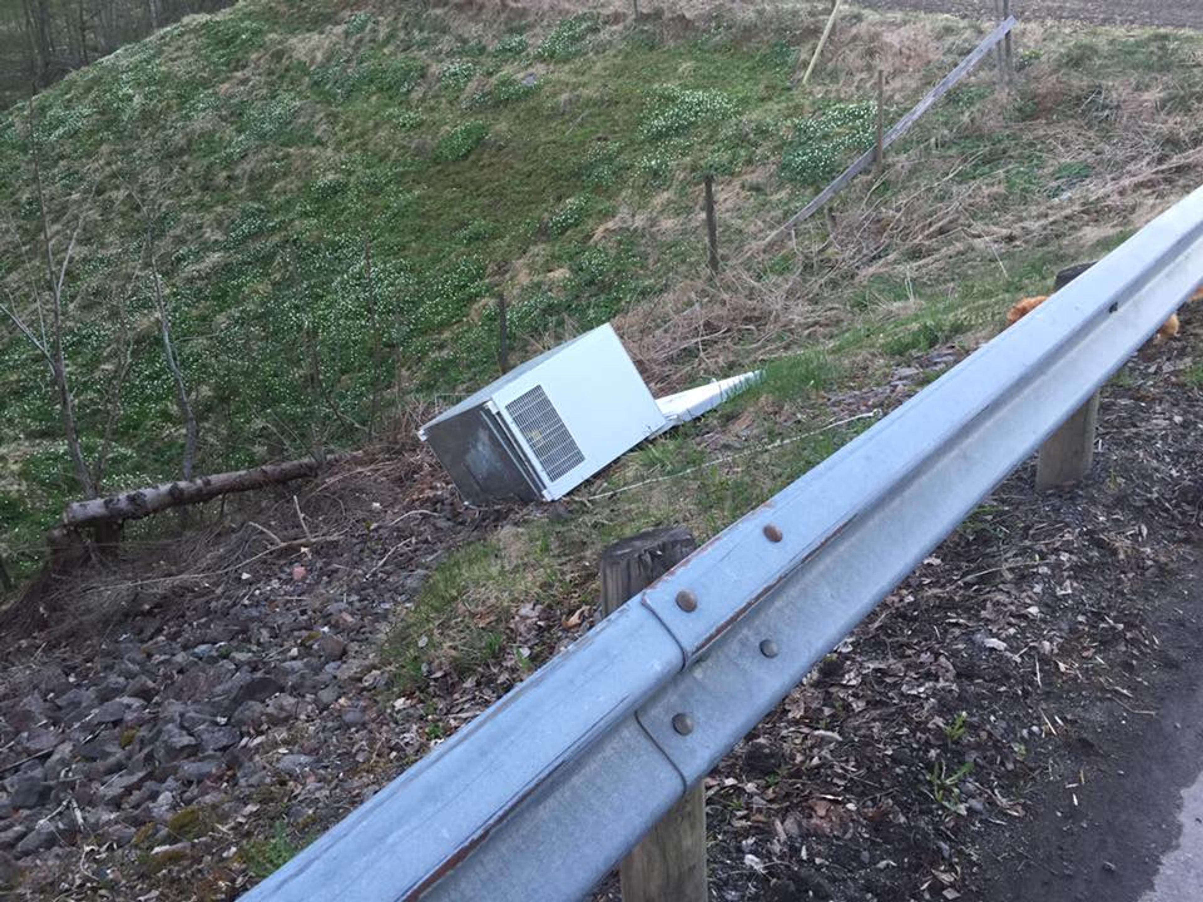 DUMPA: Det er mer jobb å få fryseboksen over autovernet og i grøfta her, enn det ville vært å kjøre til Revetal eller Taranrød og levere den – gratis, og med bærehjelp av ansatte. Foto: Privat.