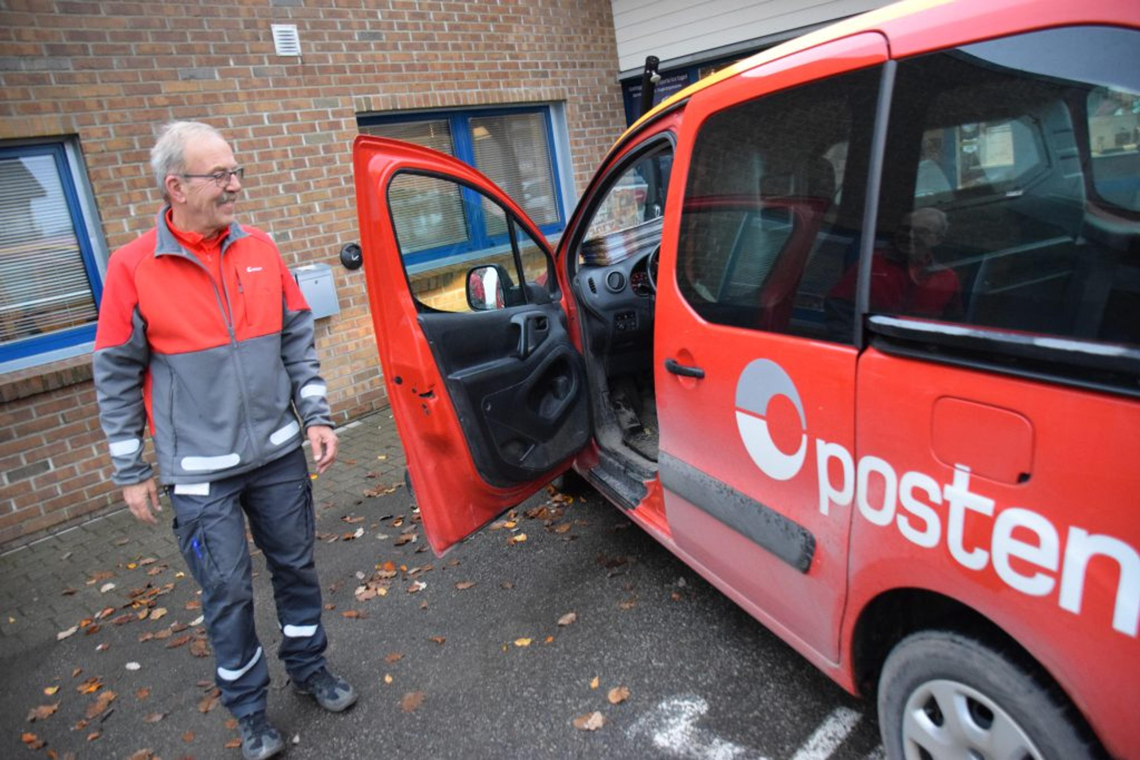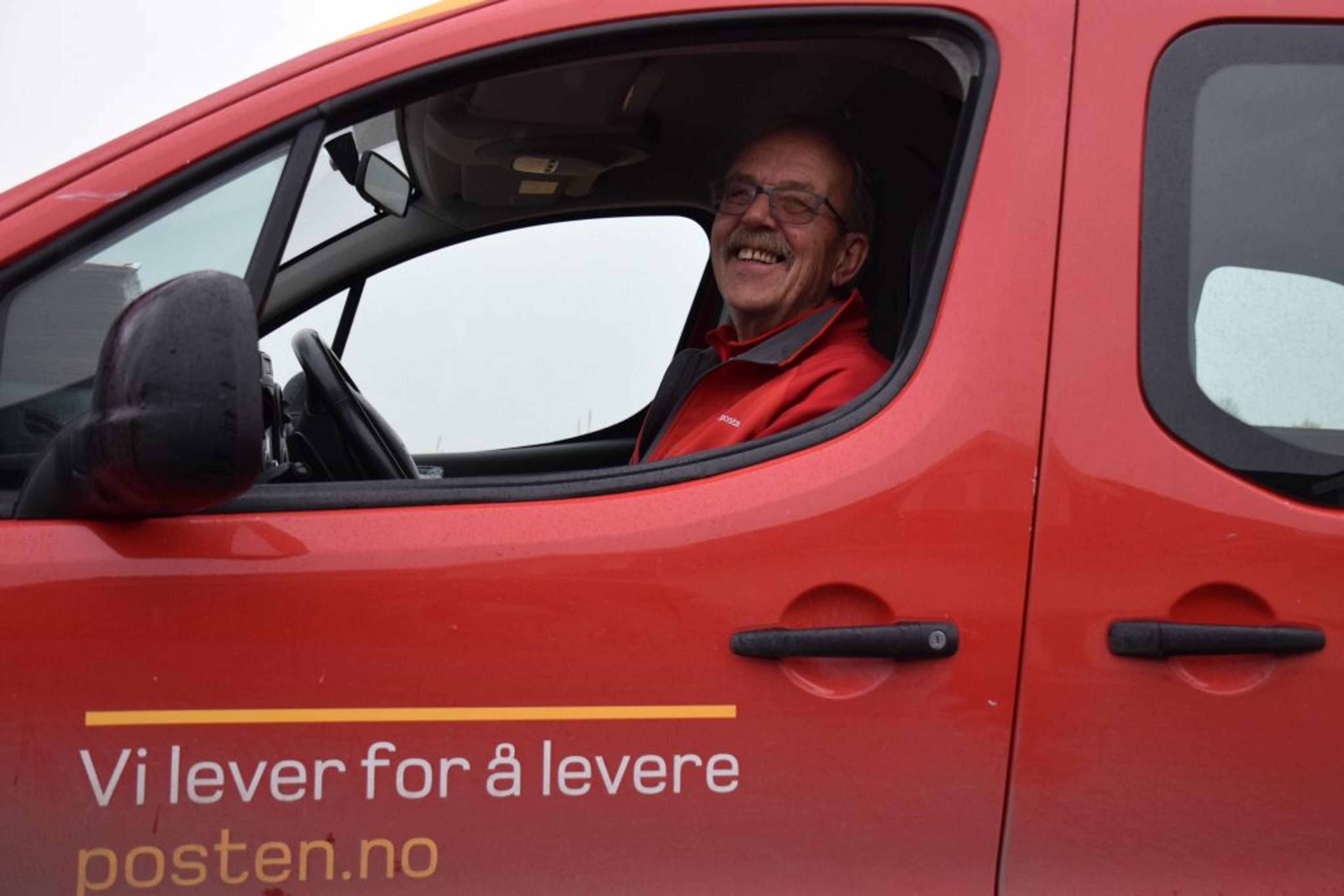 EN POSTMANN MED GODT HUMØR: Klaus Holt (69) starta med å sykle rundt med post i Fon. Til sommeren avslutter han en lang yrkeskarriere, og fram til da leverer han post på samme rute – men nå i bil. Foto: Stian Ormestad.