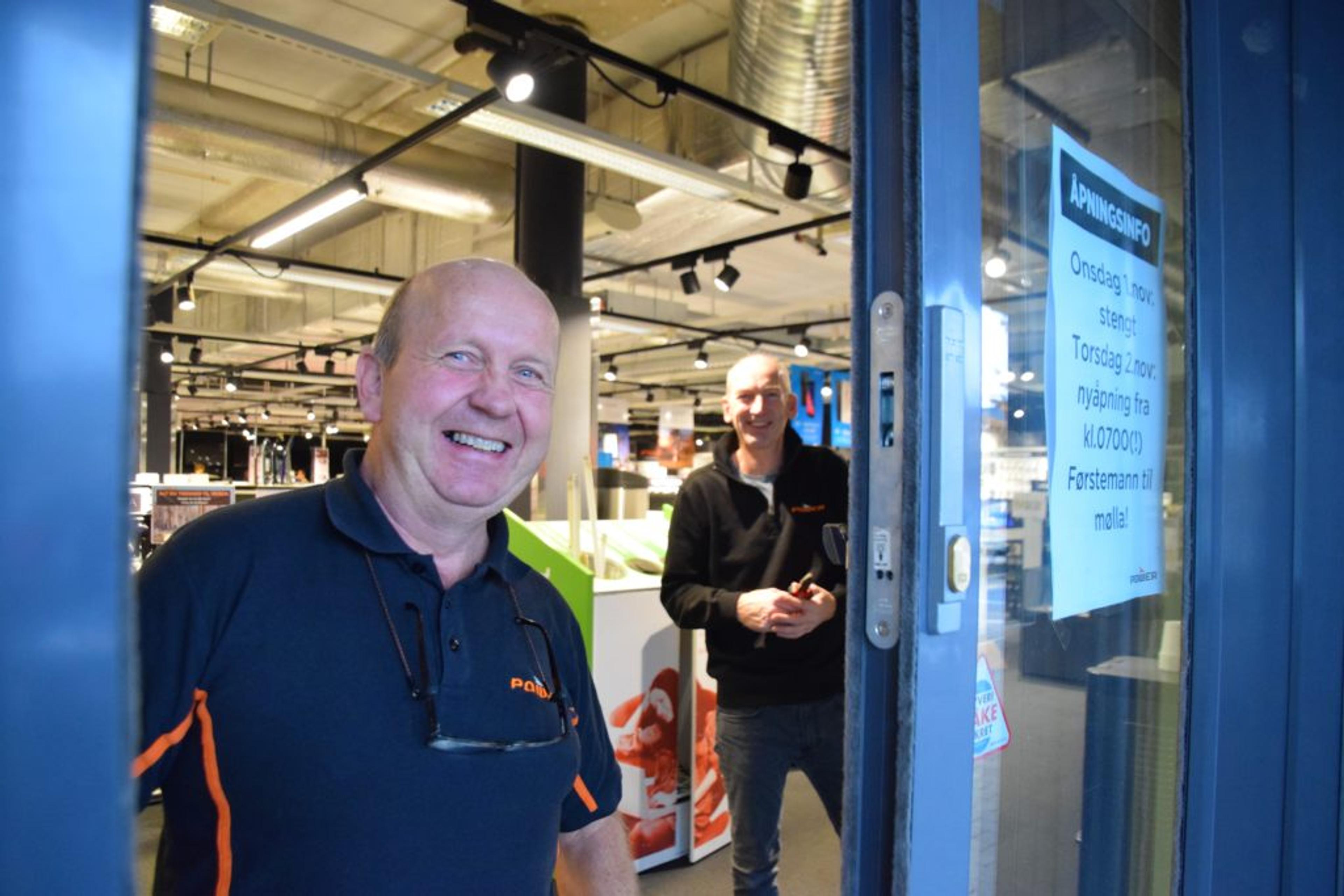 EIERE: Ole Magnus Bentzen (55) og Thomas Anthonisen (52) ønsker velkommen til nyåpning av Power Revetal torsdag 2. november. Ole Magnus har drivi elektrisk forretning på Revetal siden 1985. Foto: Stian Ormestad.