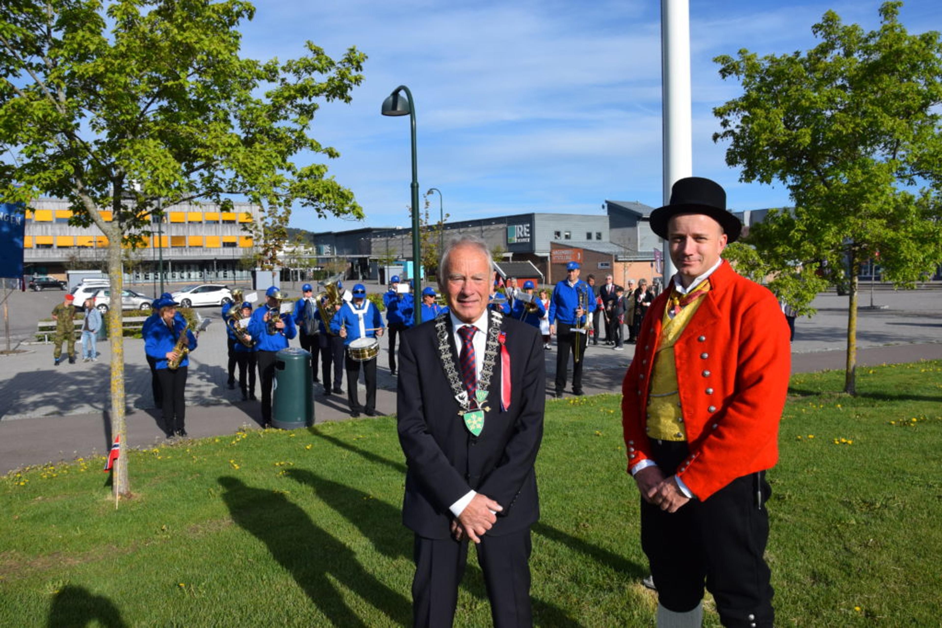 SJOKKERT: Re-ordfører Thorvald Hillestad (SP) foran flaggstanga i parken på 17. mai. Foto: Håkon Westby.