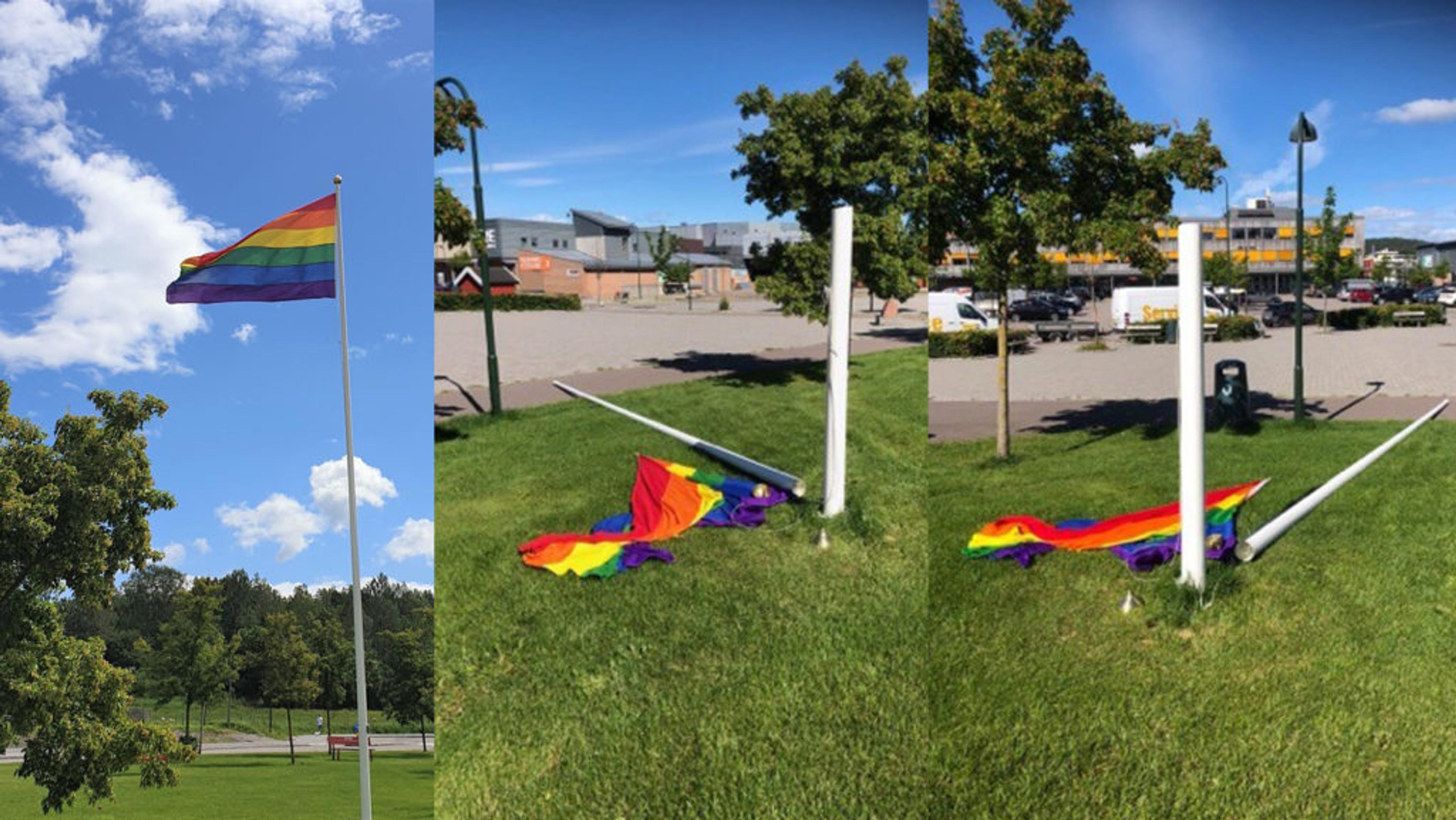 HÆRVERK: I løpet av natta har noen kutta flaggstanga med prideflagget i toppen i to. Foto: Re kommune / privat.