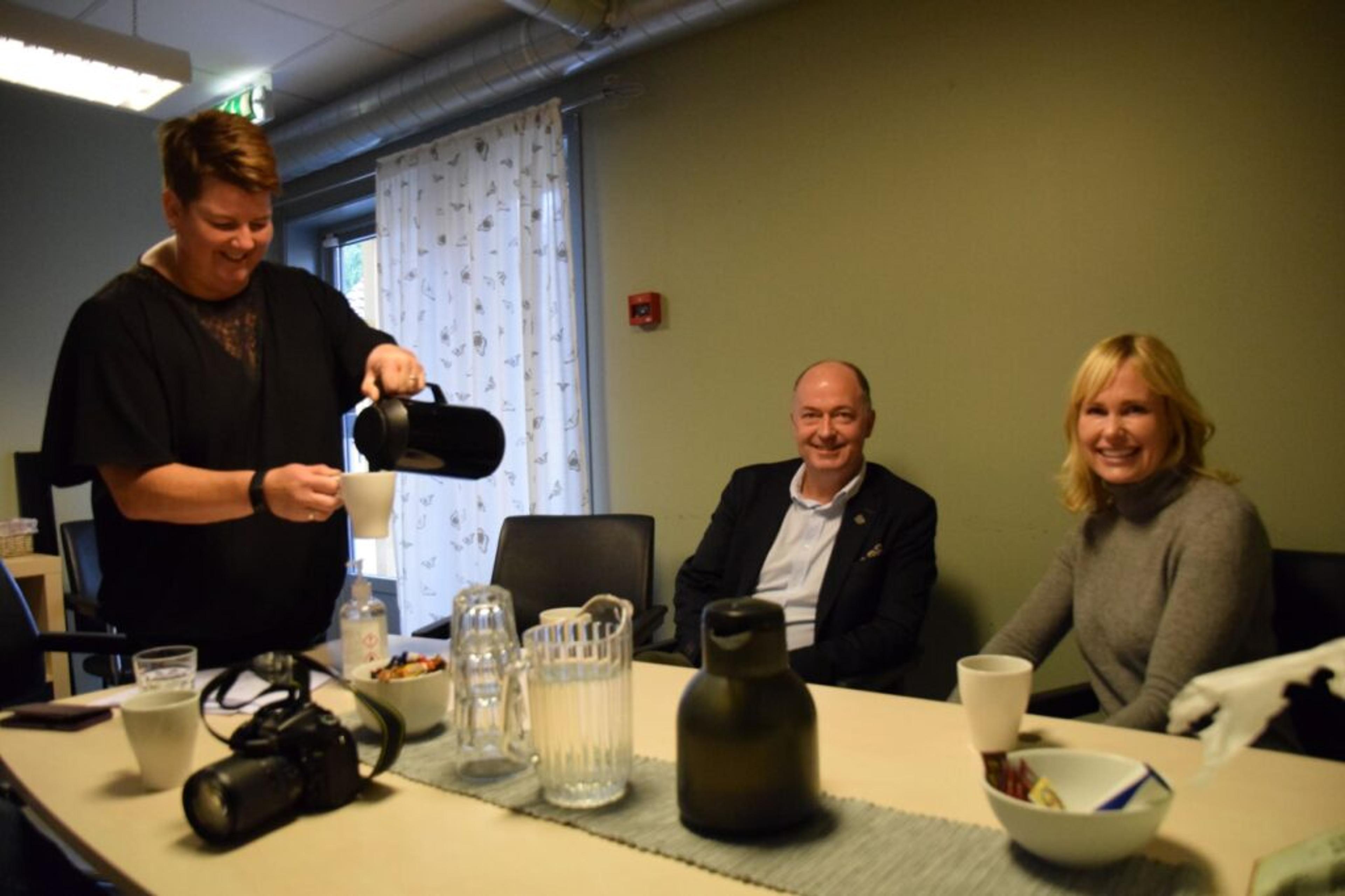 KAFFELUNSJ: Over ett par kaffikopper og ei skål med sjokolade ble det prata om utfordringer for private barnehager i Re og ellers i landet. Foto: Stian Ormestad.