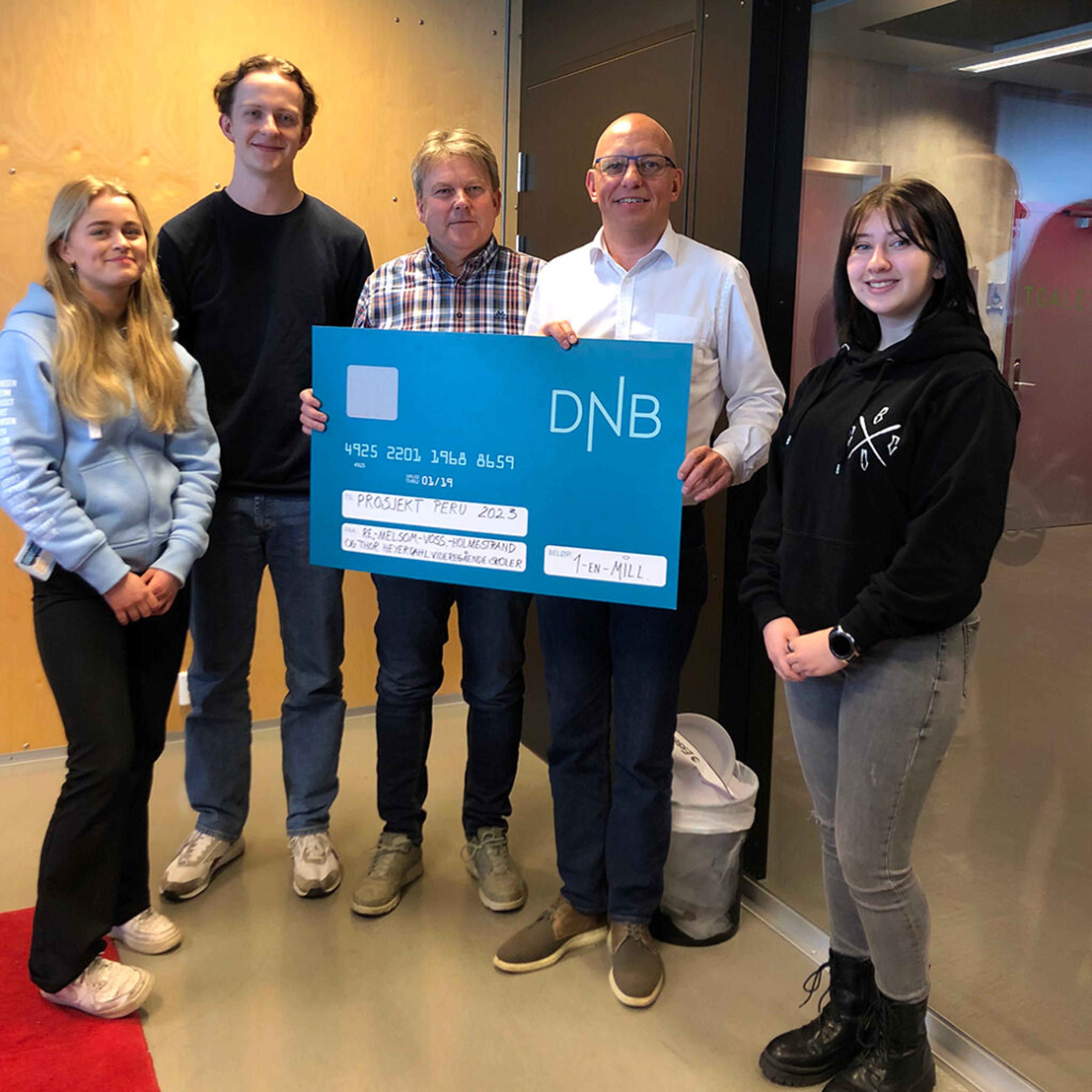 OVERREKKELSE: Sjekken på en million kroner til Prosjekt Peru blir her overlevert fra elever i komiteen ved Re VGS til Prosjekt Peru ved økonomiansvarlig Trond Manvik og daglig leder Jan Gusland. Foto: Privat.
