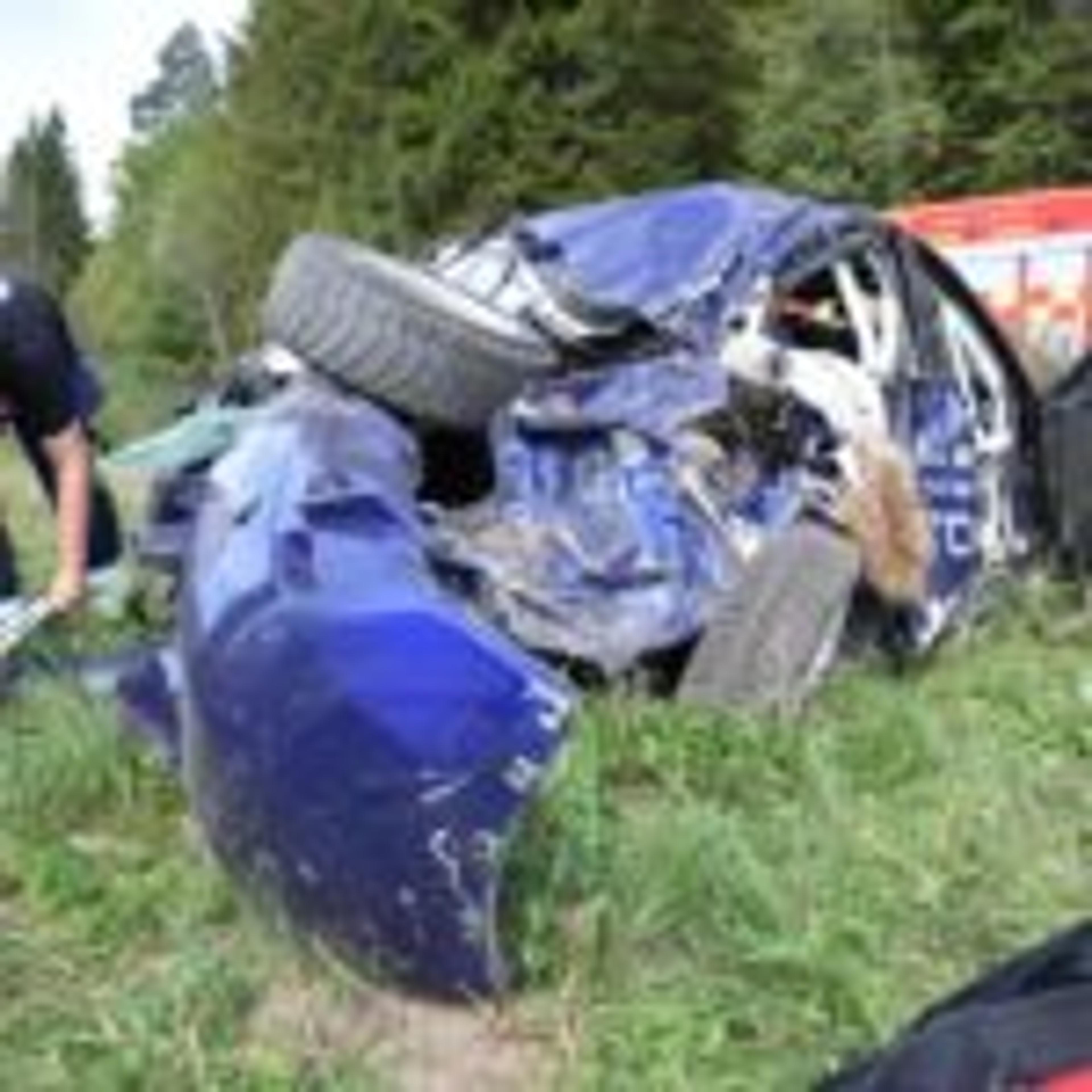 VOLDSOM VELT: Rallybilen er totalvrak, men heldigvis fungerte alle sikkerhetsanordninger som de skulle. Fører og kartleser er kjørt til sjukehus for kontroll. Foto: Stian Ormestad.