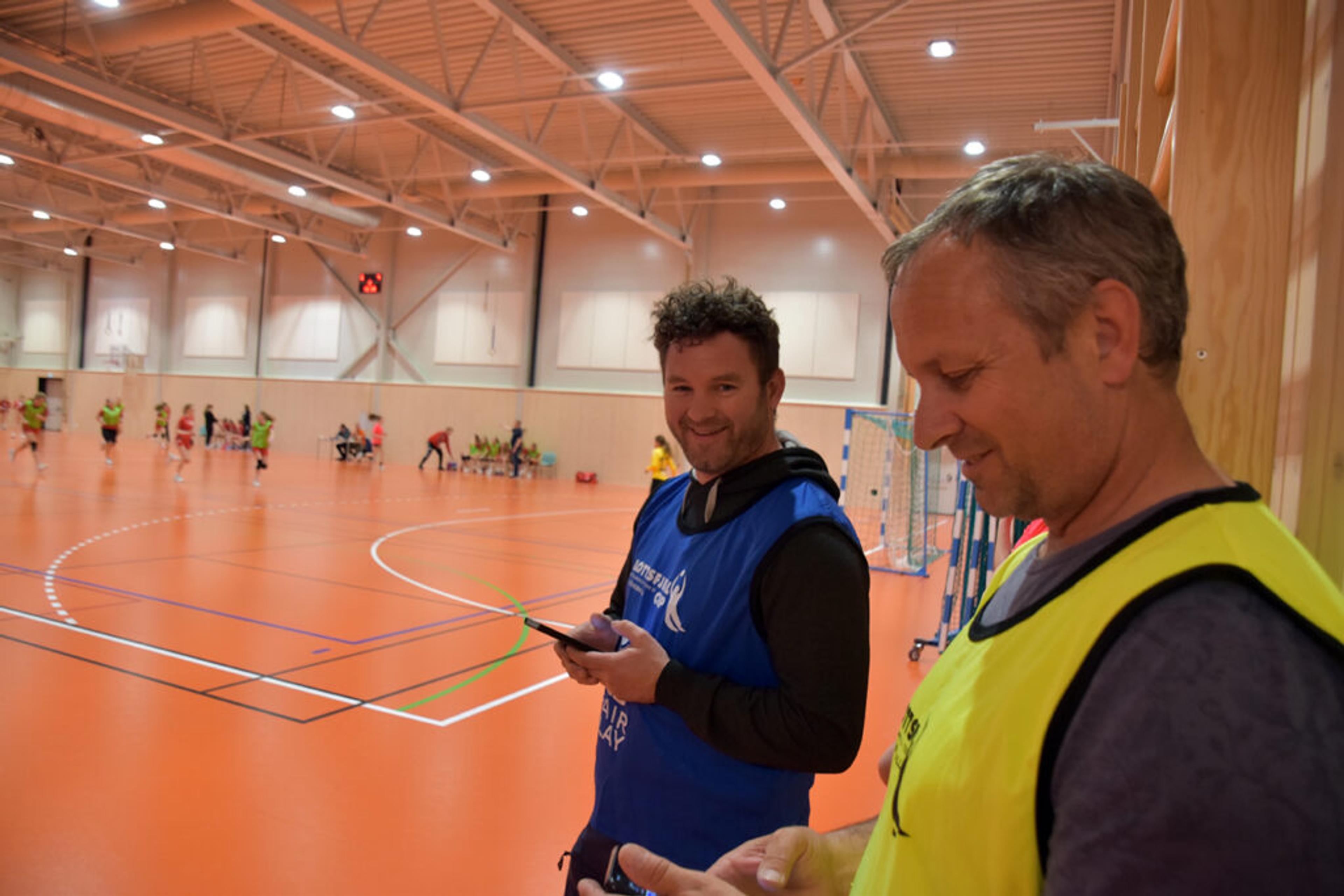 STOR DUGNADSINNSATS: «Halve Re er med» når det arrangeres Slottsfjellcup. Aleksander Øren og Fredrik Lie holder orden på sakene i Revetalhallen. Foto: Stian Ormestad.