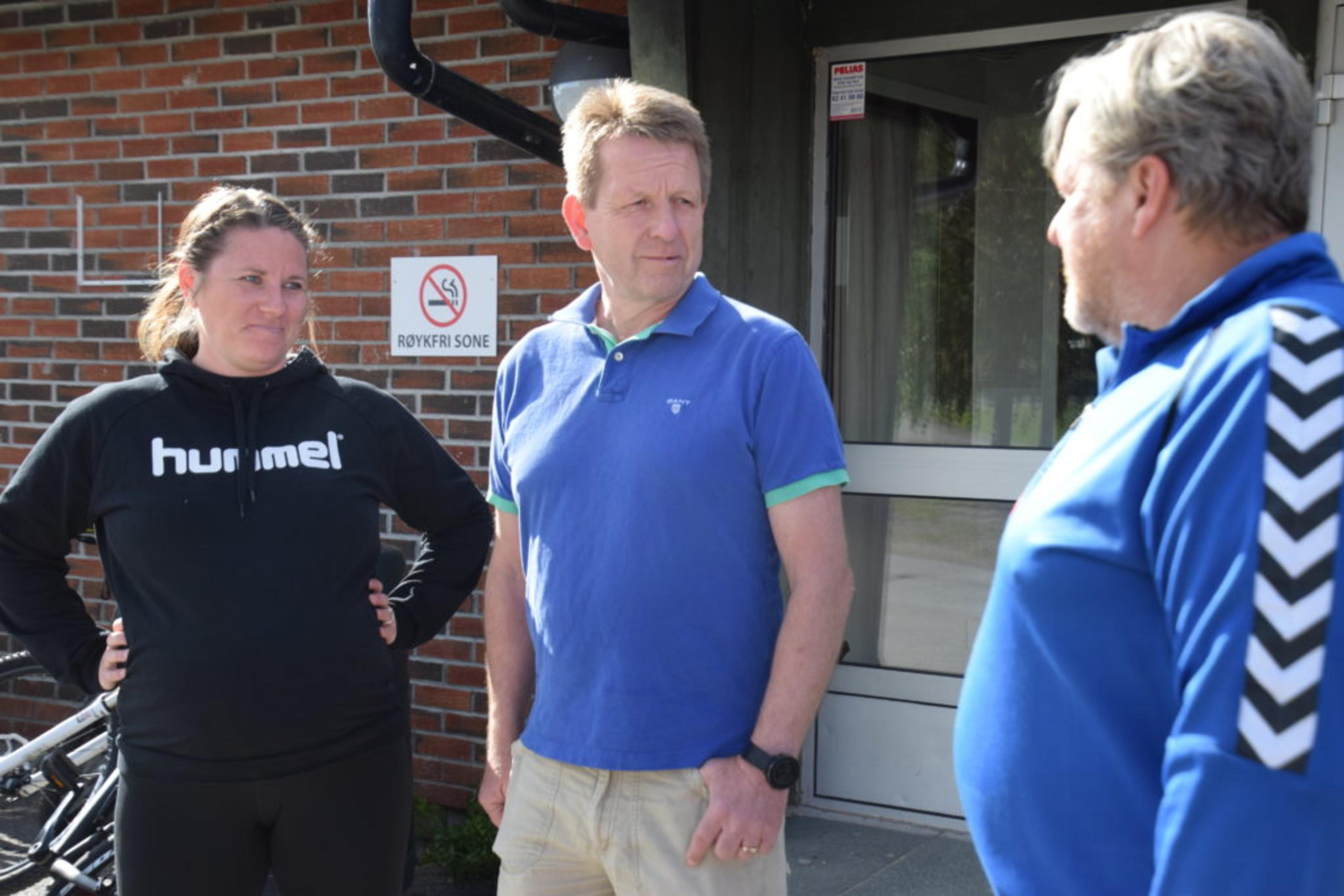 MENINGSFULLT: Morten Kjølstad (i midten) har mange timer i Ramneshallen, for å se på kone og barn spille, trene, organisere og stå på for håndballen. Eldstedatter Katinka til venstre, og sportslig leder for Ramnes håndball Ronny Bekkevold til høyre. Bildet ble tatt i forbindelse med overrekkelsen av gaven etter Anitas bortgang. Arkivfoto: Stian Ormestad.