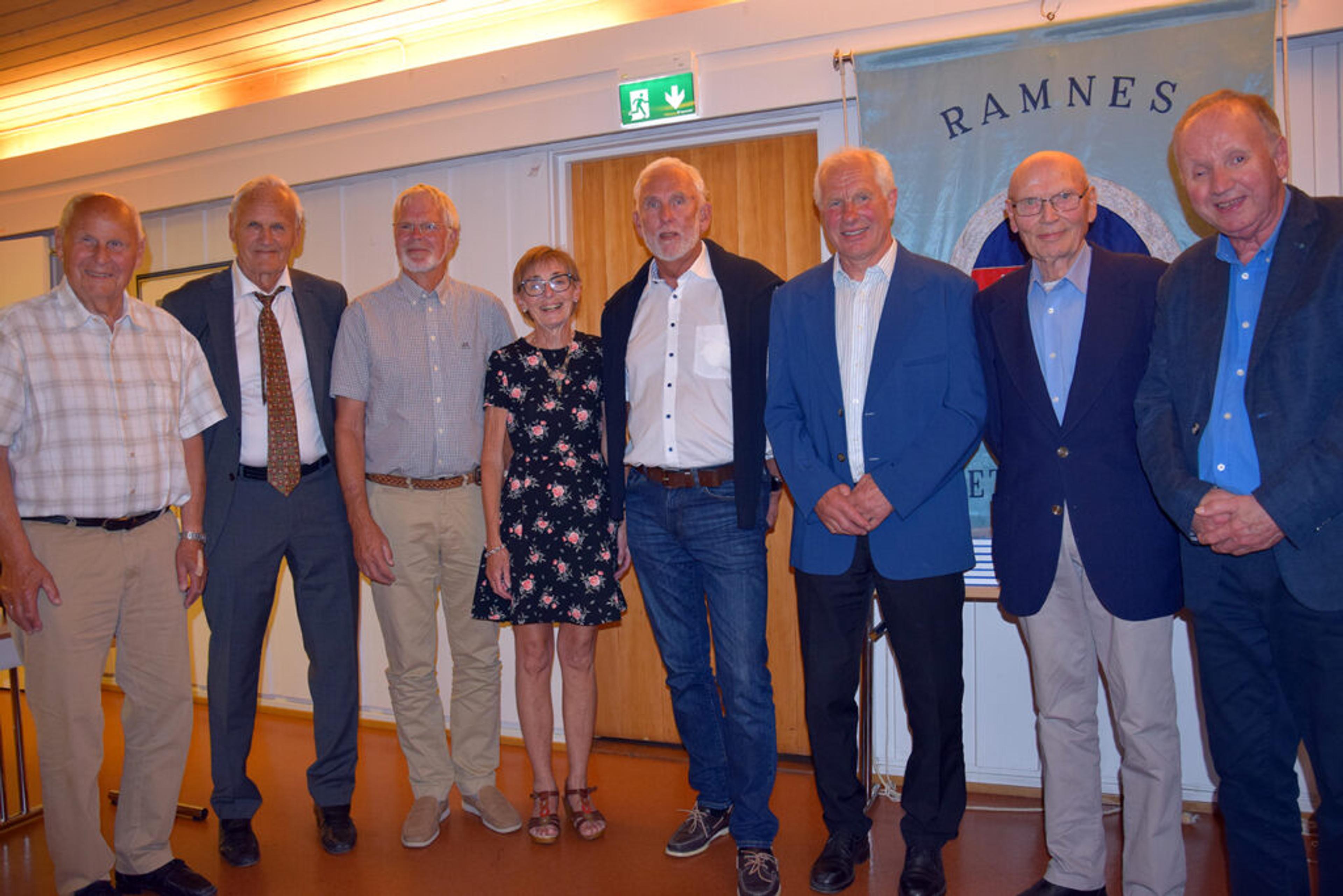 ÆRESMEDLEMMER: Fra venstre Per Bjerkø, Kjell Holm, Tore Finnerud, Synnøve Finnerud, Knut Svendsen, Kjell Folkvord, Thor Kihle Christensen og Alfred Ringdal var alle åtte æresmedlemmer i Ramnes IF under 90-årsjubileumsfesten lørdag 1. juli 2023. Foto: Håkon Westby, ReAvisa.