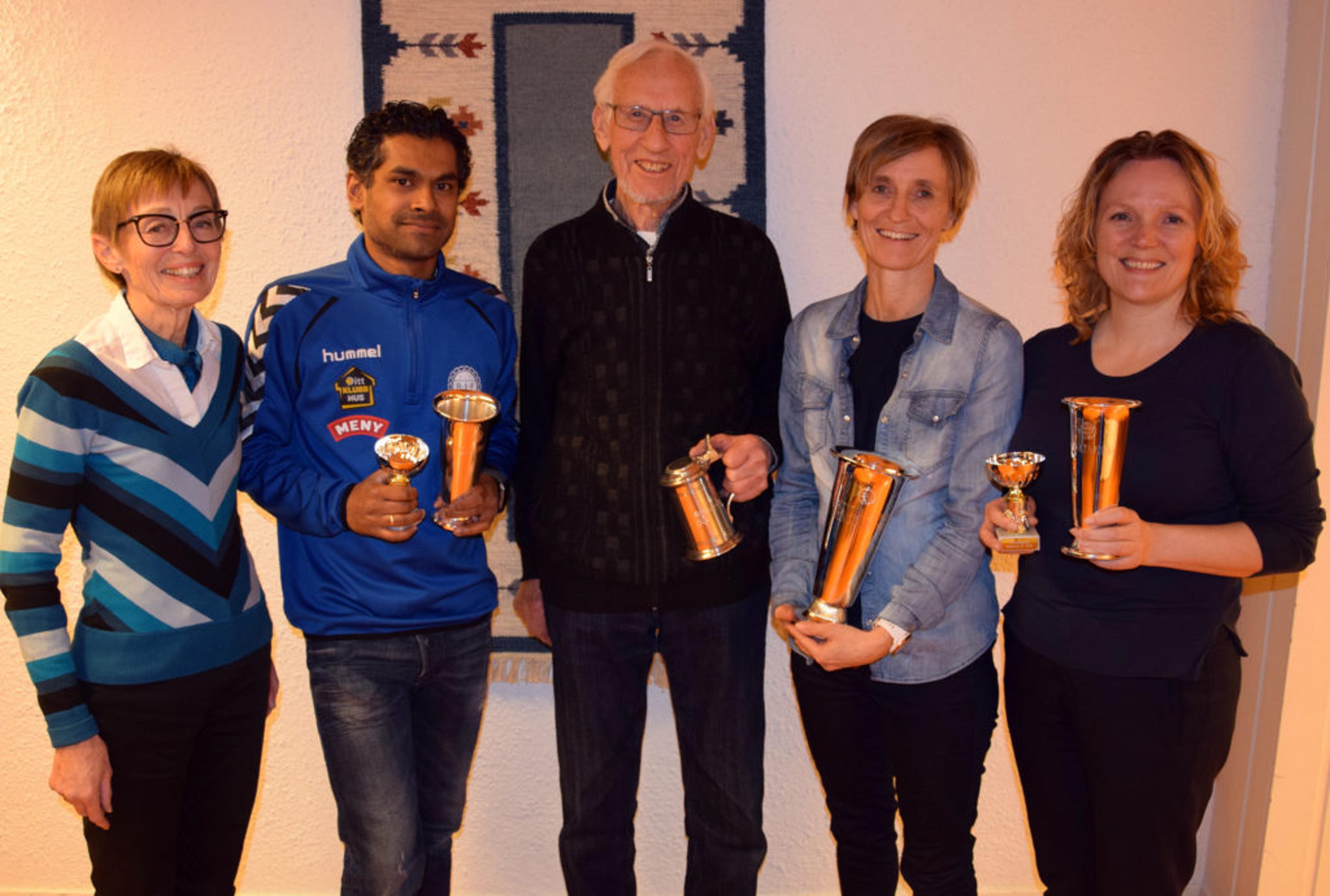 POKALVINNERE: Synnøve Finnerud overrekker pokaler og krus på RIFs årsmøte til fra venstre: Henrik Gladhaug Sandnes (mennenes innsatspokal), Helge Bøe (idrettsmerkekruset), Elise Hogsrød (Anker Kirkevolds pokal) og Silje Eggum (damenes innsatspokal). Foto: Håkon Westby.