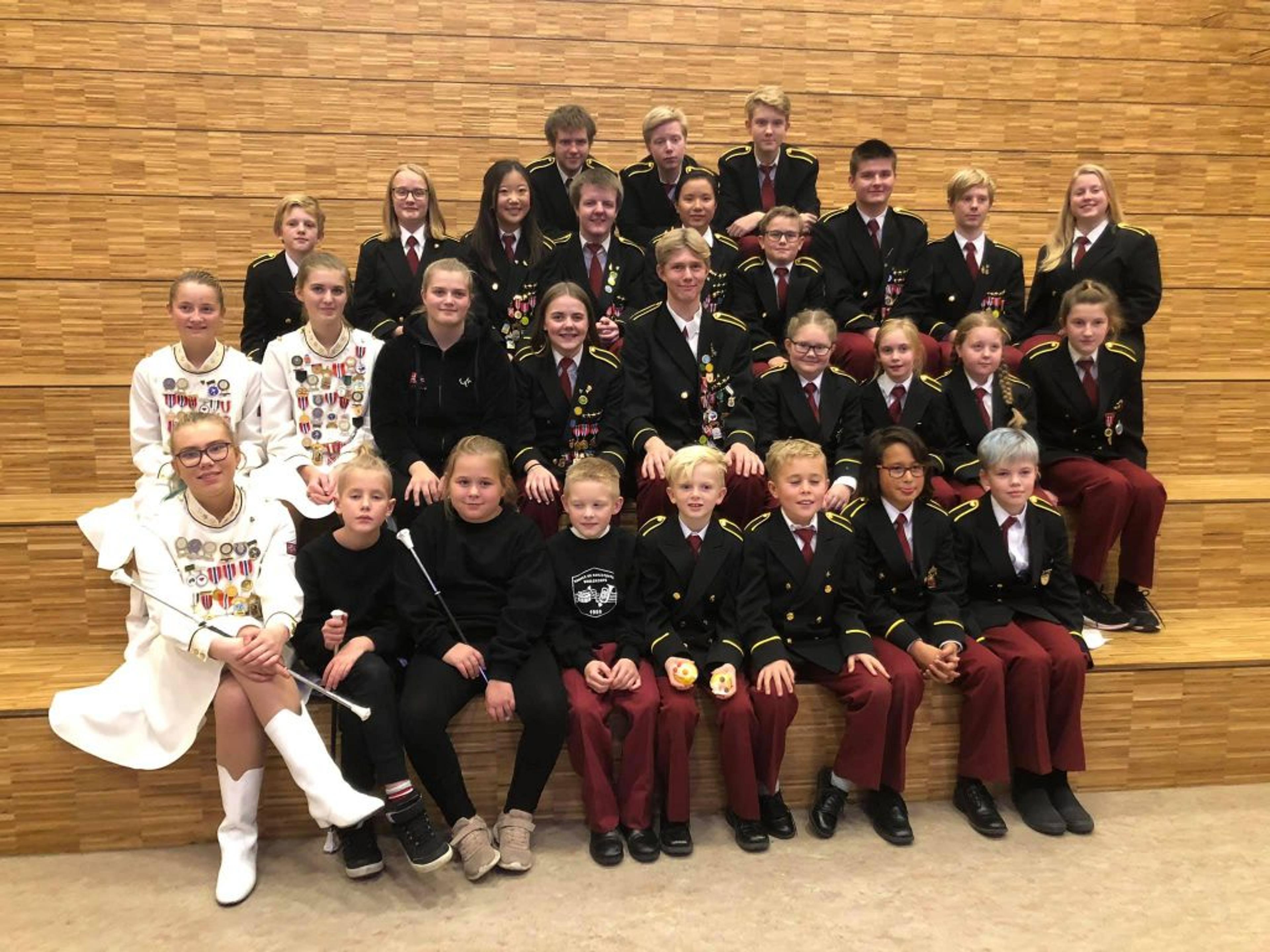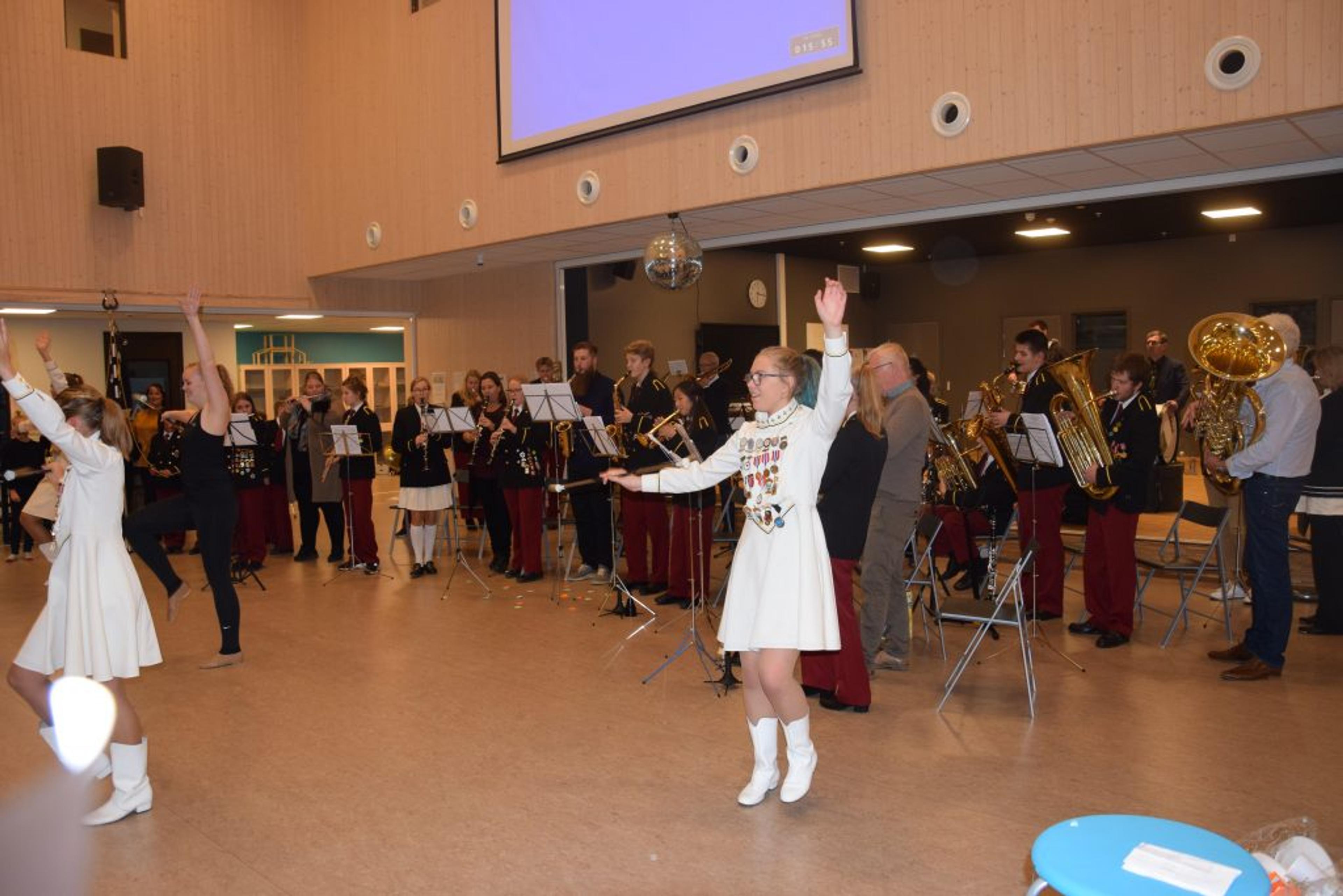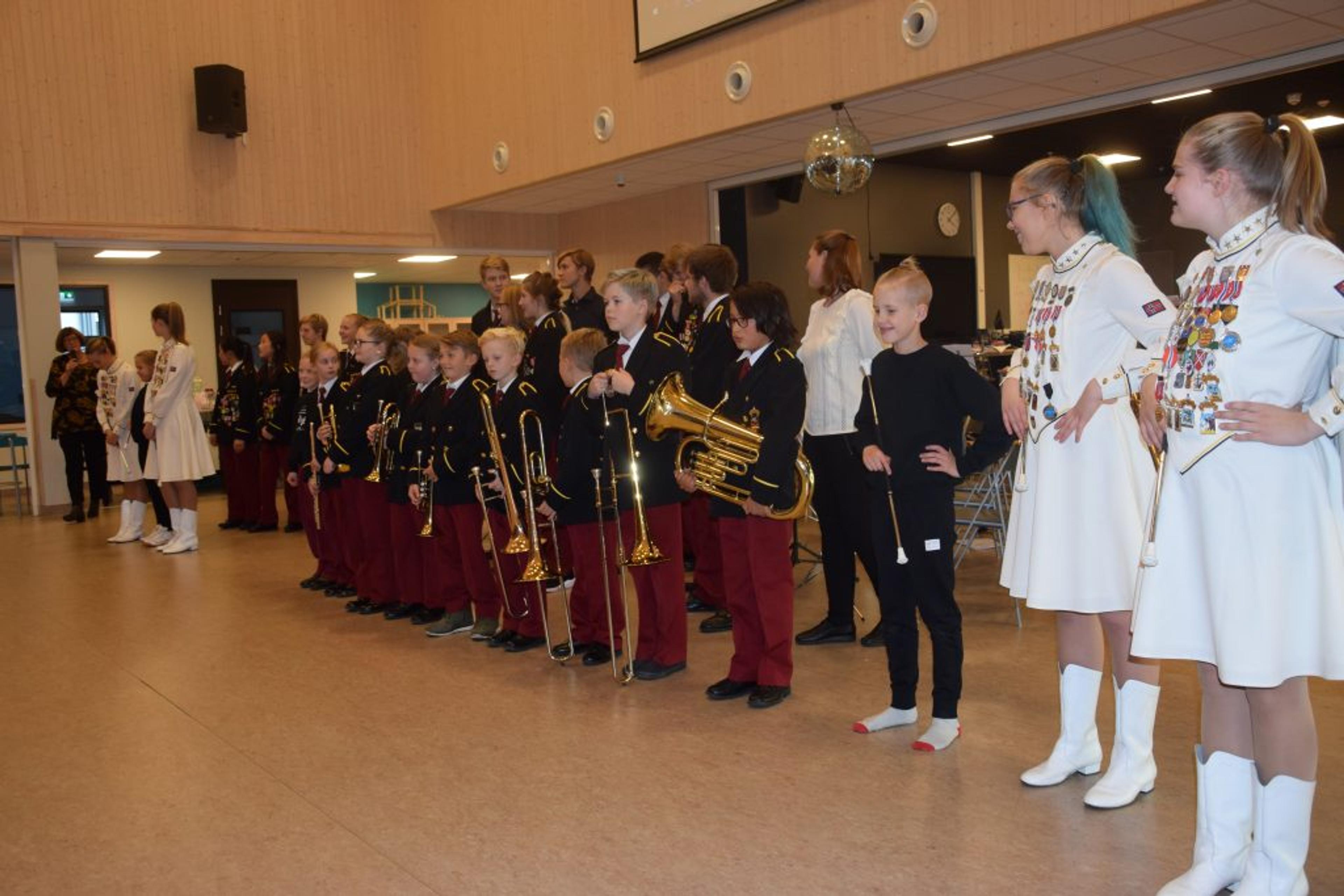 KORPS-JUBILEUM: Hele 170 gjester kom på bursdagsfeiring for Ramnes og Røråstoppen skolekorps. Det viser med all tydelighet at vi her har med en veldig populær jubilant å gjøre. Her er noen av dagens korspmusikanter og drillere. Foto: Privat.