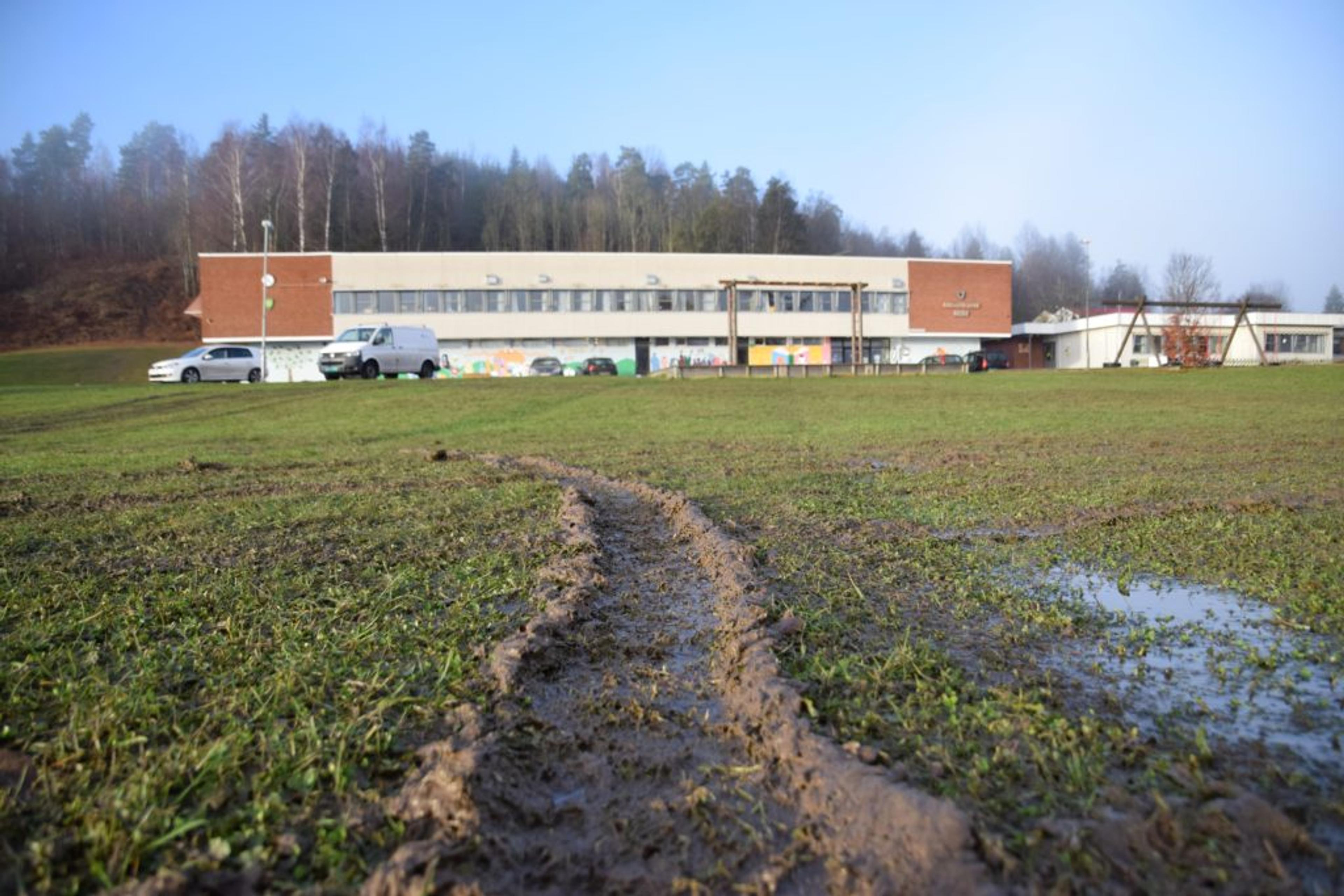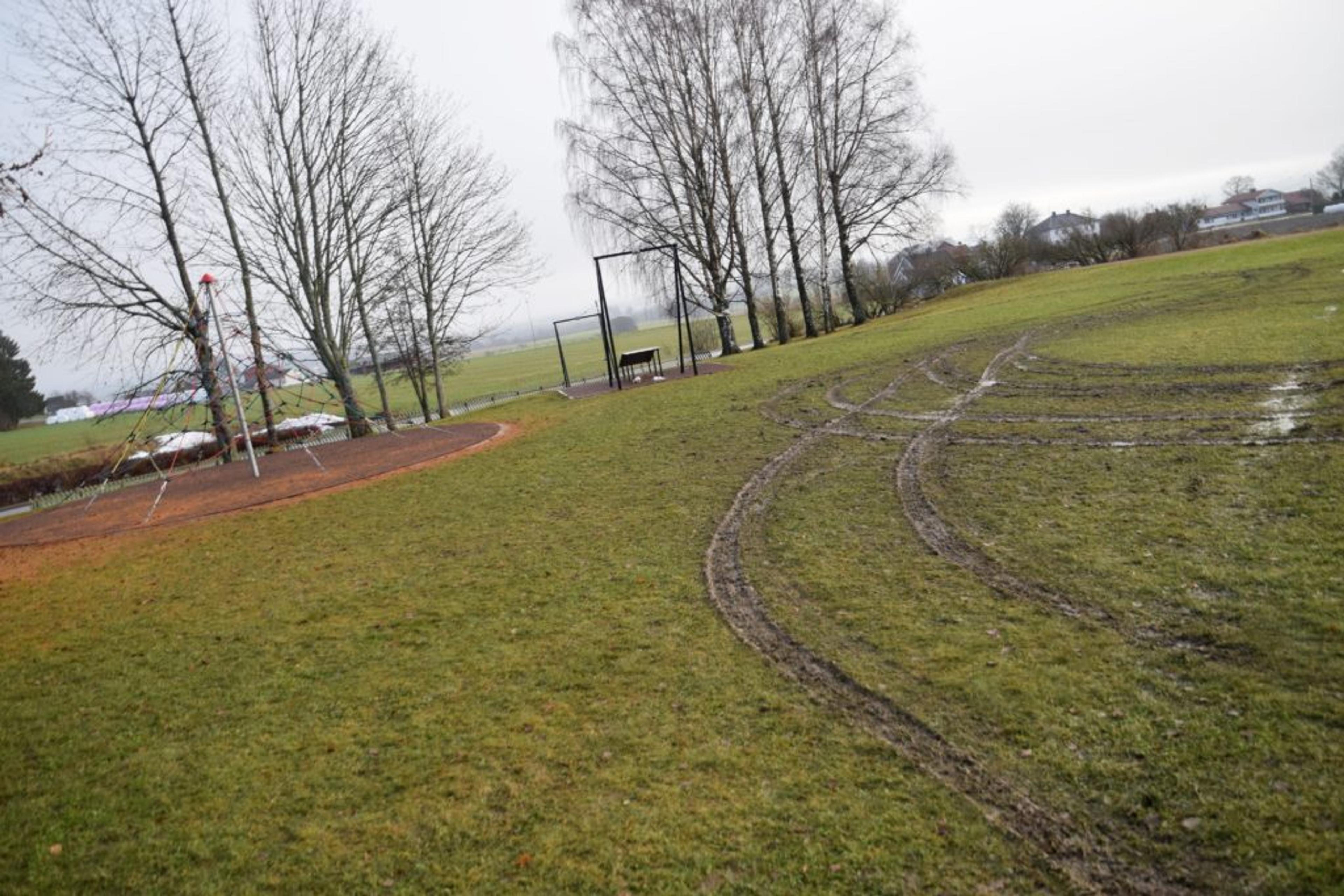 TRIST SYN: Flere spor går helt inntil dyre lekeapparater som er opparbeidet over tid på utearealene på Ramnes skole. Heldigvis er ingen lekeapparater skadet. Foto: Stian Ormestad.