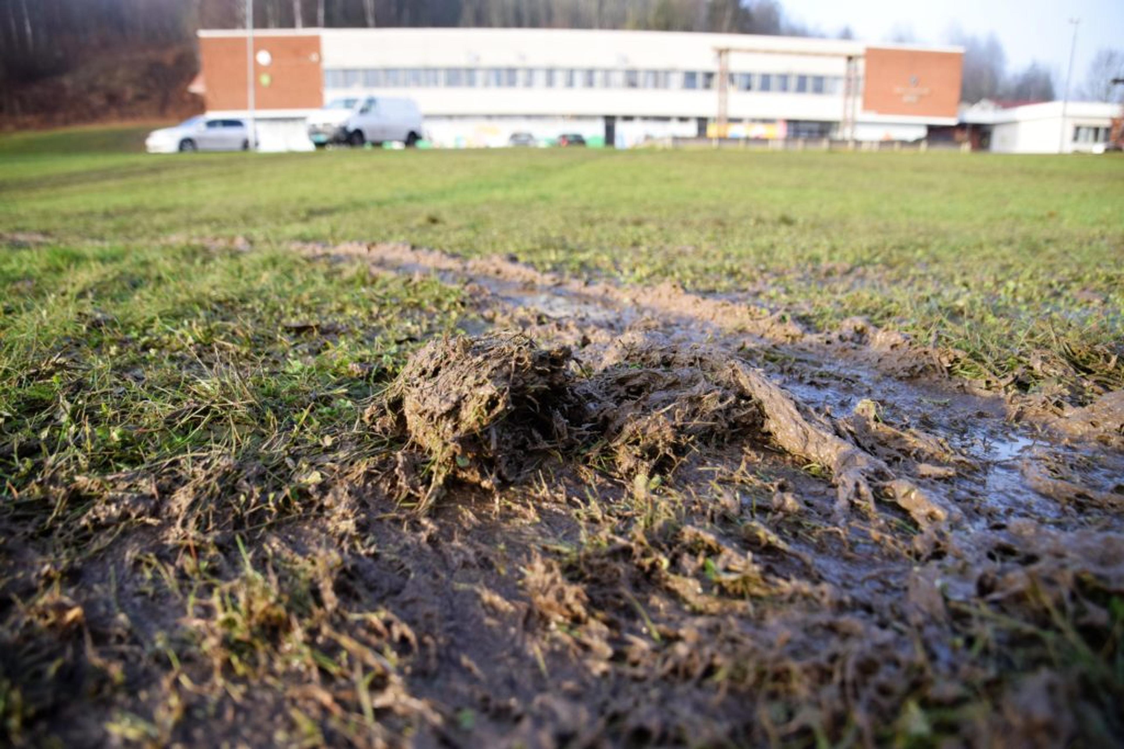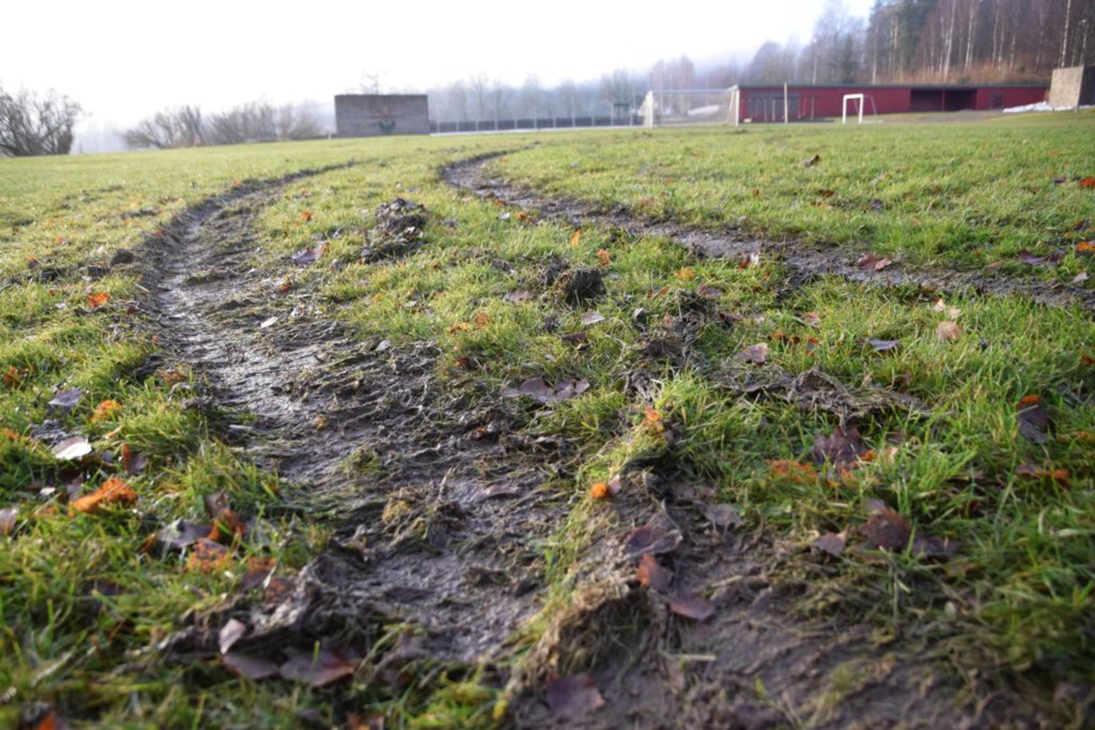 TRIST SYN: Det er mange dype spor i grassplenen. Det vil ta tid å få alt på stell igjen. Foto: Stian Ormestad.
