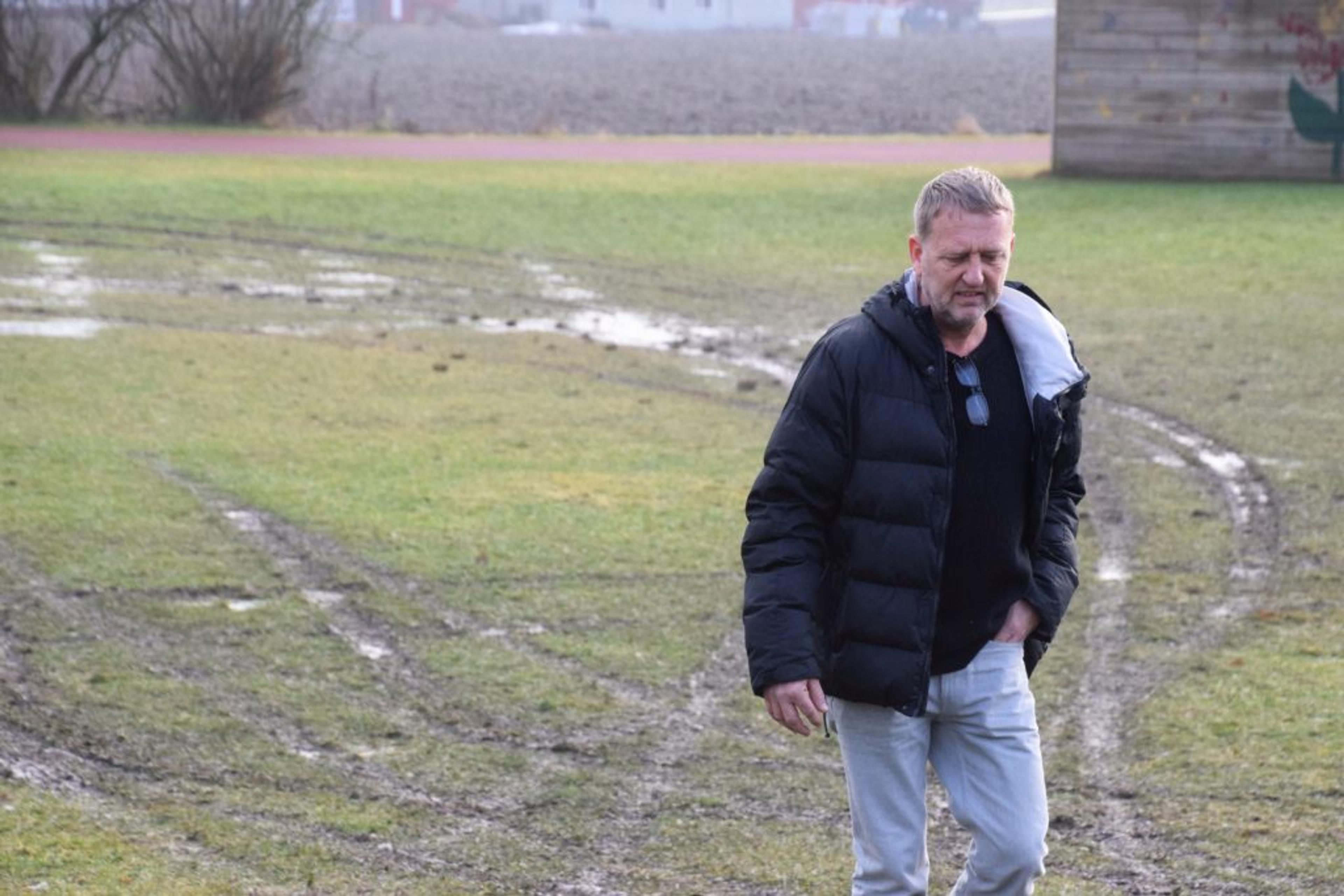 TRIST SYN: Vaktmestersjef i Re kommune Kurt Schjølberg anslår allerede ved første øyekast at det er snakk om store skader over så å si hele plenen. Foto: Stian Ormestad.