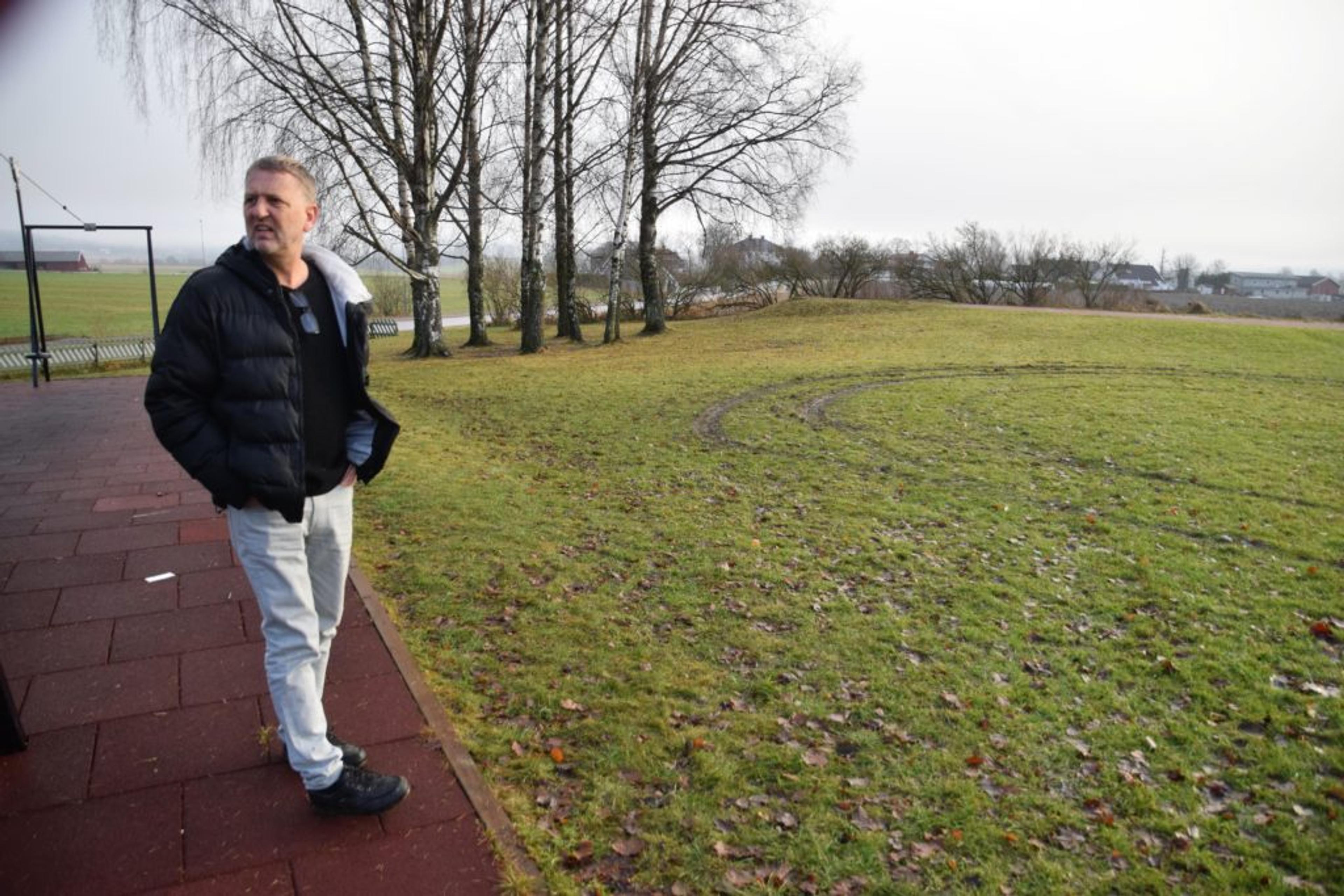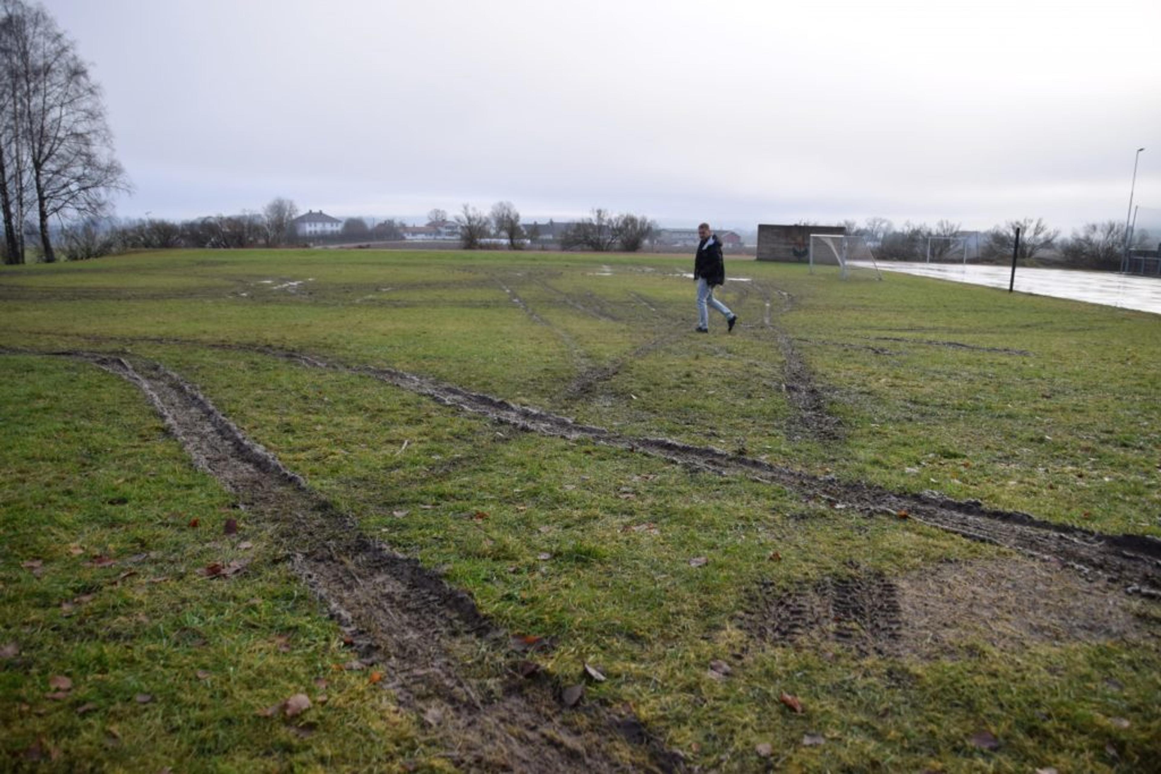 TRIST SYN: Grassletta må sperres av til det er rydda opp og grasset begynner å gro igjen. Vaktmestersjef i Re kommune Kurt Schjølberg anslår allerede ved første øyekast at det er snakk om store skader. Foto: Stian Ormestad.