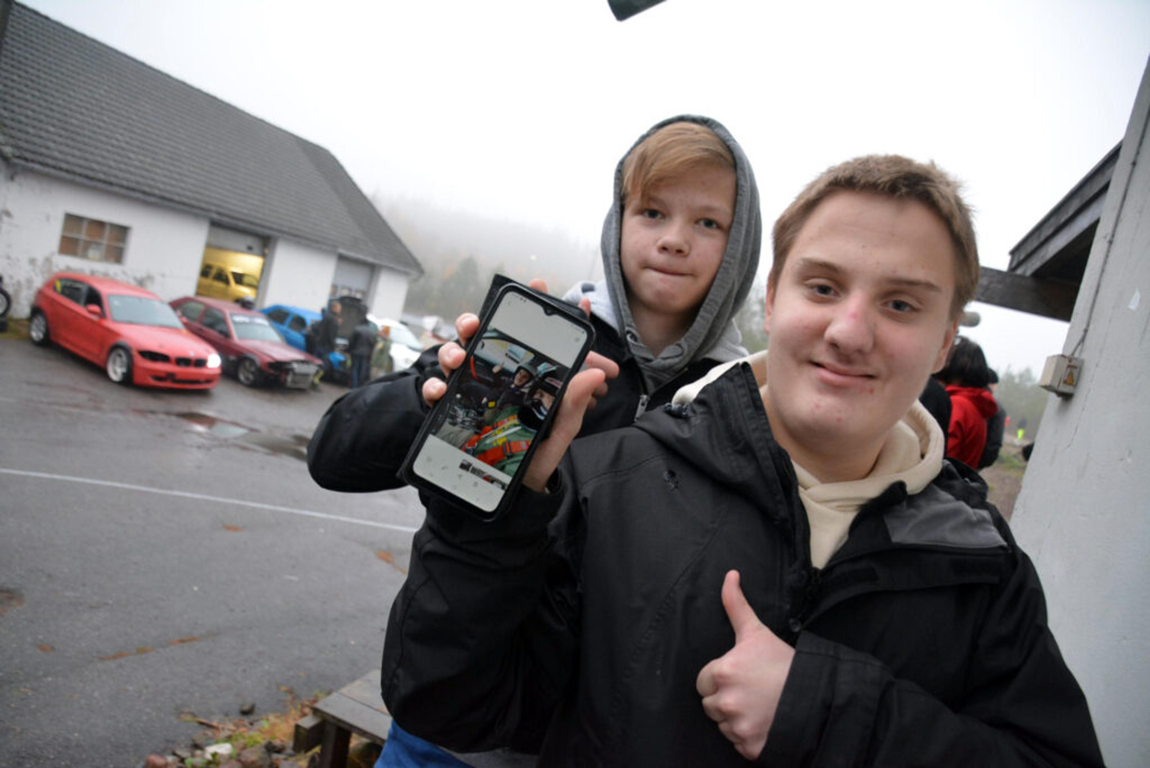 Like moro var det for kameraten Jarle Johan (14) som så på sladdinga, med kompisen inni bilen utpå den lille banen.