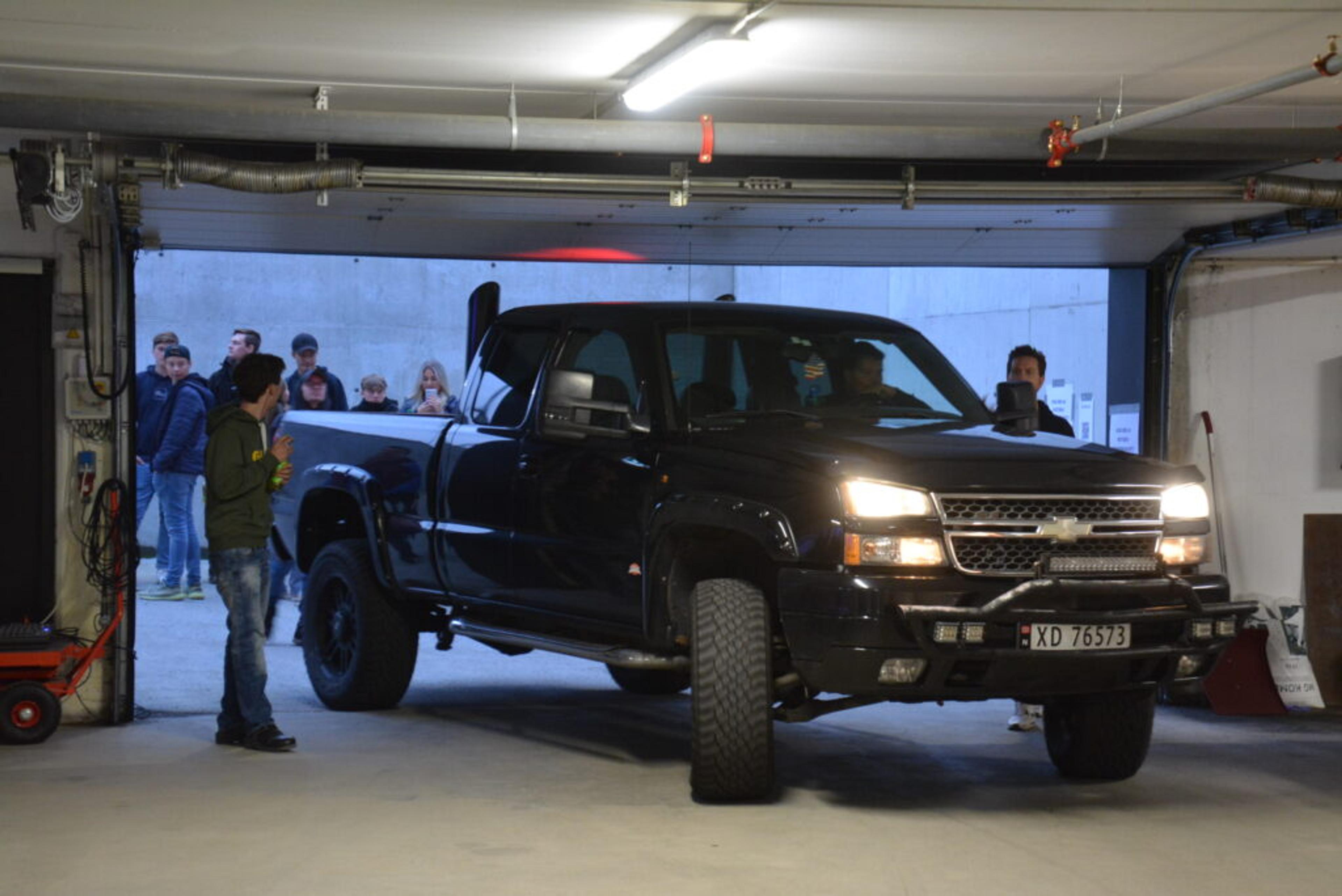 DIGER SAK: Det trengtes litt dirigering for å få losa denne digre Chevrolet-en inn i parkeringskjelleren. Foto: Stian Ormestad.