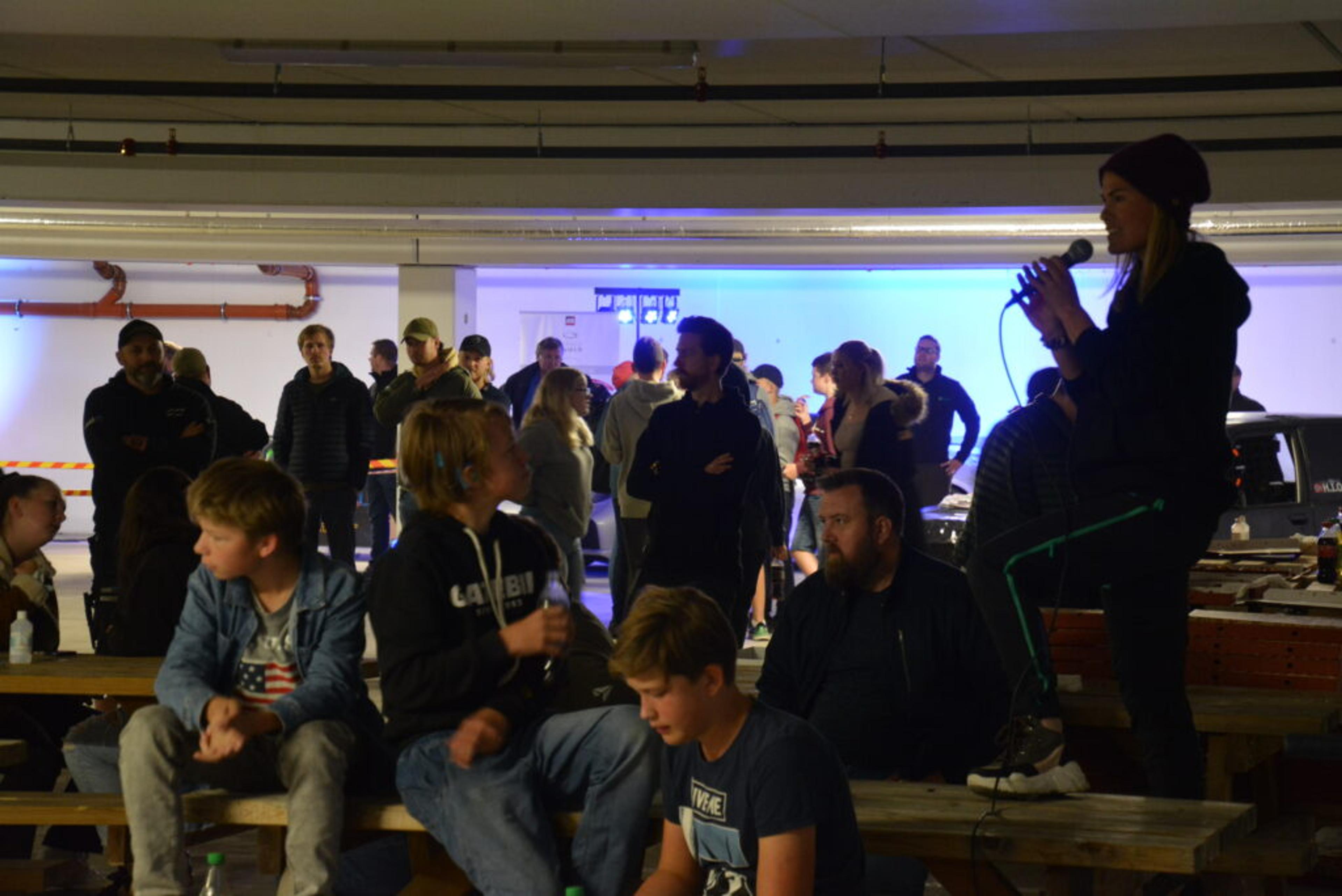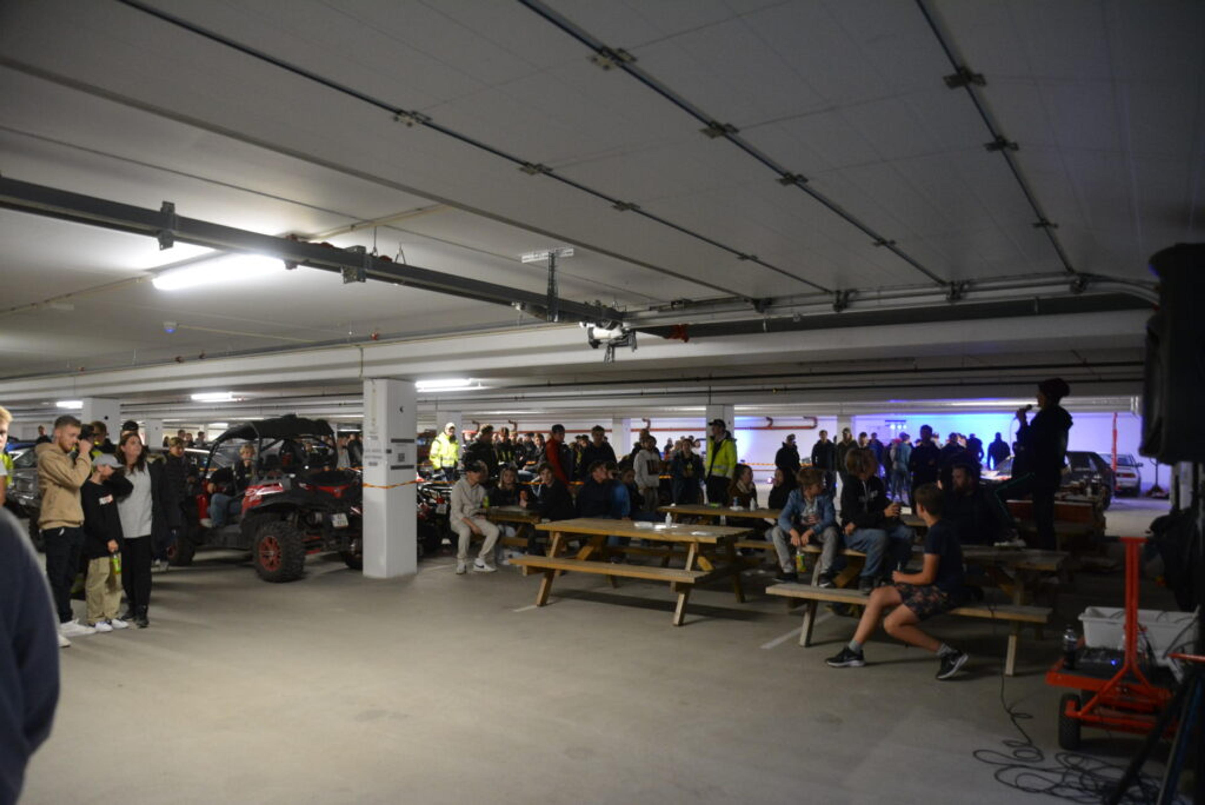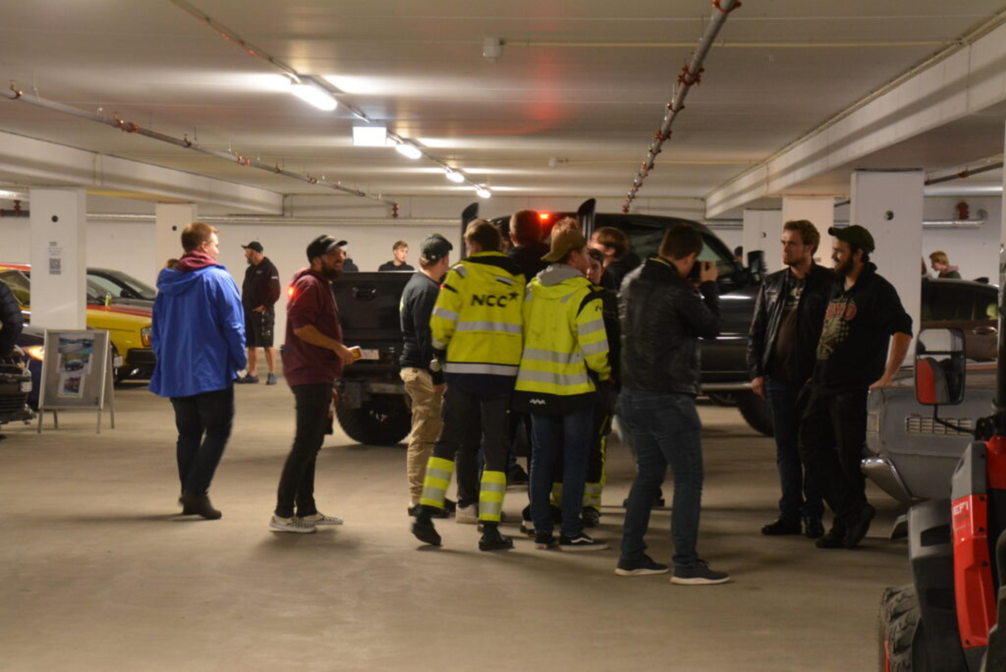 Egentlig skulle treffet være ute på parkeringsplassen ved ungdomsskolen, men siden været som var meldt var av det heller fuktige slagetble det hele flytta inn under tak, i parkeringskjelleren under Revetalhallen.