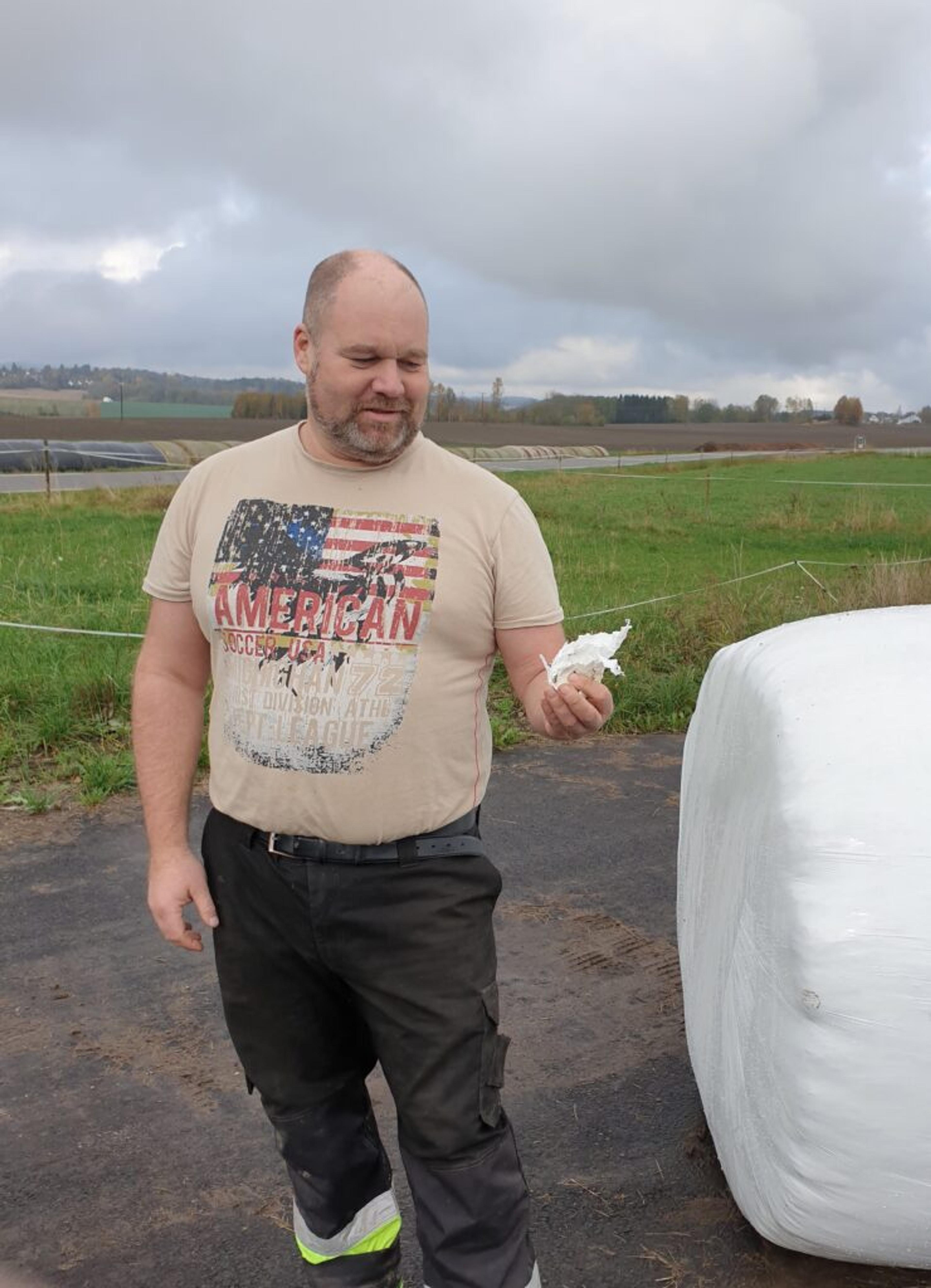 FORT GJORT: Små plastbiter kan løsne når store maskiner håndterer rundballer i plast, viser Harald Lie på Tufte gård fram. Foto: Tønsberg kommune.