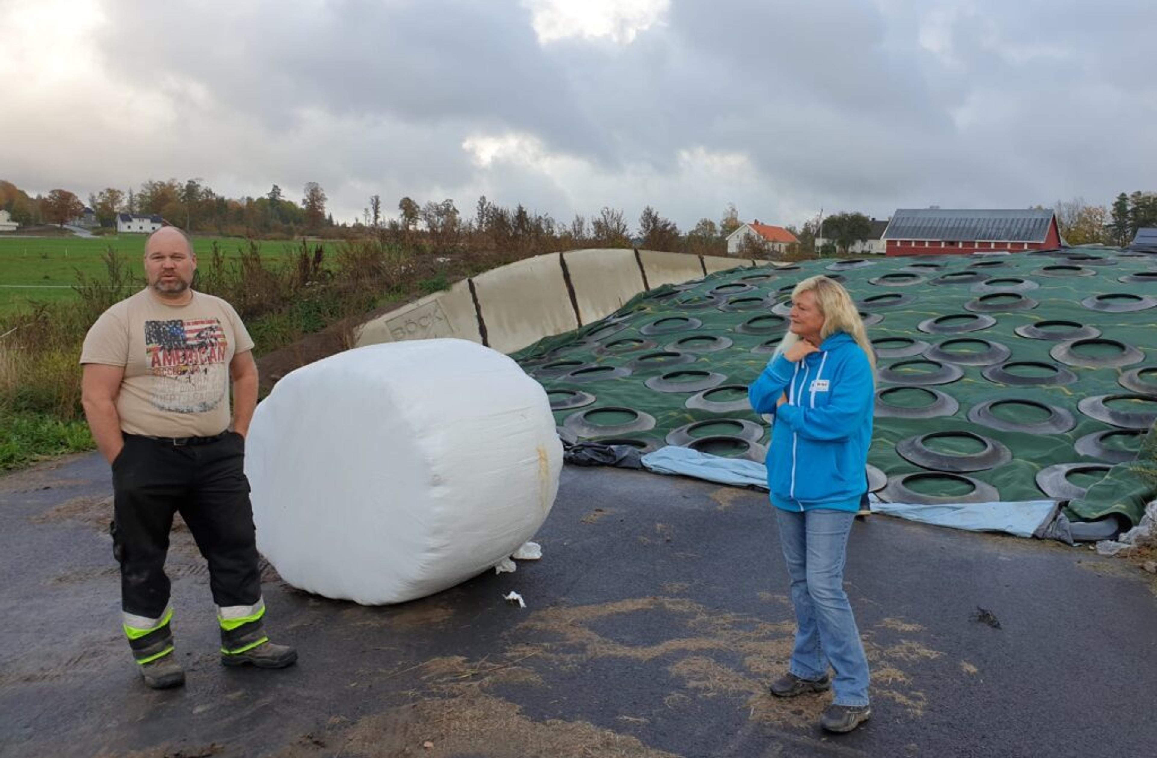 LUR LØSNING: Re-bonde Harald Lie viser ordfører Anne Rygh Pedersen plansiloen i bakgrunnen, som reduserer plastforbruket med tjuegangen. Foto: Tønsberg kommune.