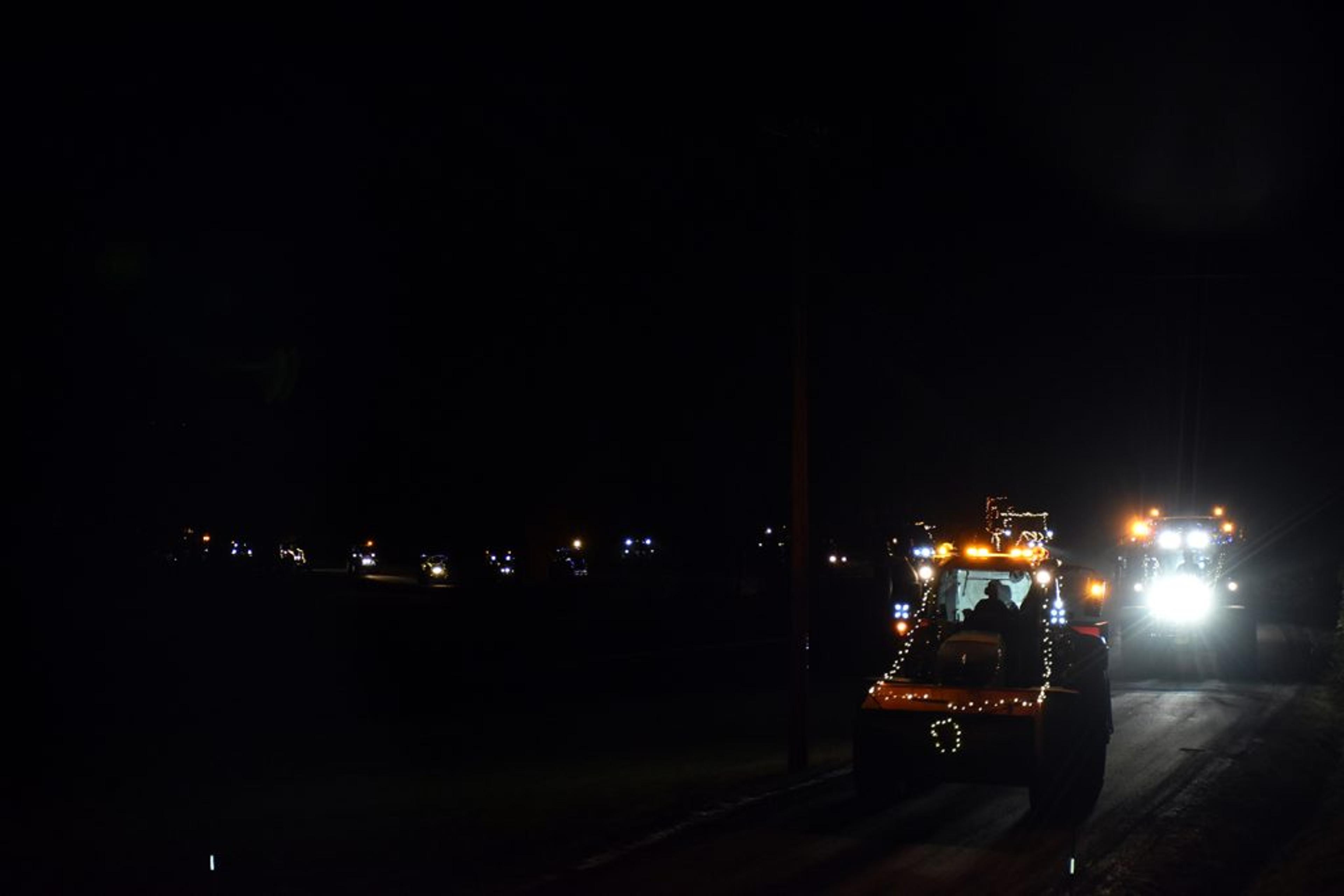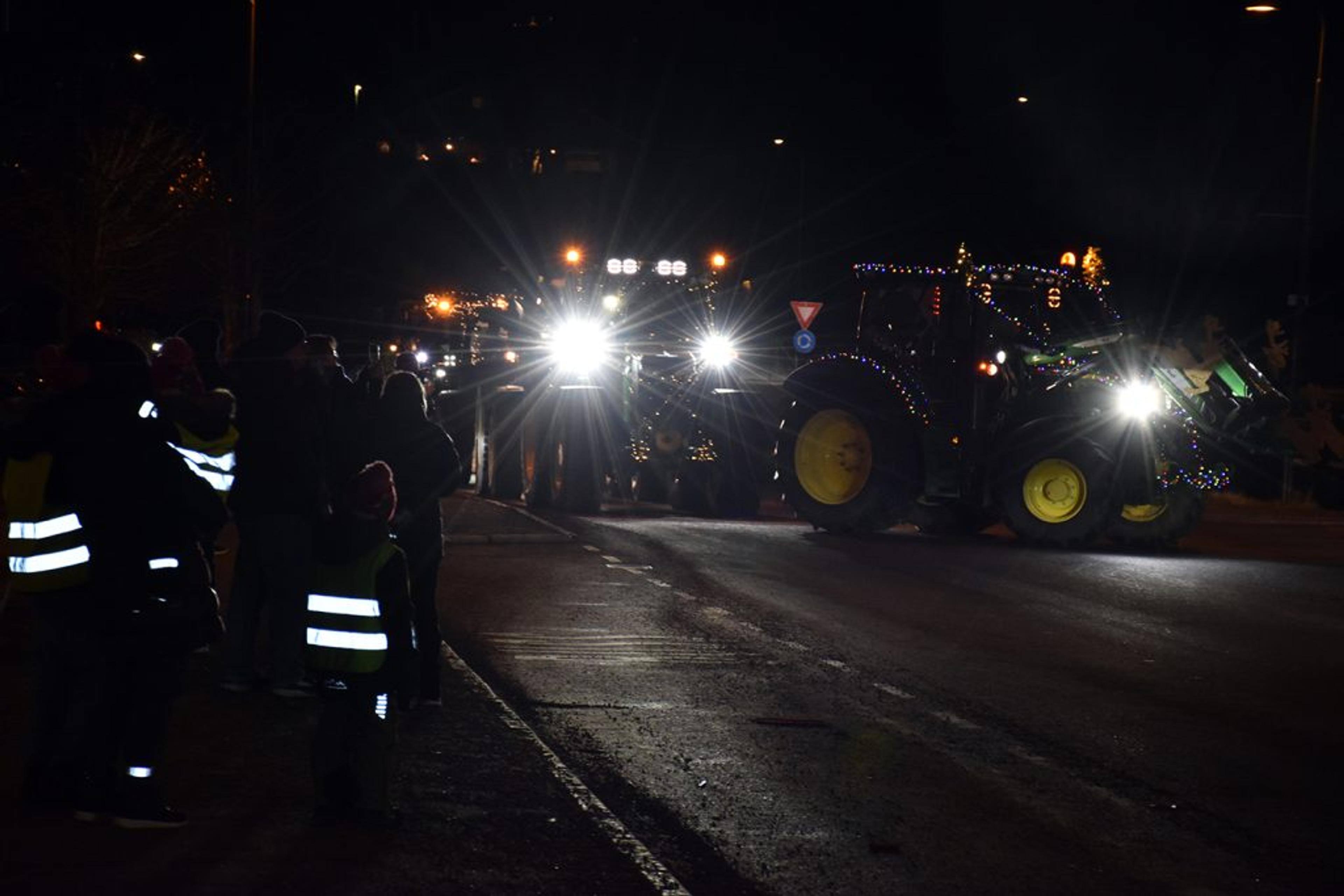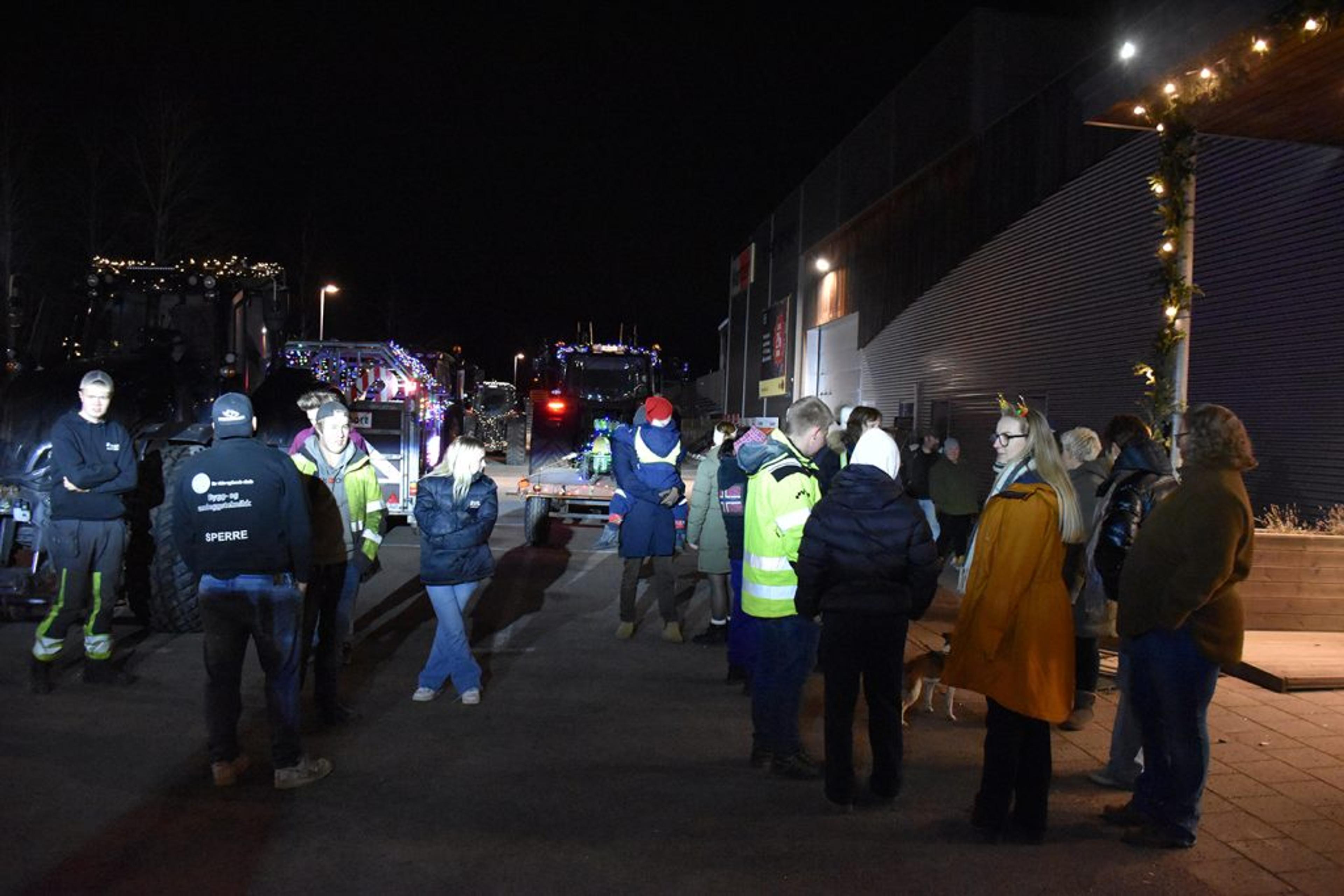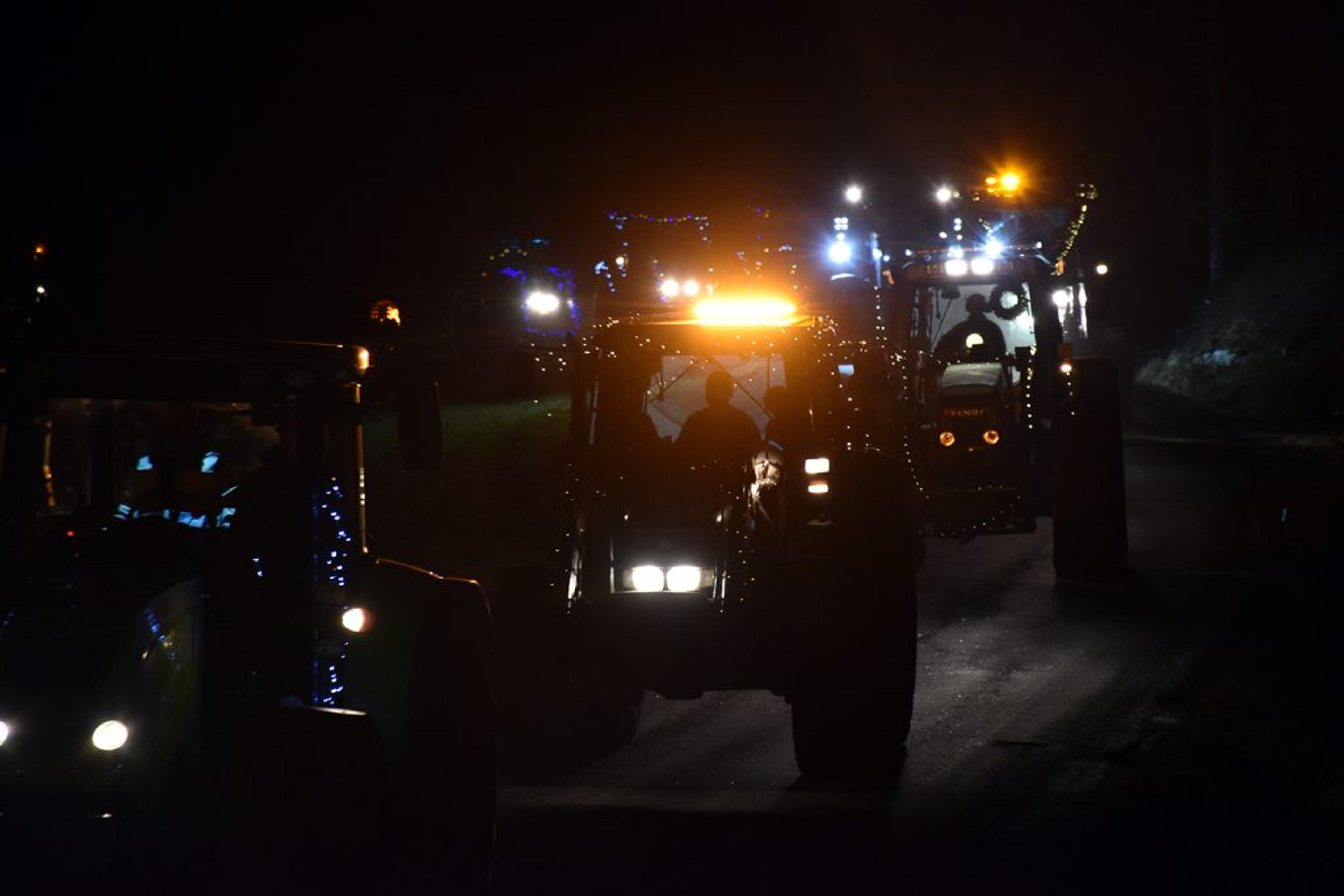 Trivelig å samles i mørket, det ble rett og slett et fantastisk flott skue å se så mange julepyntede traktorer i ei lang, lang rekke. Foto: Stian Ormestad, ReAvisa.