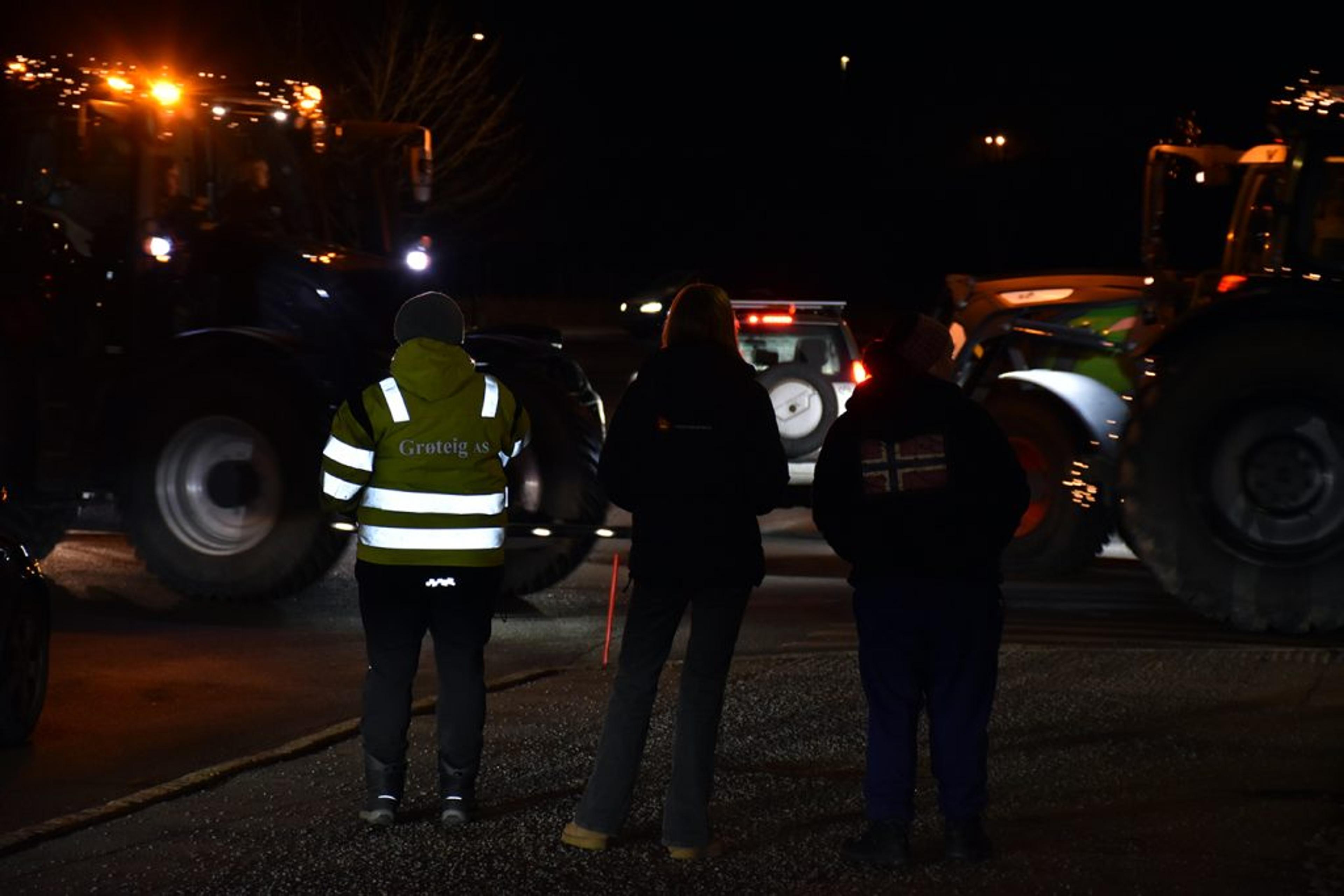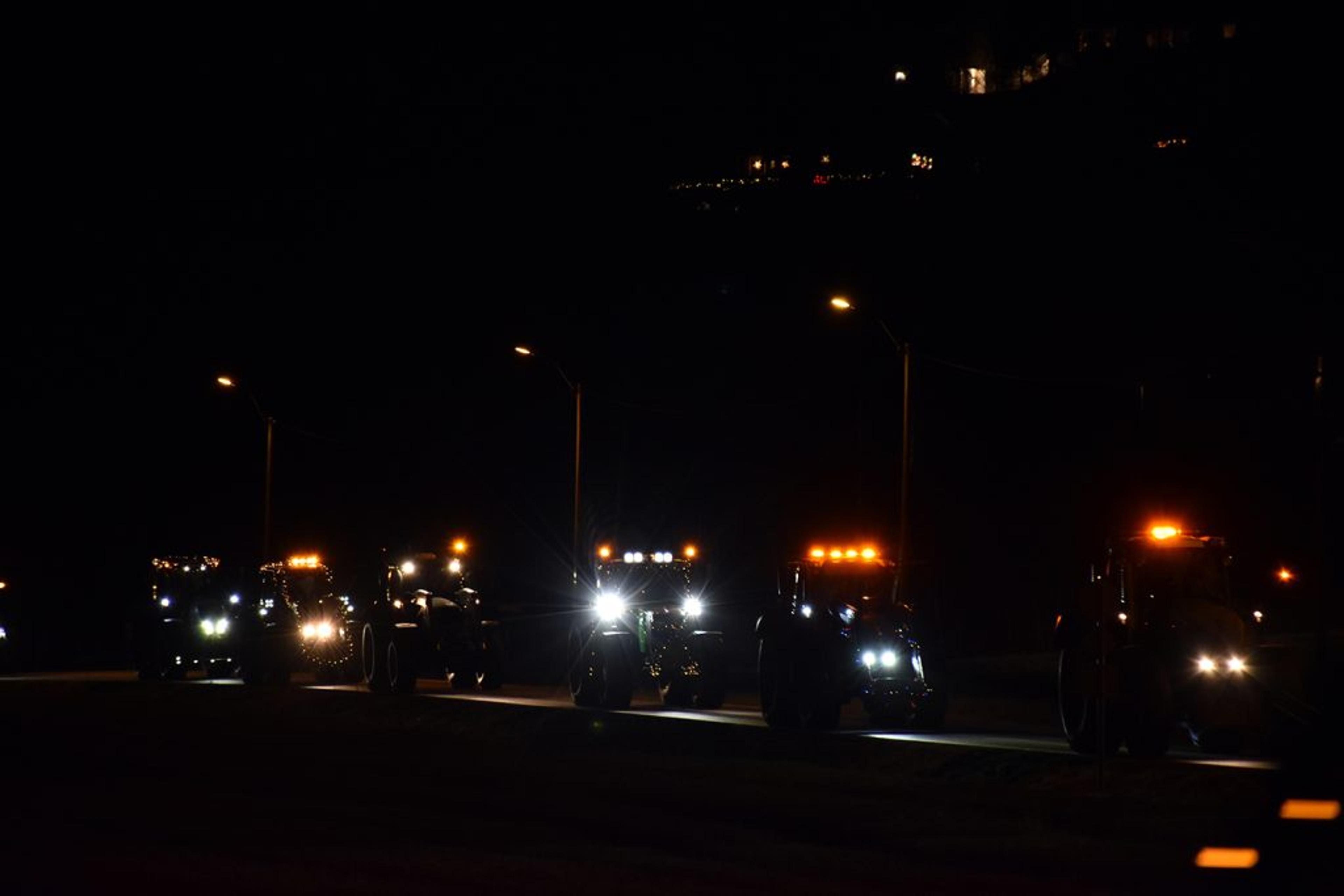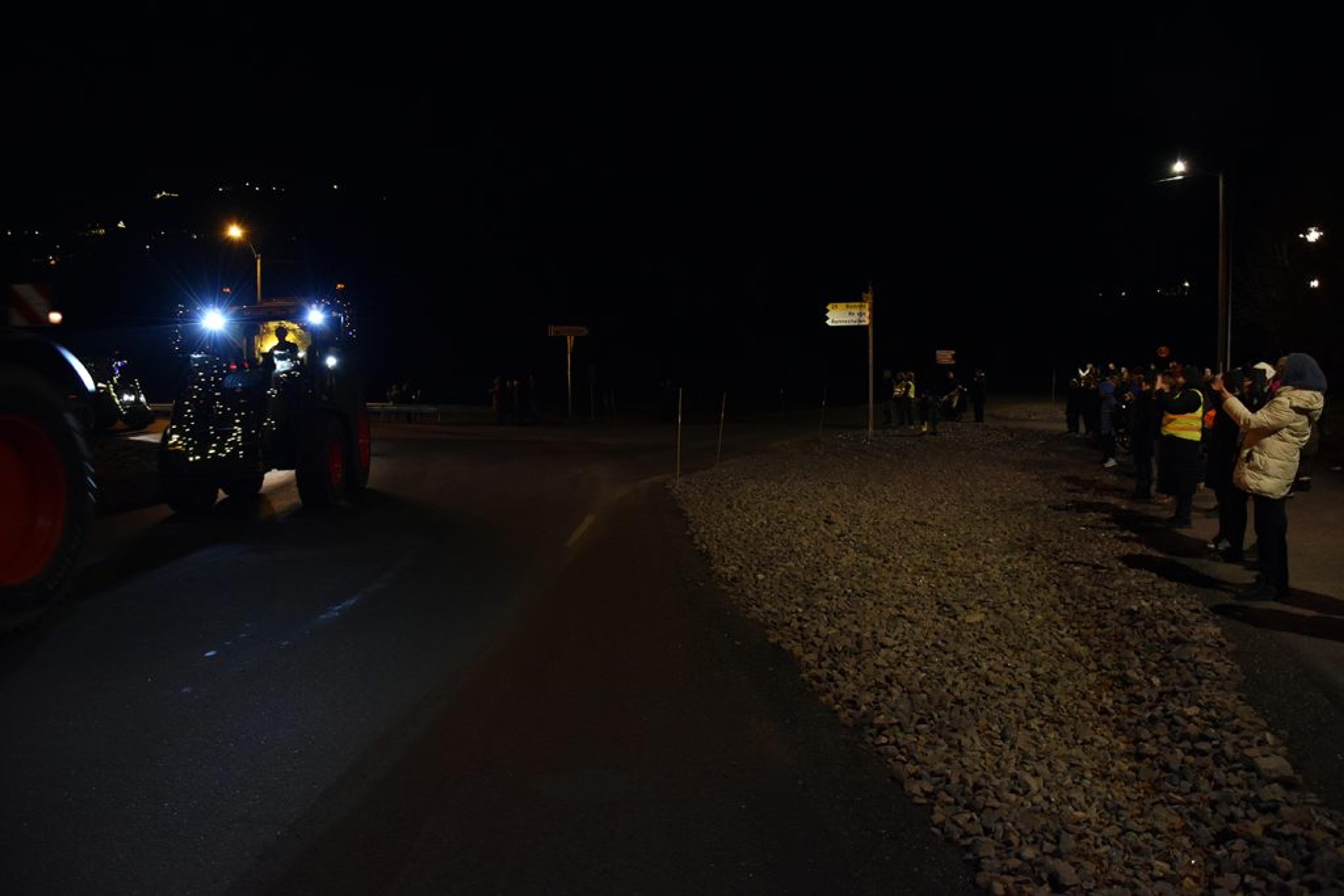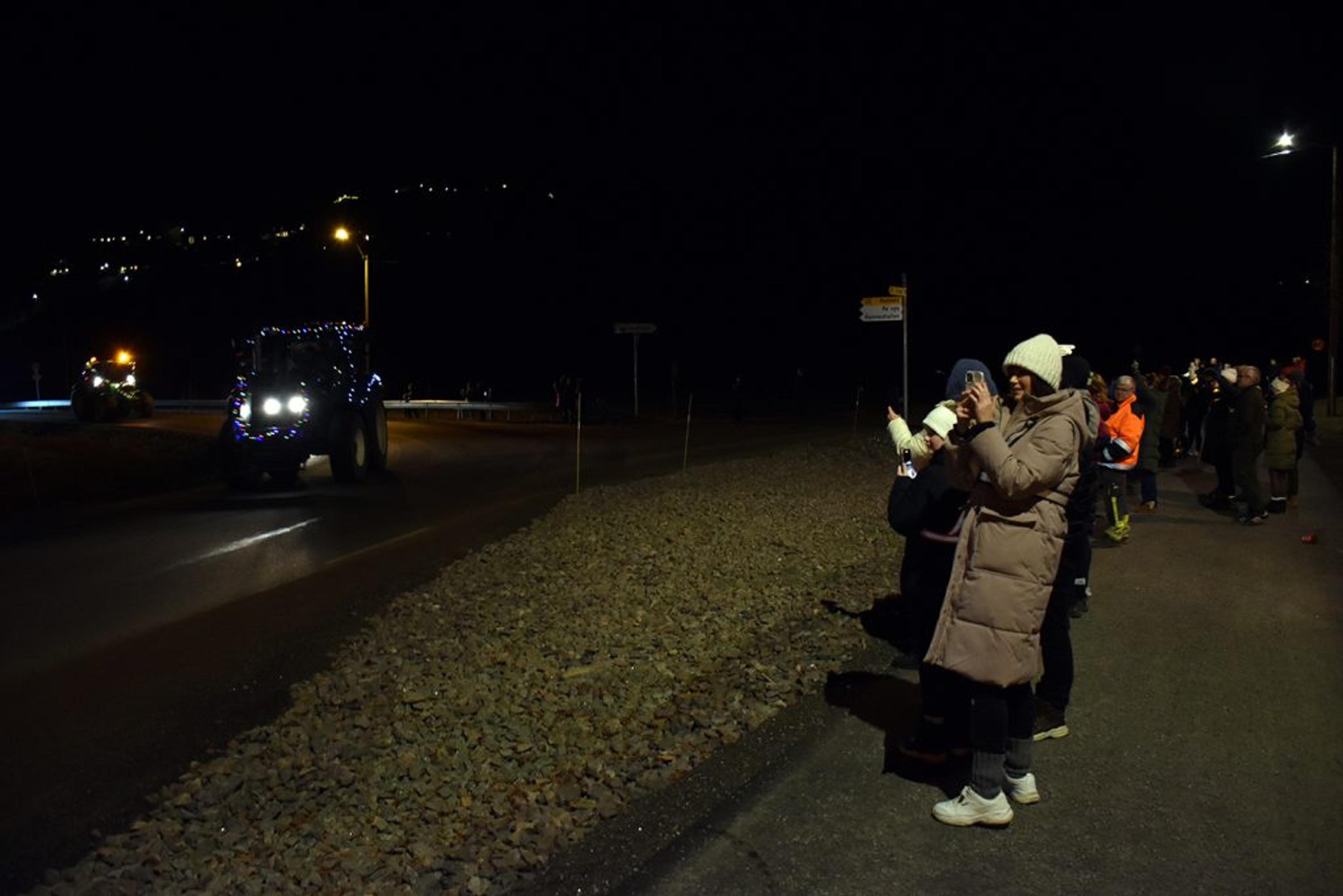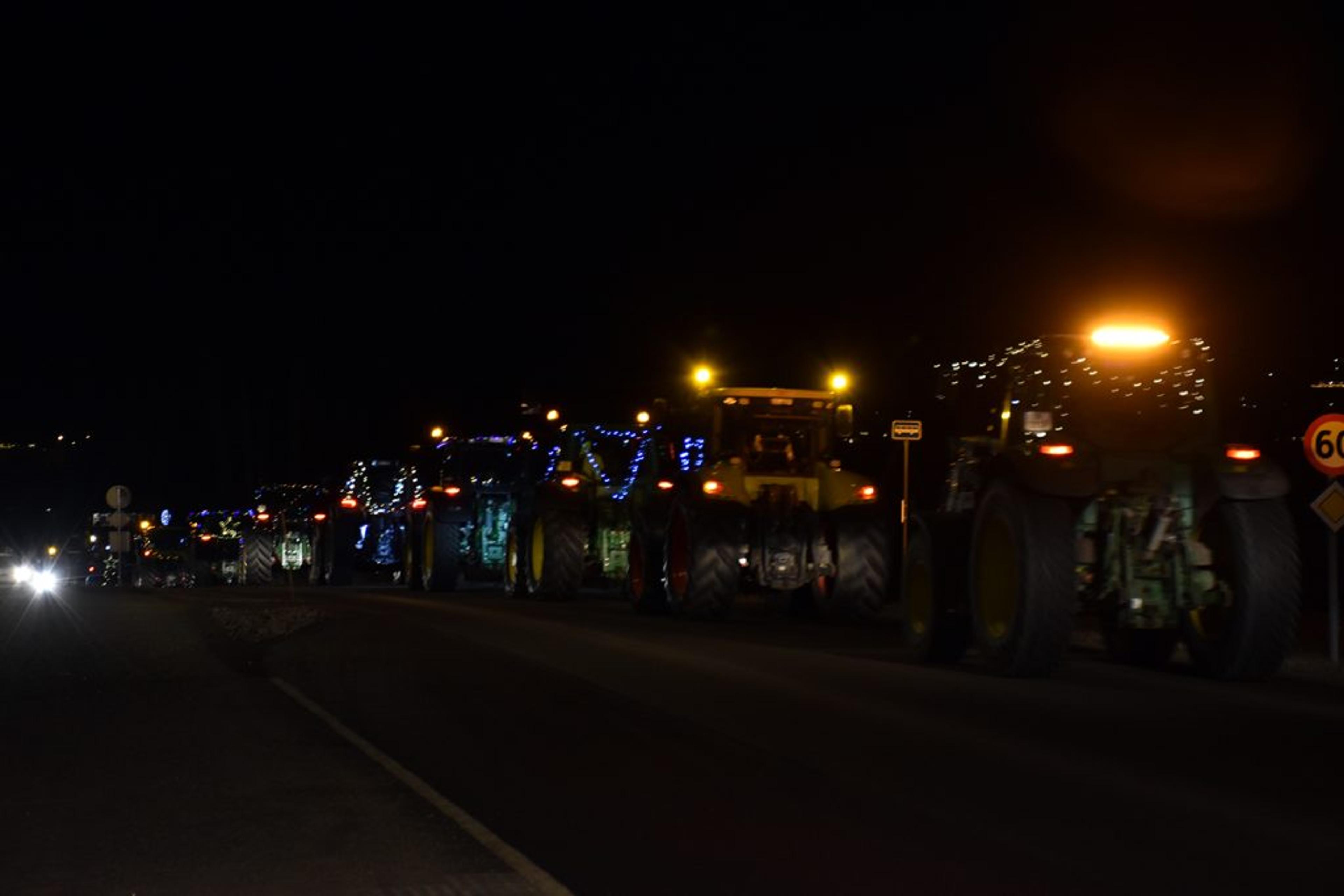 Trivelig å samles i mørket, det ble rett og slett et fantastisk flott skue å se så mange julepyntede traktorer i ei lang, lang rekke. Foto: Stian Ormestad, ReAvisa.