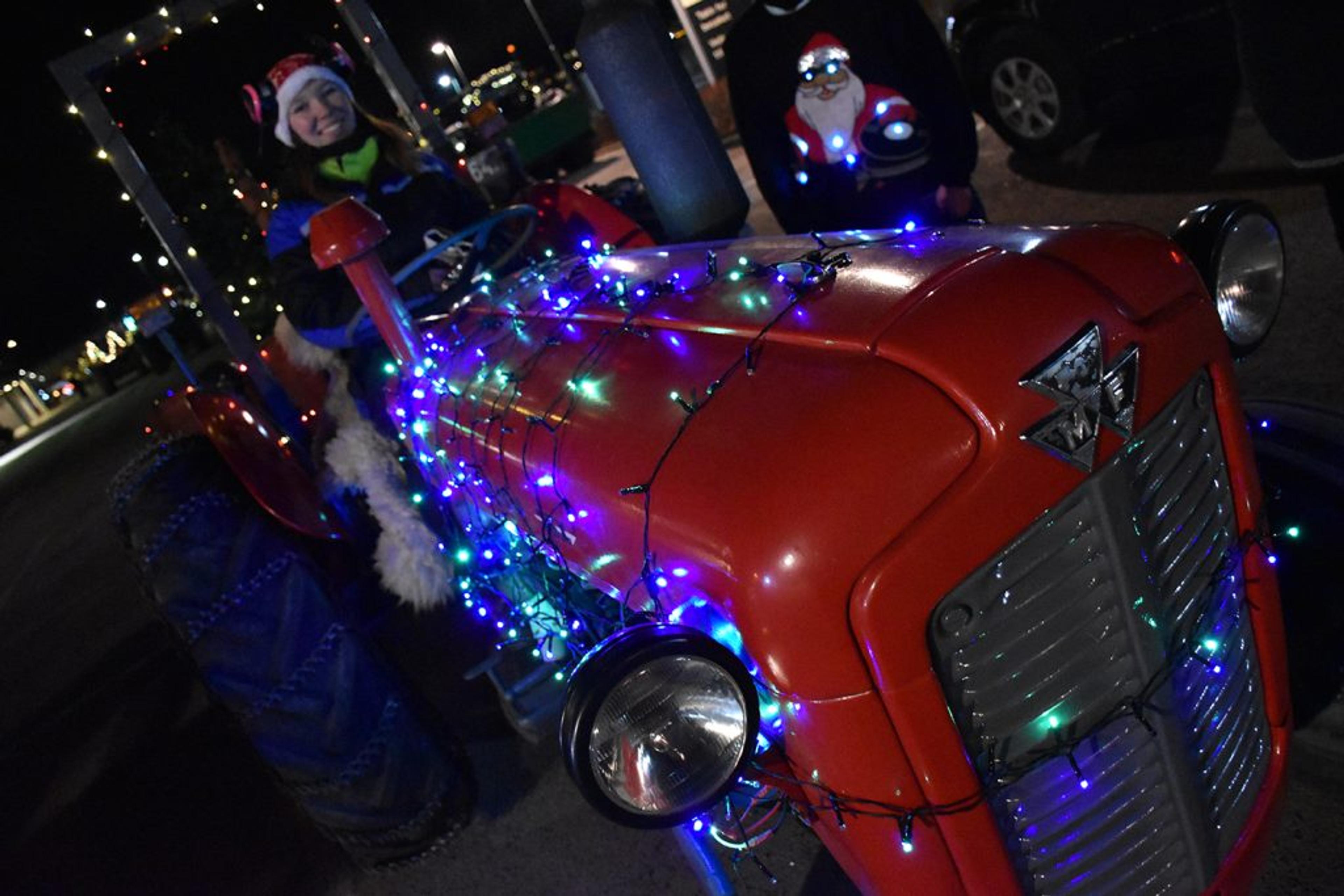 En liten leketraktor på hengeren bak en stor traktor. Selvfølgelig har leketraktoren også fått julelys. Foto: Stian Ormestad, ReAvisa.