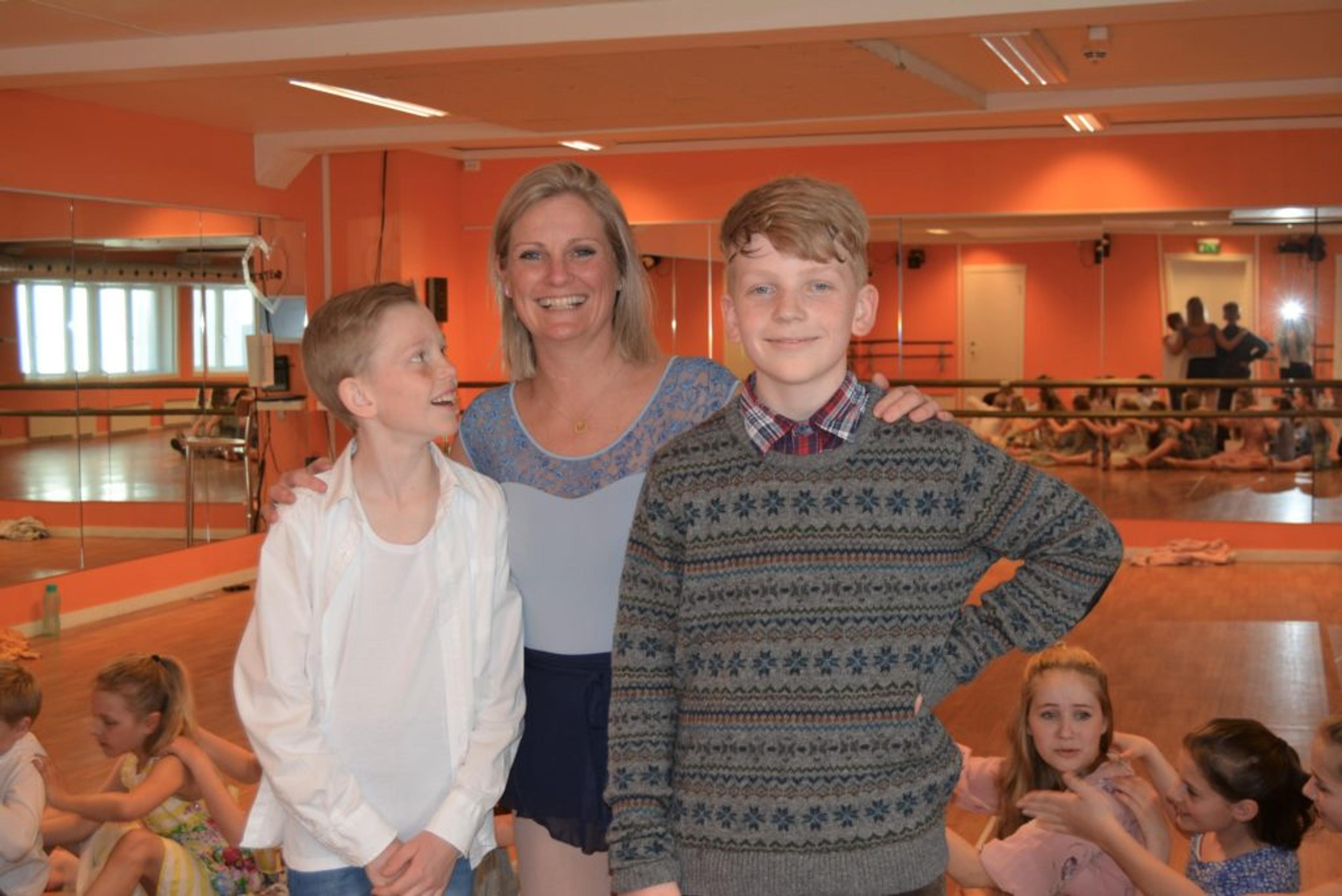 KLARE: Kasper Kalleberg (12) og Simon Sundby (13) er klare for danseforestilling, her sammen med Camilla Samuelsen Matre som starta danseskolen Extend for 18 år siden. Foto: Amalie Andersen.