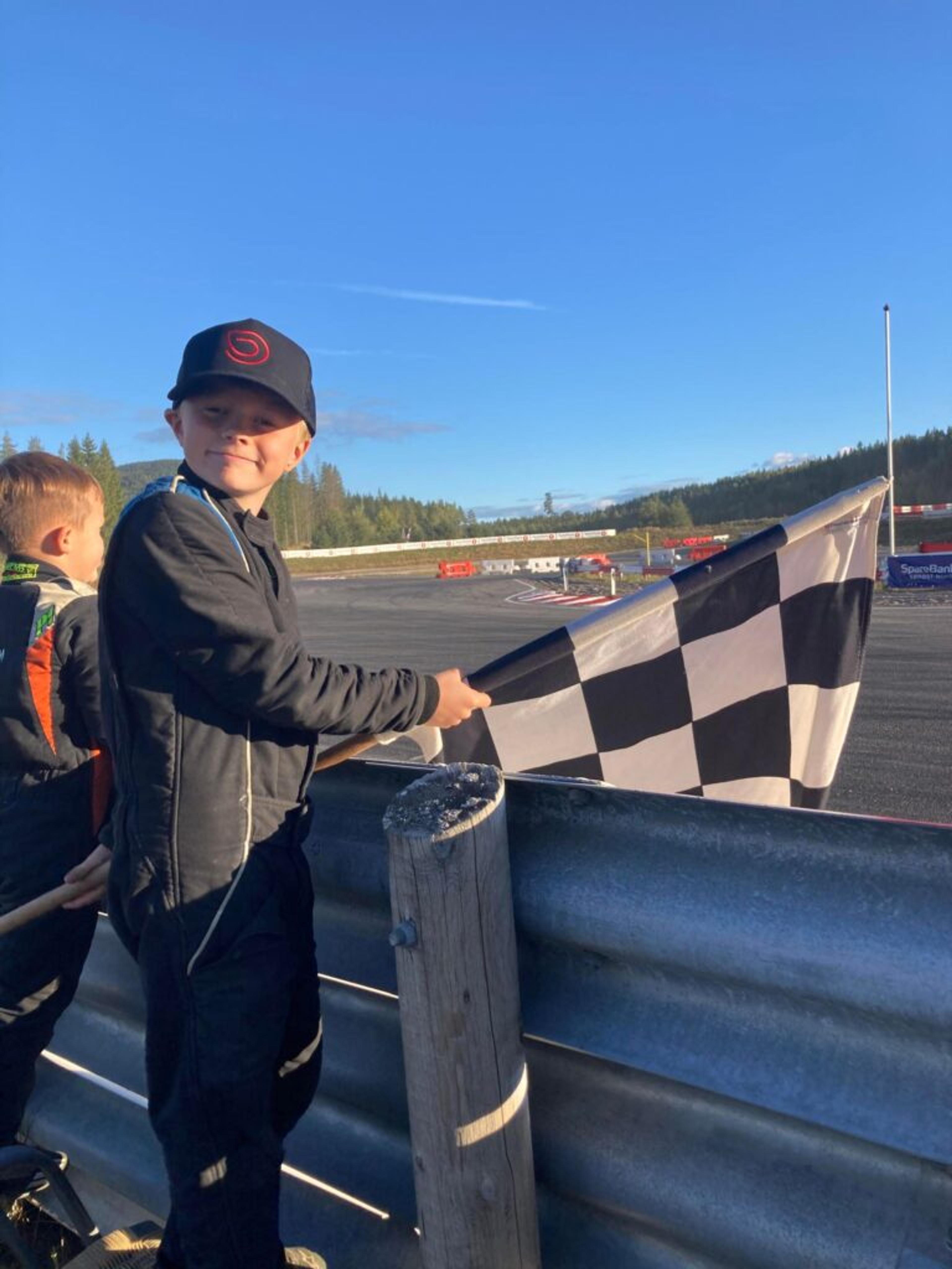 MÅLFLAGG-GUTT: Niklas B. Ormestad (9) er klar for å flagge crosskart-vennene sine i mål. Foto: Privat.