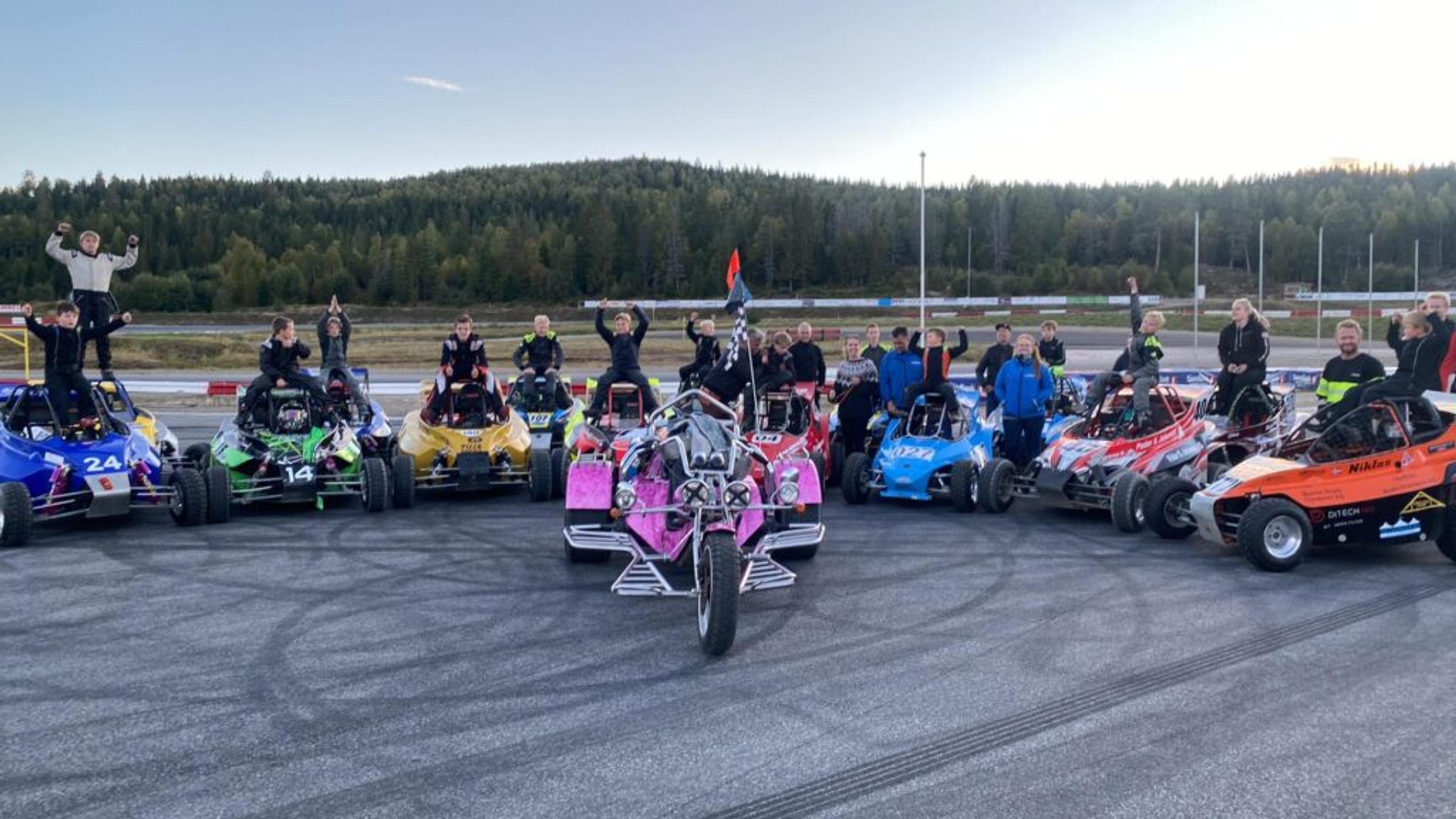 NRK SUPER-SERIE: Denne høsten viser NRK Super Maks gass, der vi blir kjent med flere forskjellige motorsportgrener for barn. To Re-gutter var med på innspillingen, de står lengst til høyre på bildet, Niklas B. Ormestad (9) i oransje kart og Peder K. Johansen (10) i rød kart. Foto: Privat.