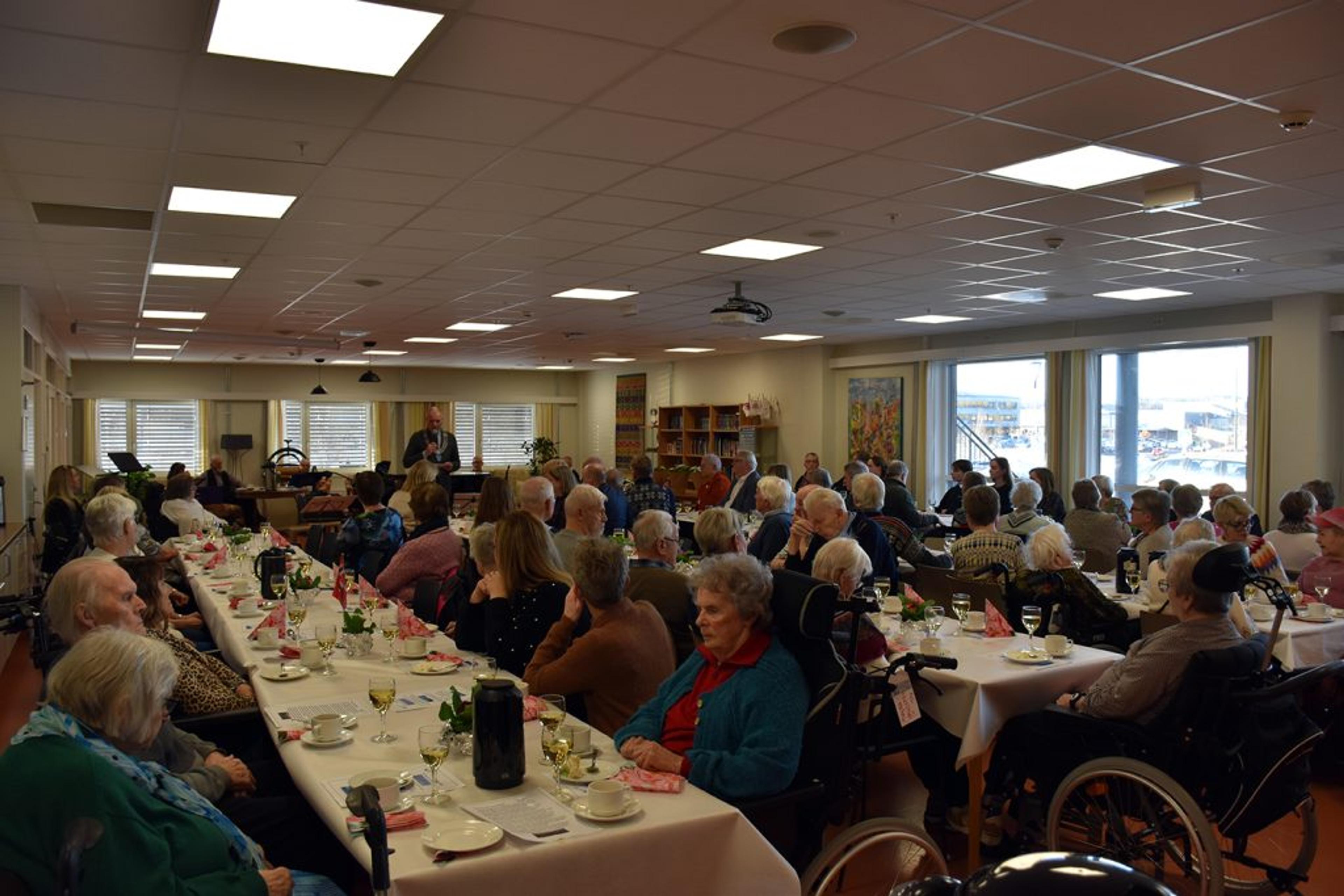 Fulltegnet bursdagsfest, da det var åpen fest for beboere og bygdefolket tirsdag 11. februar 2025. Hele denne uka er det bursdagsfeiring, fra mandag til fredag, med egne arrangement for både beboere og ansatte. Foto: Stian Ormestad, ReAvisa.