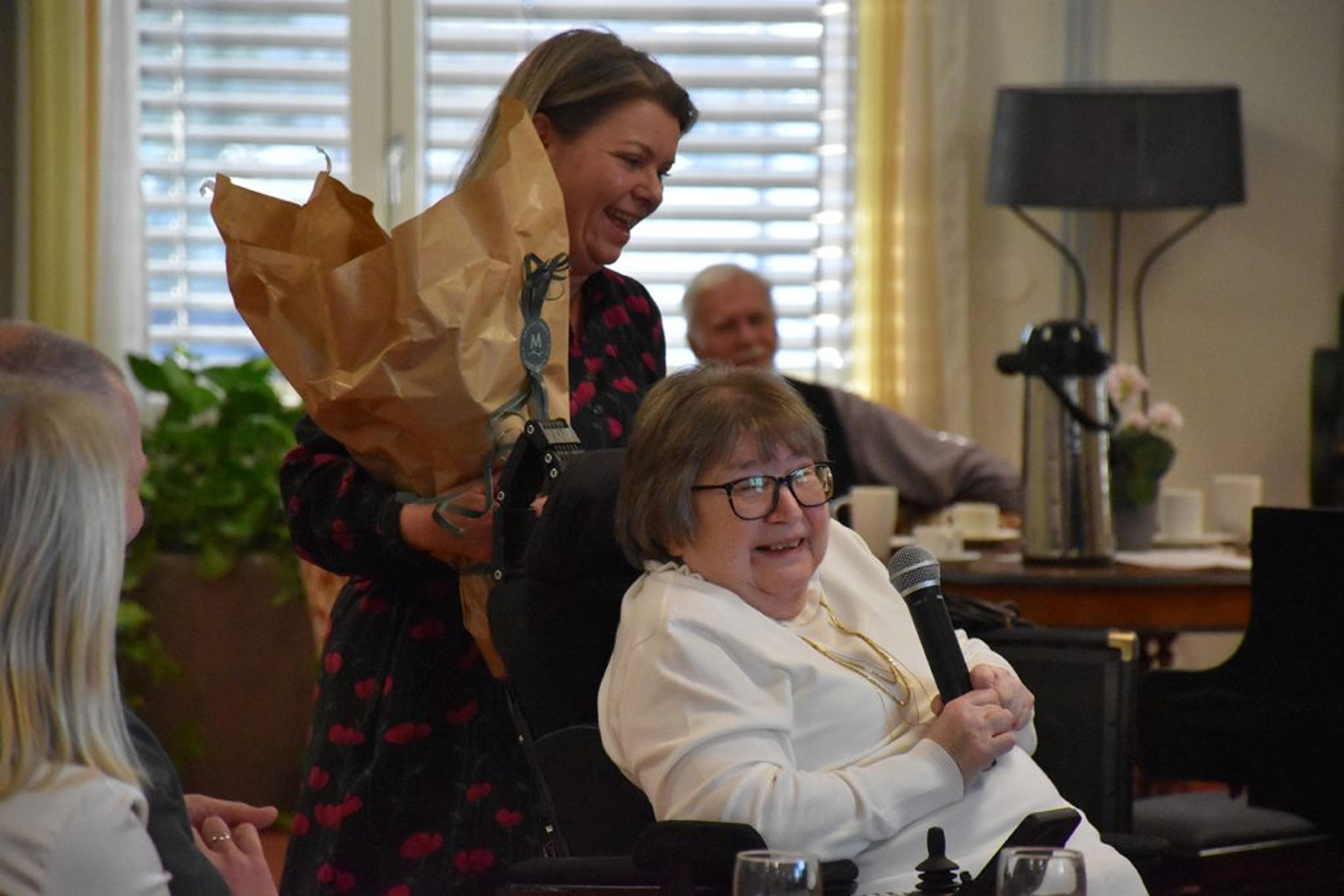 Elsa Andersen skryter av hvor godt de har det på Re helsehus, de som bor her. Og overrekker en blomst fra beboerne til virksomhetsleder Ingunn Finsveen. Foto: Stian Ormestad, ReAvisa.