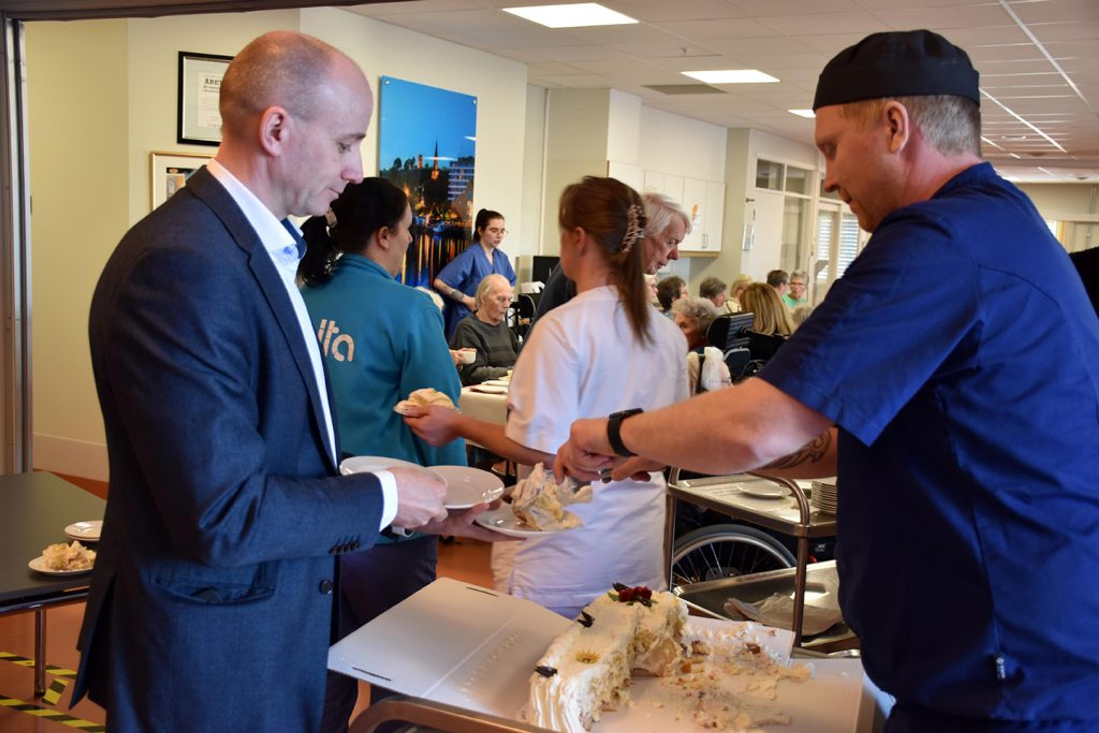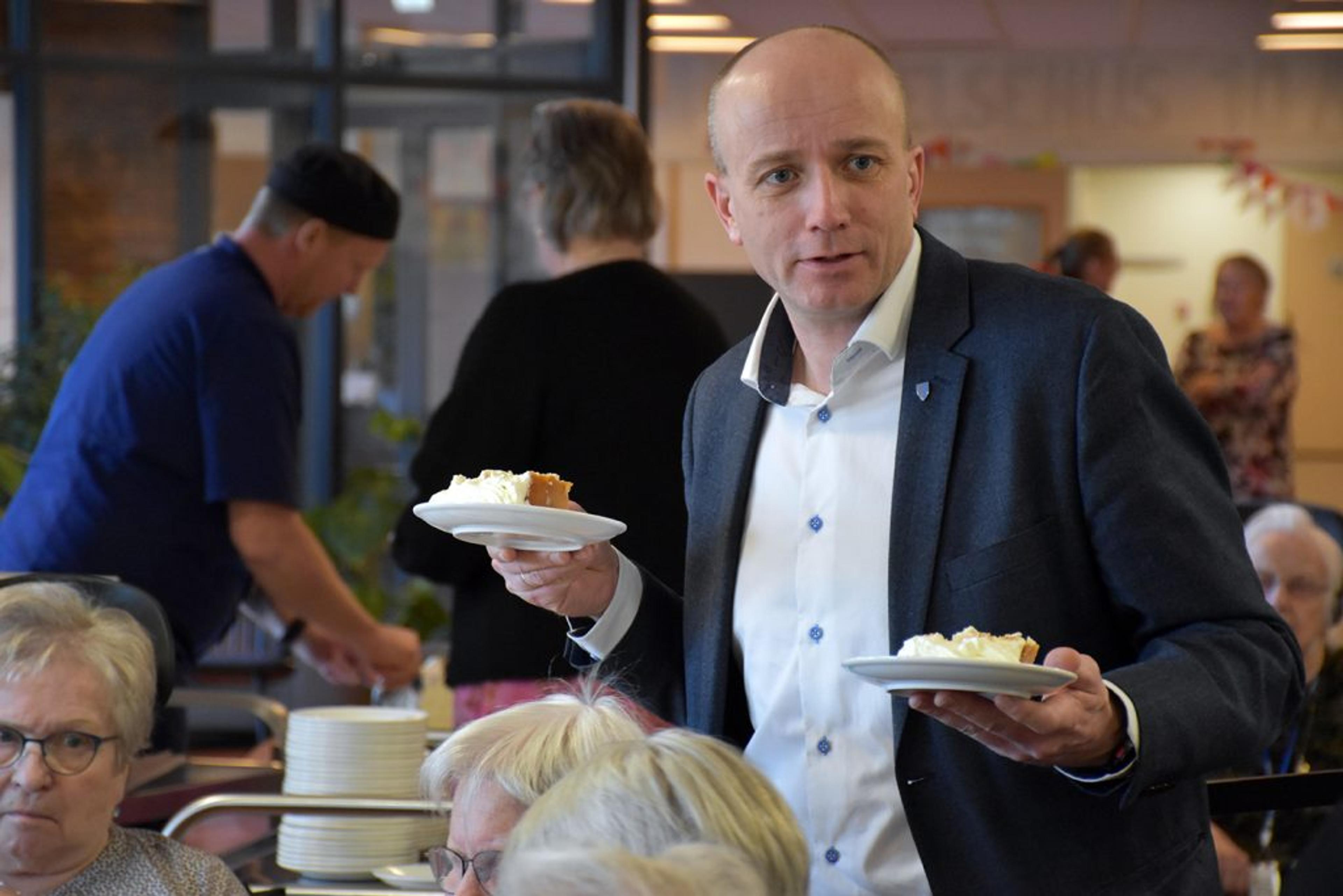 Kommunalsjef med helse og omsorg som sitt domene, Frode Hestnes, serverer kake. Foto: Stian Ormestad, ReAvisa.